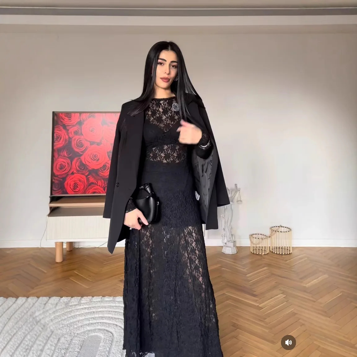 Designed with a matching sheer lace floor-length skirt, this set brings a graceful, dramatic flair. The skirt’s flowing cut complements the fitted top, creating a balanced silhouette that feels both glamorous and effortless.
