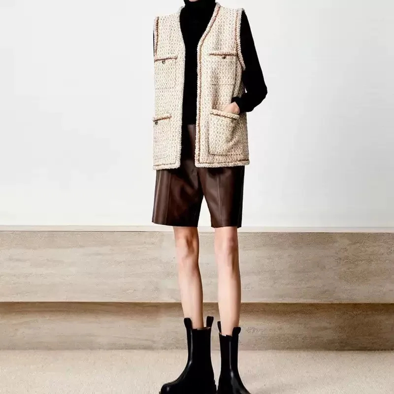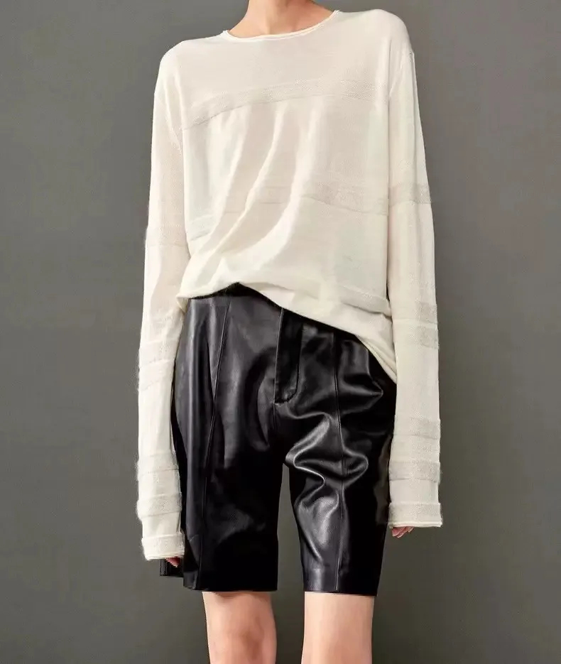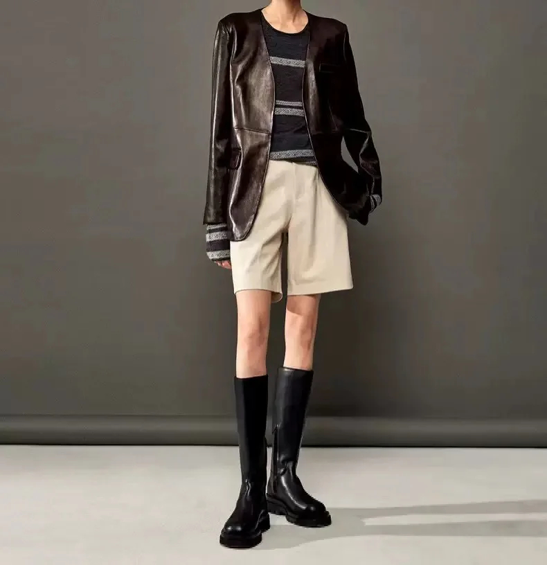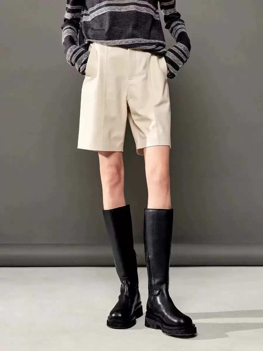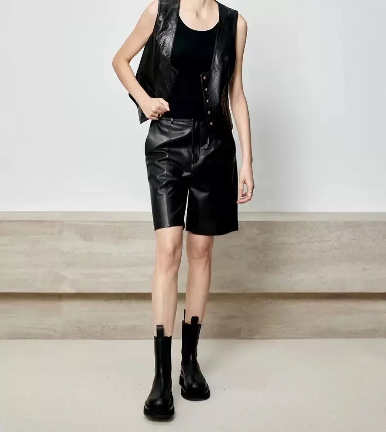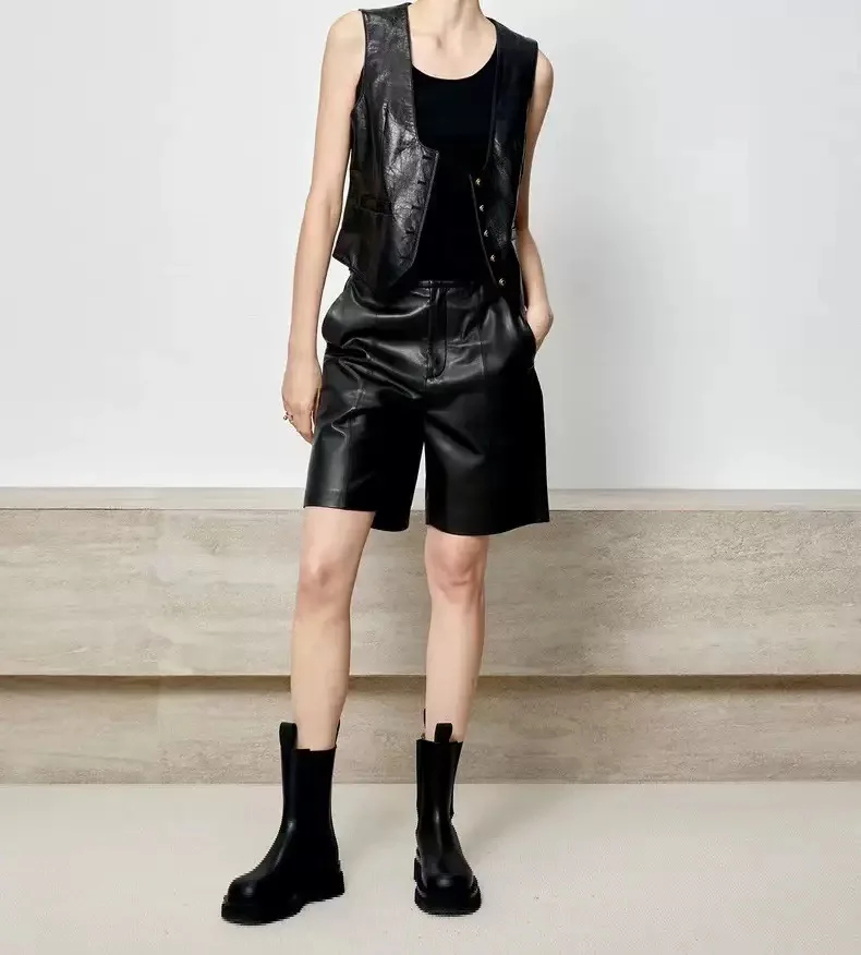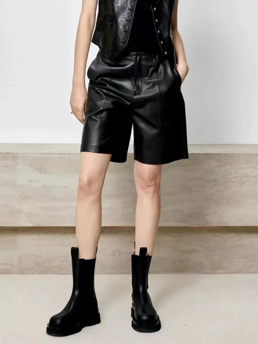 2025 Spring European/America Style Women's Genuine Leather Shorts Female Handsome Straight High Waist Suit Shorts Casual Wide