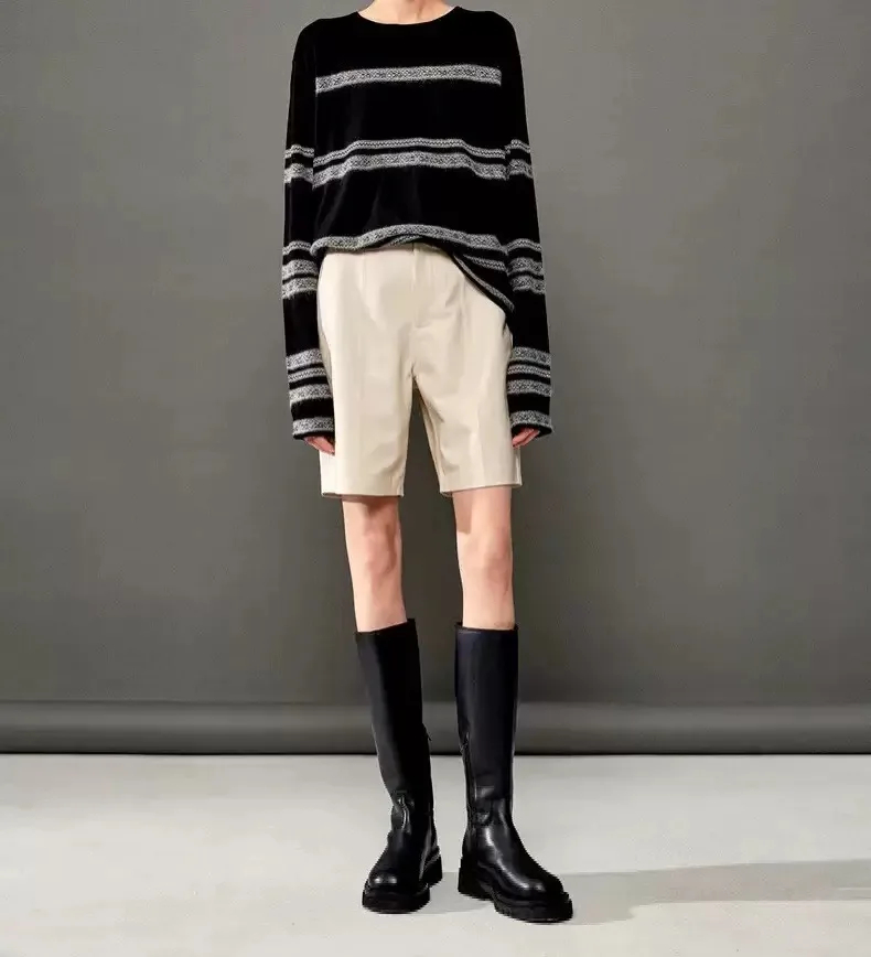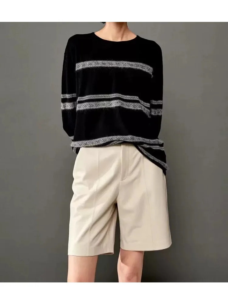 Description: This women’s striped sweater is a versatile addition to your wardrobe. Made of cozy knit fabric, it ensures warmth and comfort in autumn and winter. The classic stripe pattern adds a fashionable, timeless touch, while the relaxed fit flatters your figure. Suitable for daily wear, casual outings, or layered styles, pair it with shorts, jeans, or skirts to create looks that fit different occasions. Stay cozy and fashionable with this trendy piece.