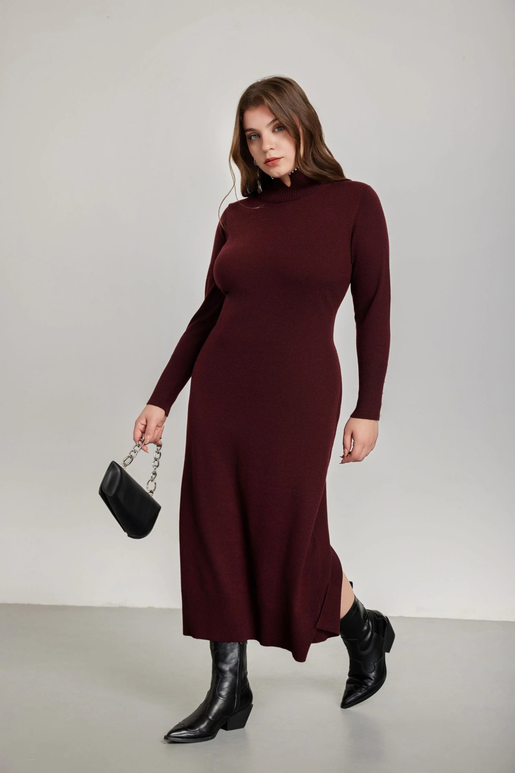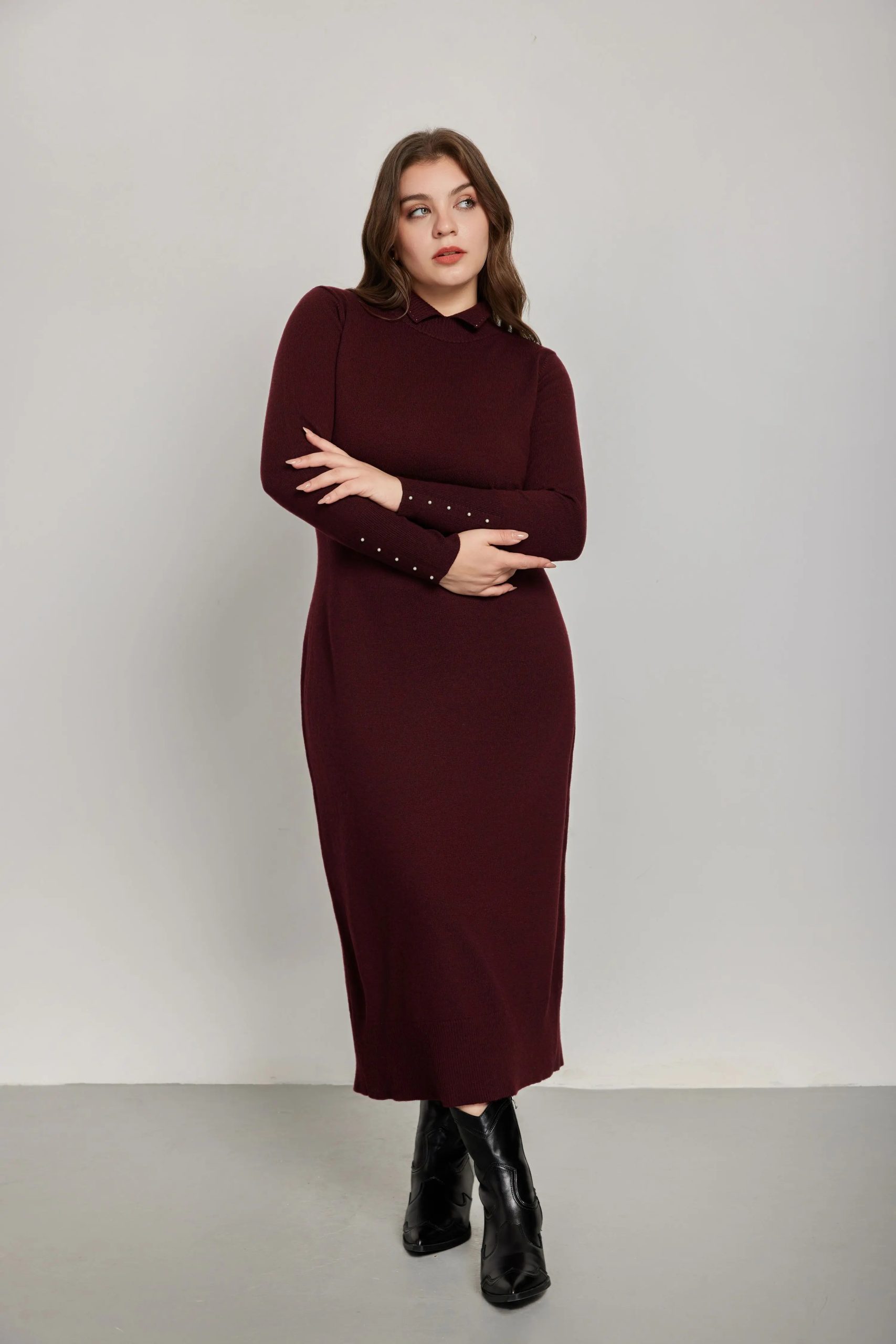 2026 Autumn Women's Soft Burgundy Knit Curvy Breathable Knee-Length Natural Waist Dress Simple Sheath Silhouette Back Slit ODM