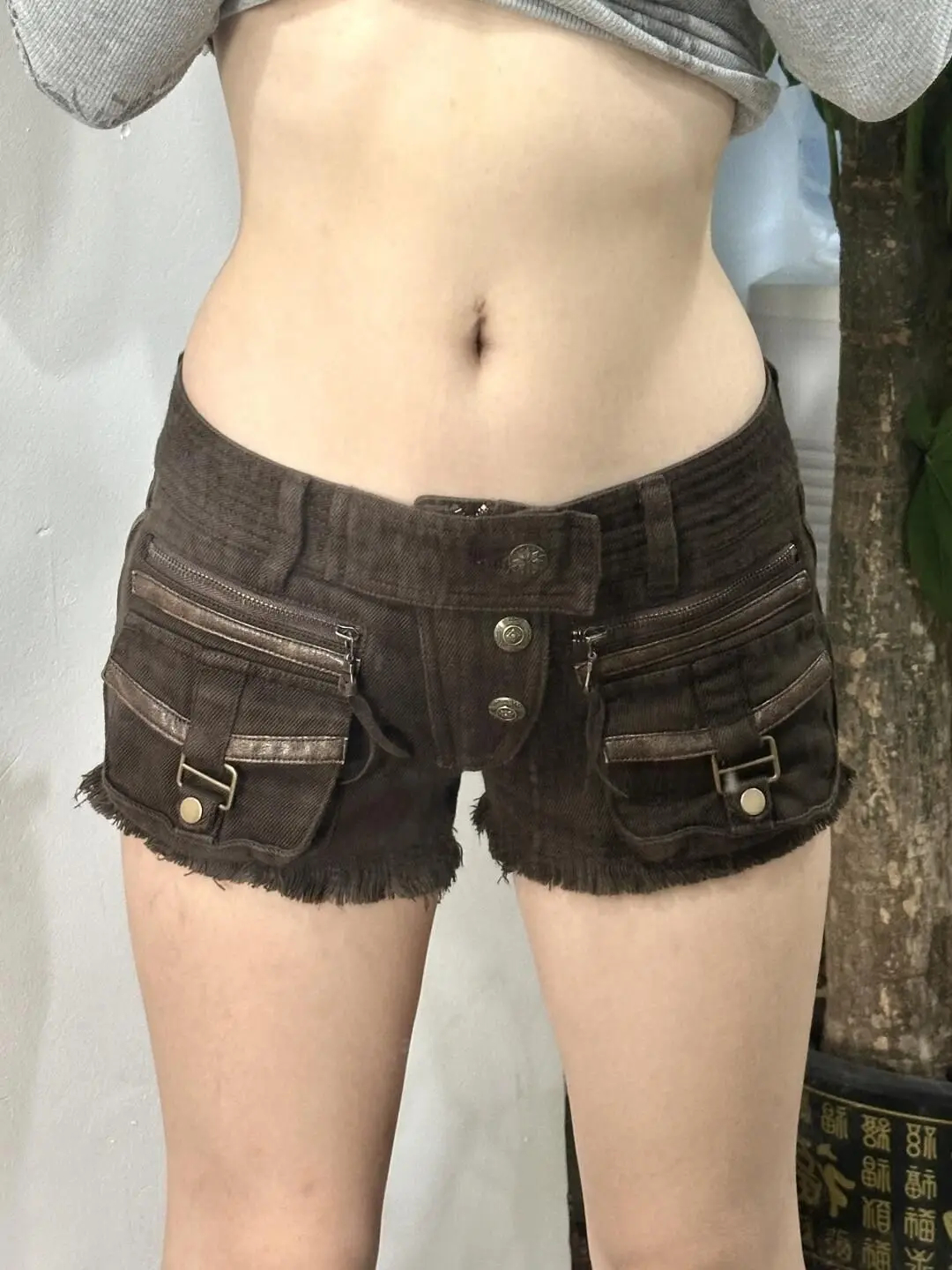 Description: This women’s shorts is a bold addition to your wardrobe. Made of soft and edgy denim fabric, it offers both style and comfort for casual or streetwear occasions. The unique zippers and metal buckles add an avant-garde touch, and the multi-pocket design brings both trendiness and practicality. The low-rise fit with frayed hems flatters your figure, making it suitable for daily wear, concerts, or urban street style. Pair it with different tops and accessories for a chic look that can be adapted to various occasions. Stay confident and fashionable with this trendy shorts.