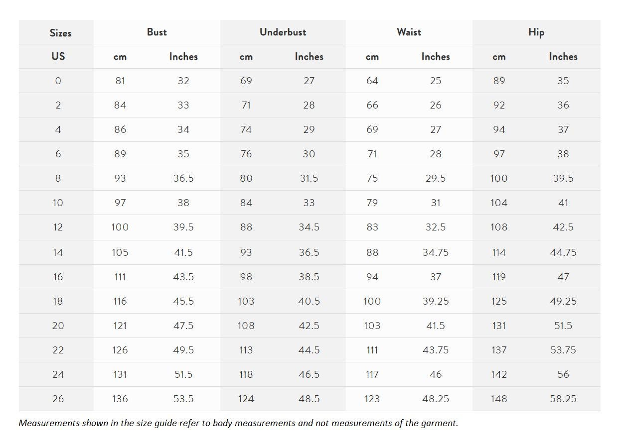 | Size | 0 US women's numeric, 2 US women's numeric, 4 US women's numeric, 6 US women's numeric, 8 US women's numeric, 10 US women's numeric, 12 US women's numeric, 14 US women's numeric, 16 US women's numeric, 18 US women's numeric, 20 US women's numeric, 22 US women's numeric, 24 US women's numeric, 26 US women's numeric, Custom Size US women's numeric |