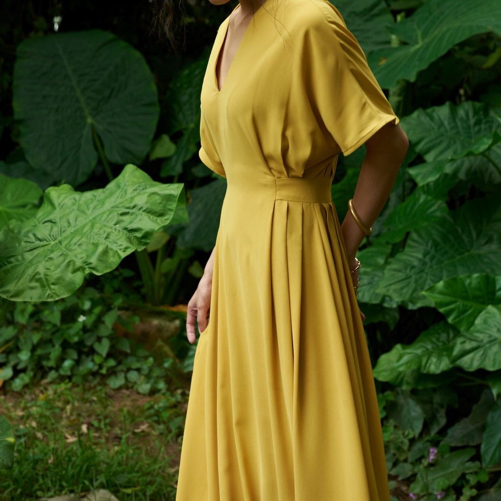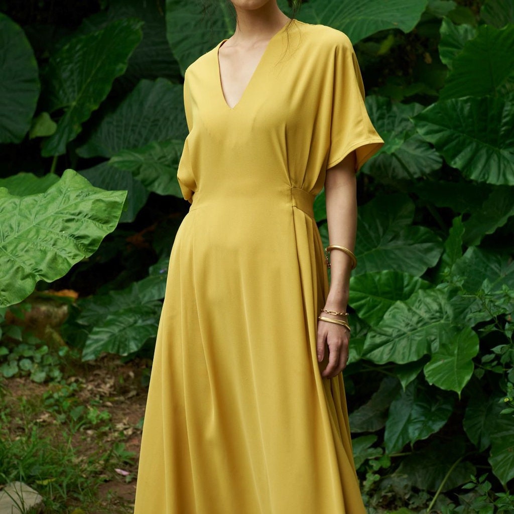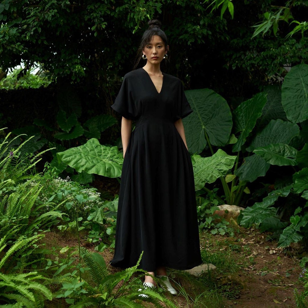 Featuring a sleek V-neckline and flowy batwing sleeves, this dress adds a modern, elegant flair to your look. The V-neck accentuates your silhouette subtly, while the loose sleeves provide effortless comfort and a chic, laid-back vibe.