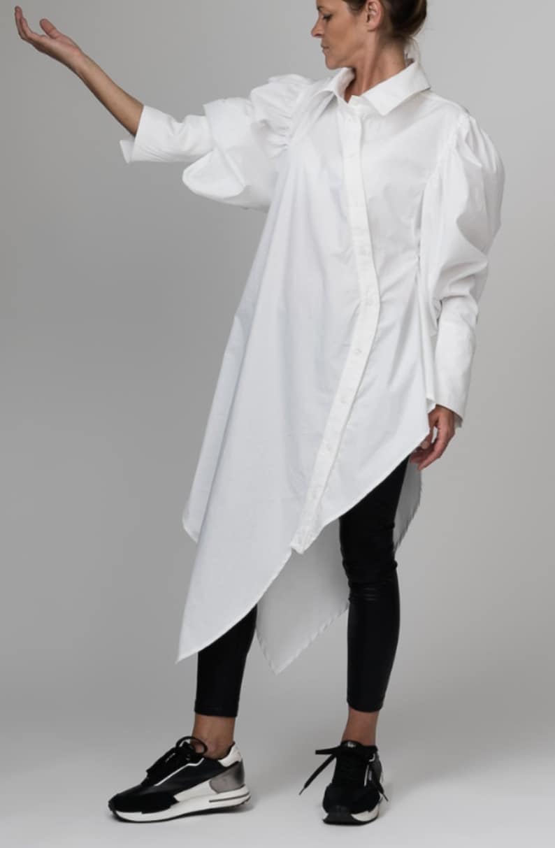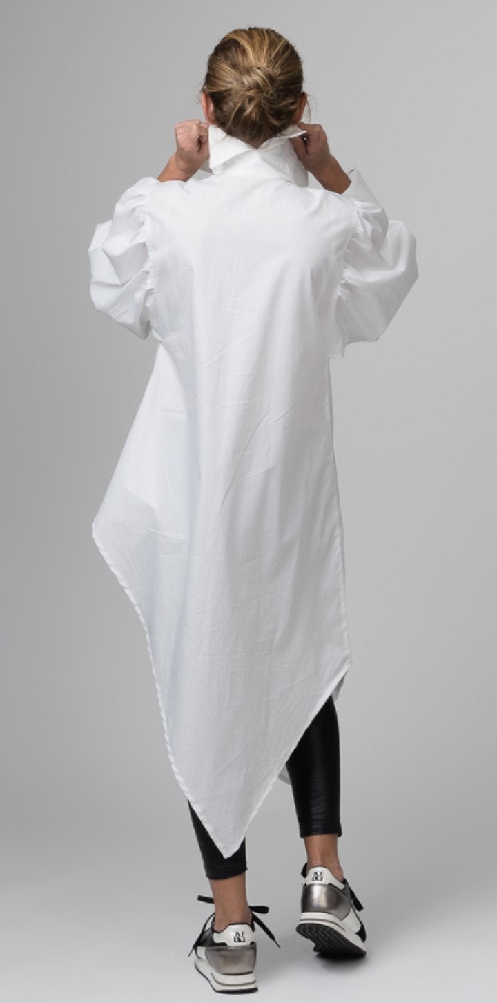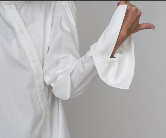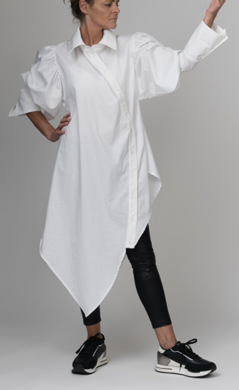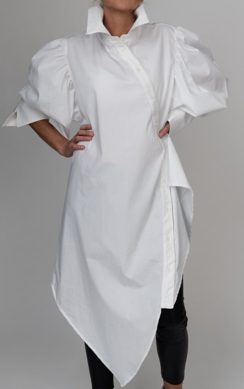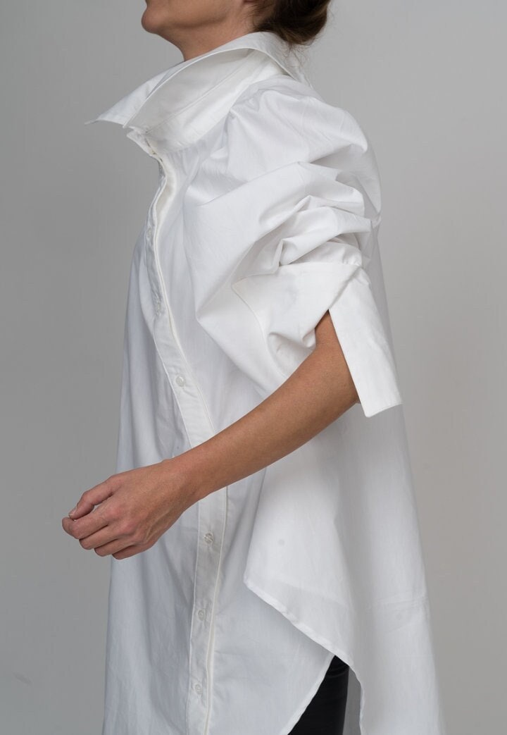 This women’s tunic dress is a versatile wardrobe staple for transitional seasons. Made of structured, breathable cotton-blend fabric, it keeps you comfortable in mild to warm weather. The oversized puff sleeves add bold, trendy style, while the asymmetric button and hem details bring modern, artistic charm. The relaxed fit ensures ease of wear, making it suitable for daily life, casual gatherings, or semi-formal outings. Pair with your favorite bottoms and accessories to create a chic, eye-catching look that suits any occasion. Stay comfortable and fashion-forward with this essential piece.Asymmetric Elegant Long Sleeved Top/Buttoned Shirt/Designer Women Top/Button Down Shirt/Women Blouse/Modern Top/ Women's White Blouse/ image 8