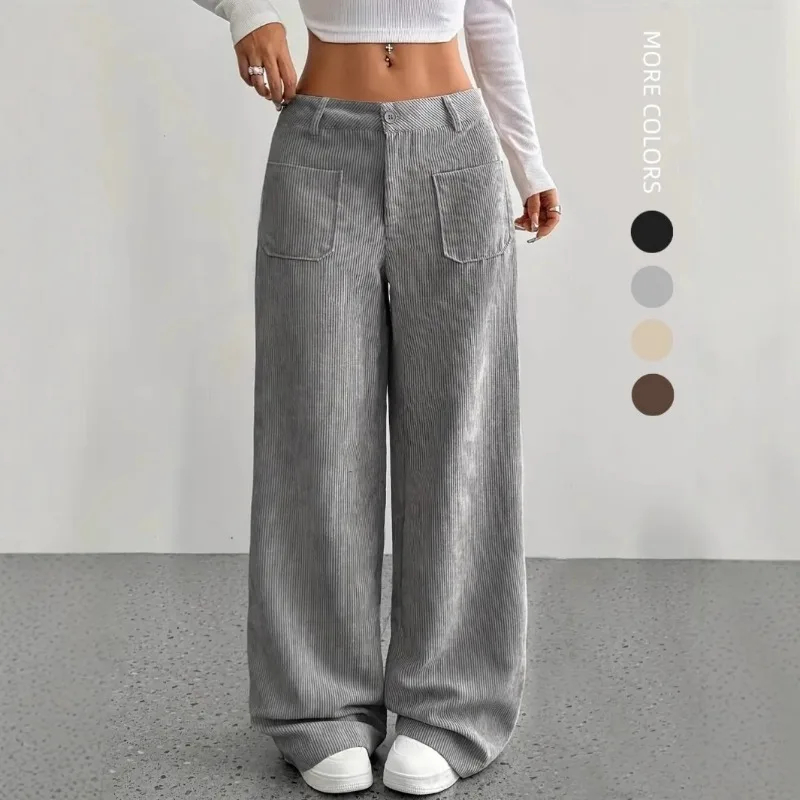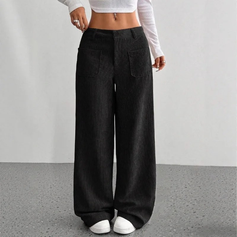 Autumn and Winter Corduroy Women's Pants Floor Length Wide Leg Loose Solid Color Casual Pants Front and Rear Pockets Slim Fit