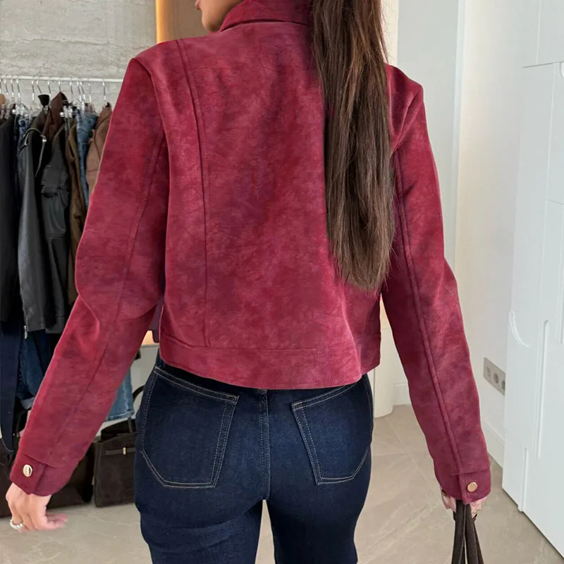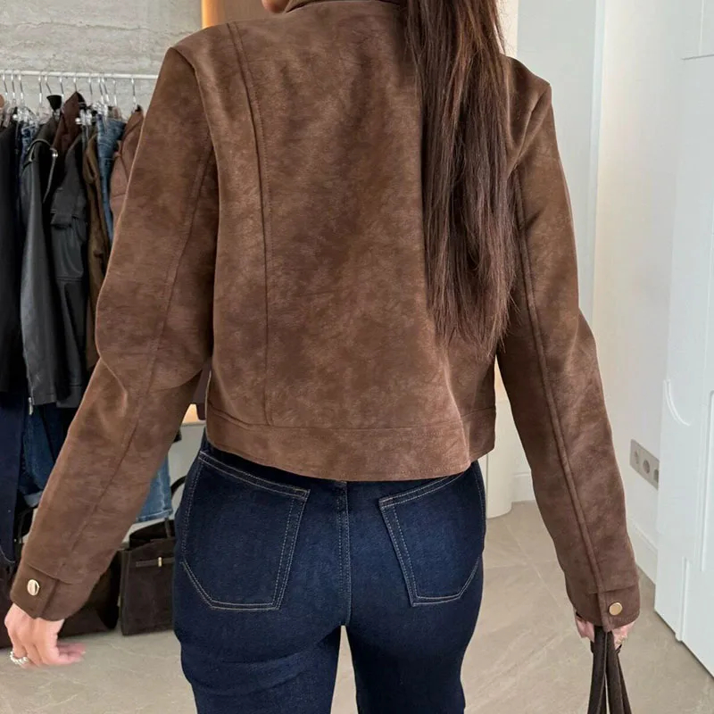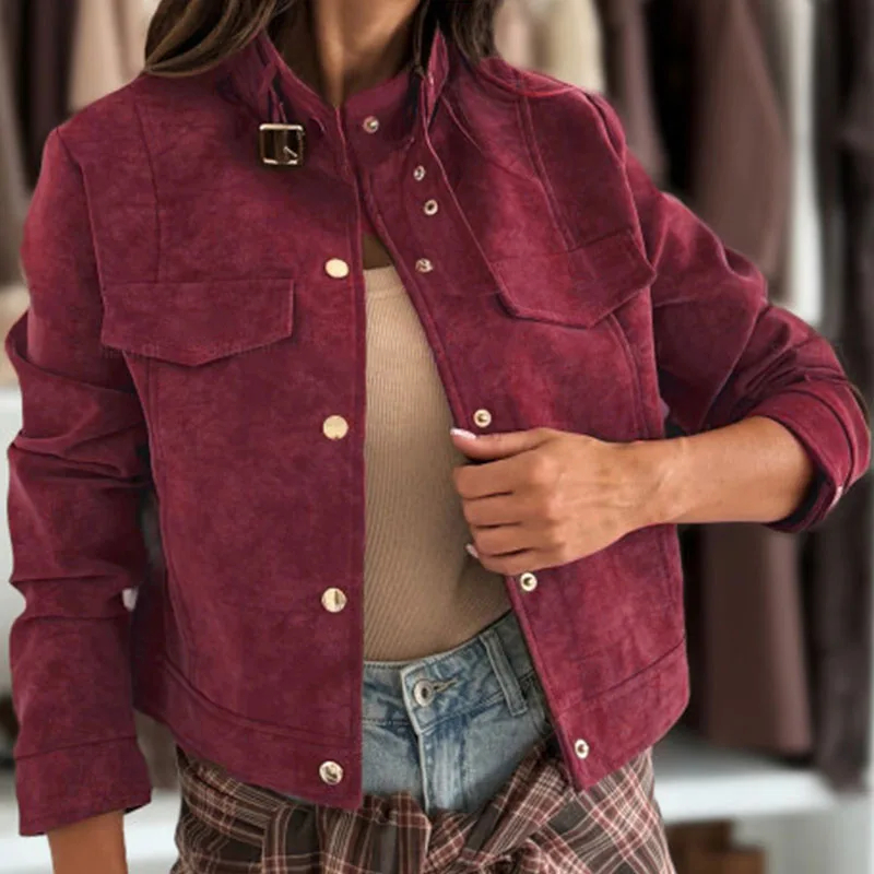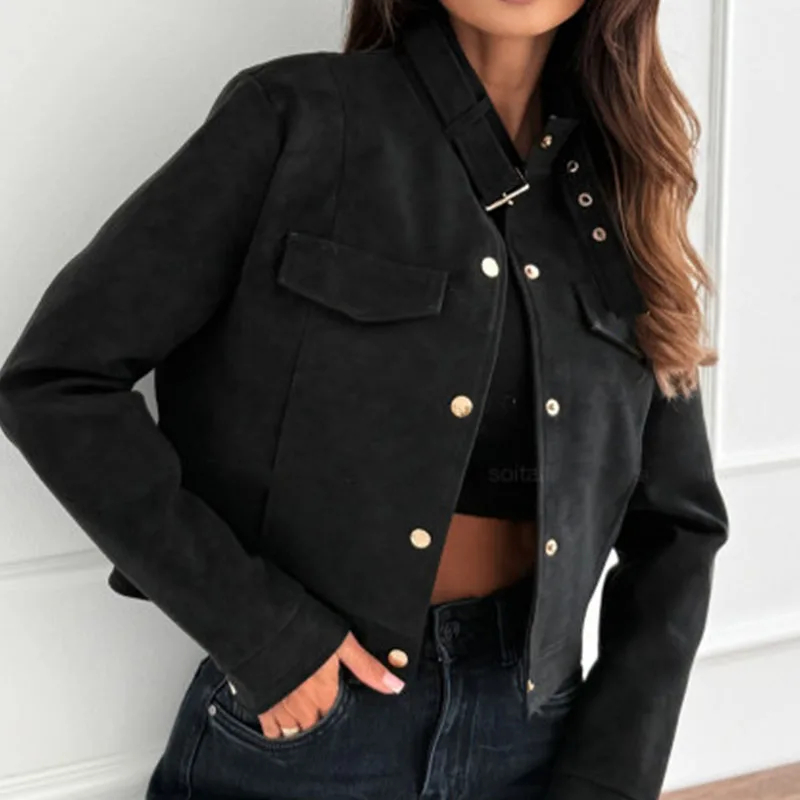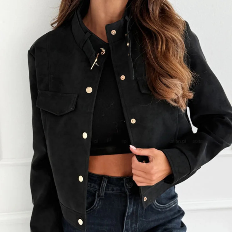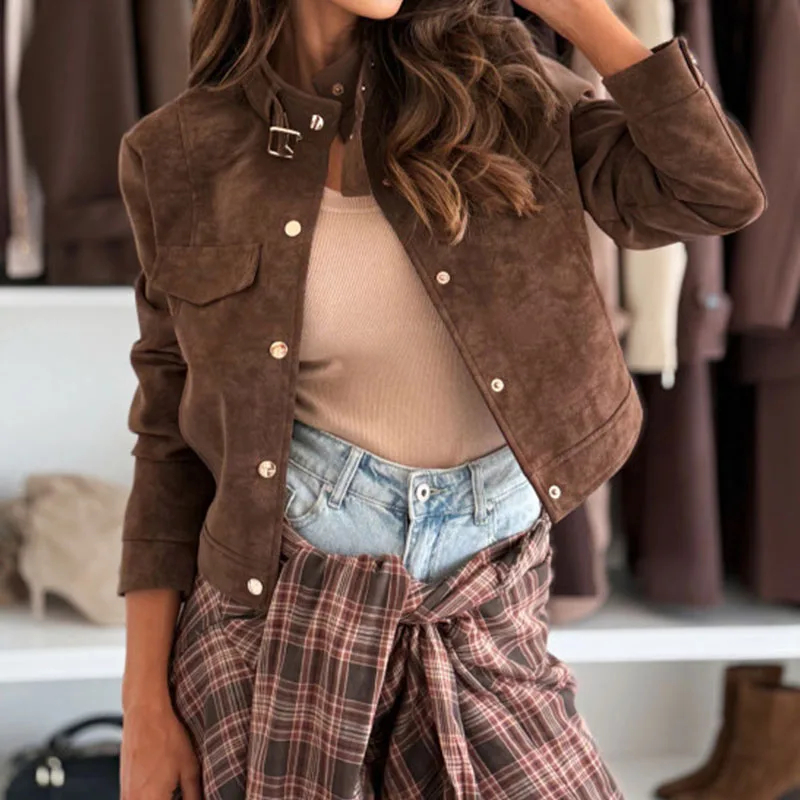 Description: This women’s long-sleeved suede-like jacket is a versatile addition to your wardrobe. Made of stylish and textured fabric, it brings a touch of uniqueness to any outfit. The stand collar with buckle detail adds a trendy element, and the cropped fit flatters your figure, making it suitable for daily wear, casual hangouts, or a fashionable day out. Pair it with jeans, skirts, or pants and accessorize to create looks that suit various occasions. Stay stylish and comfortable with this chic jacket.
