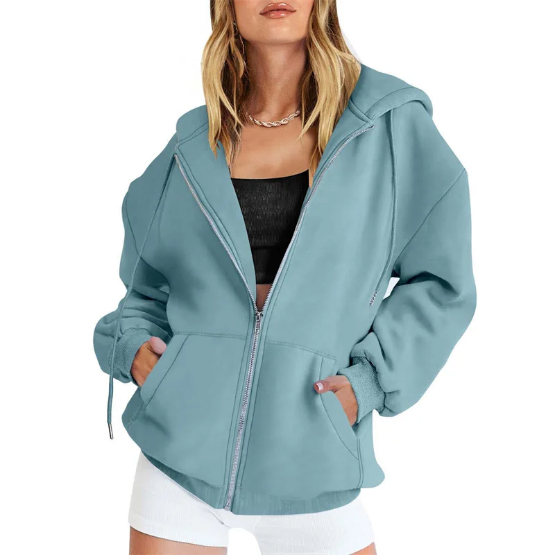 Description: This women’s long-sleeved zip-up hoodie is a versatile addition to your wardrobe. Made of soft and cozy fabric, it keeps you warm in spring, autumn, and winter. The hood with adjustable drawstrings adds a personalized touch, and the front pockets bring a stylish detail. The oversized fit offers a relaxed look, making it suitable for daily wear, street style, or casual activities. Pair it with shorts, jeans, or leggings for a chic look that can be accessorized to suit various occasions. Stay comfortable and fashionable with this trendy hoodie.