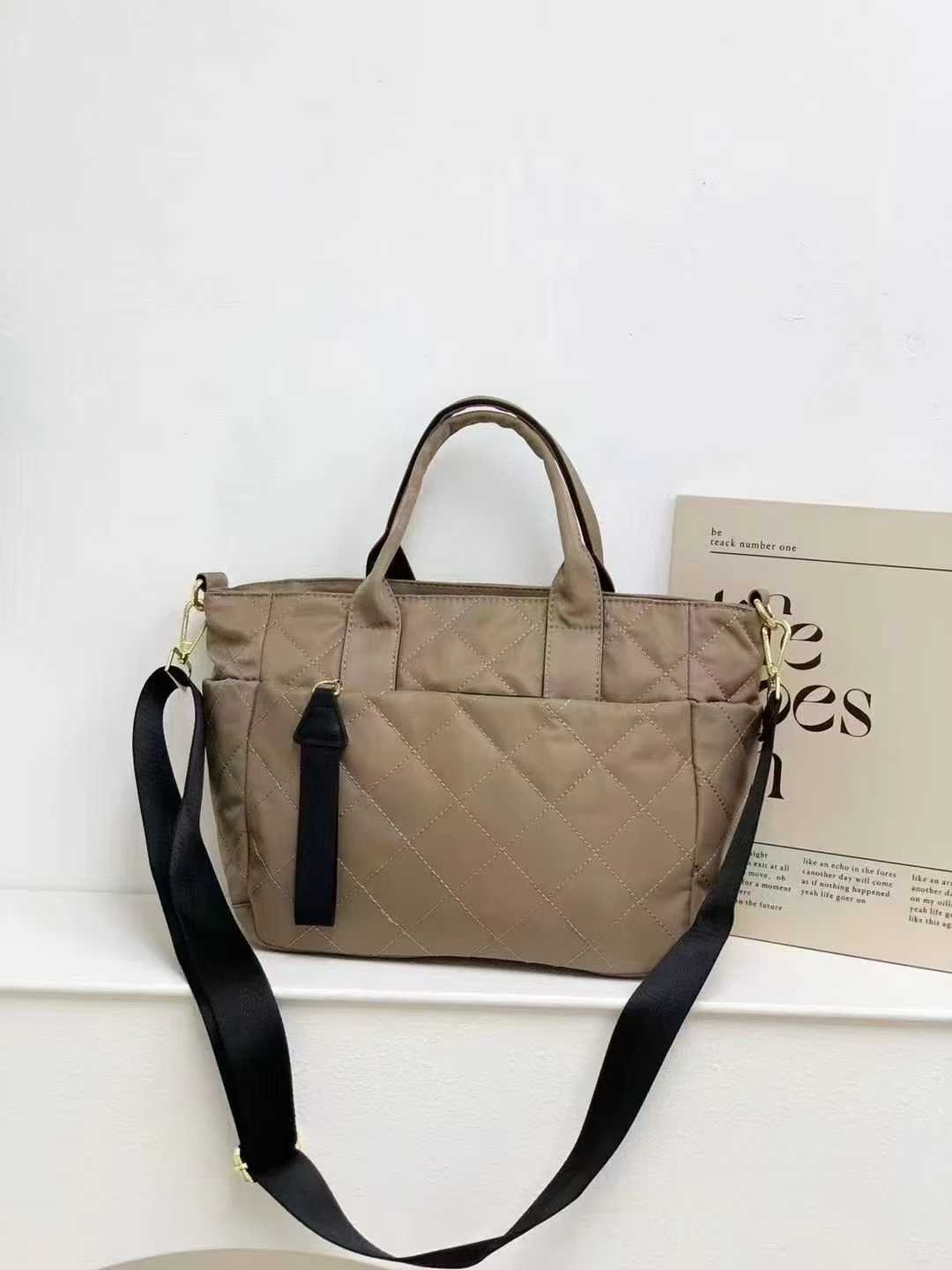 This tote seamlessly merges functionality with chic design. Crafted from beige quilted nylon, it offers durability and lightness for daily use. Featuring dual top handles and an adjustable contrast black wide strap, it can be carried by hand or worn crossbody for versatile styling. Multiple pockets, including a front compartment, ensure organized storage, while the black accent detail adds a touch of modern flair, making it a perfect companion for commuting or casual outings.