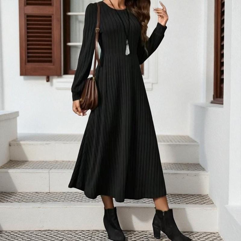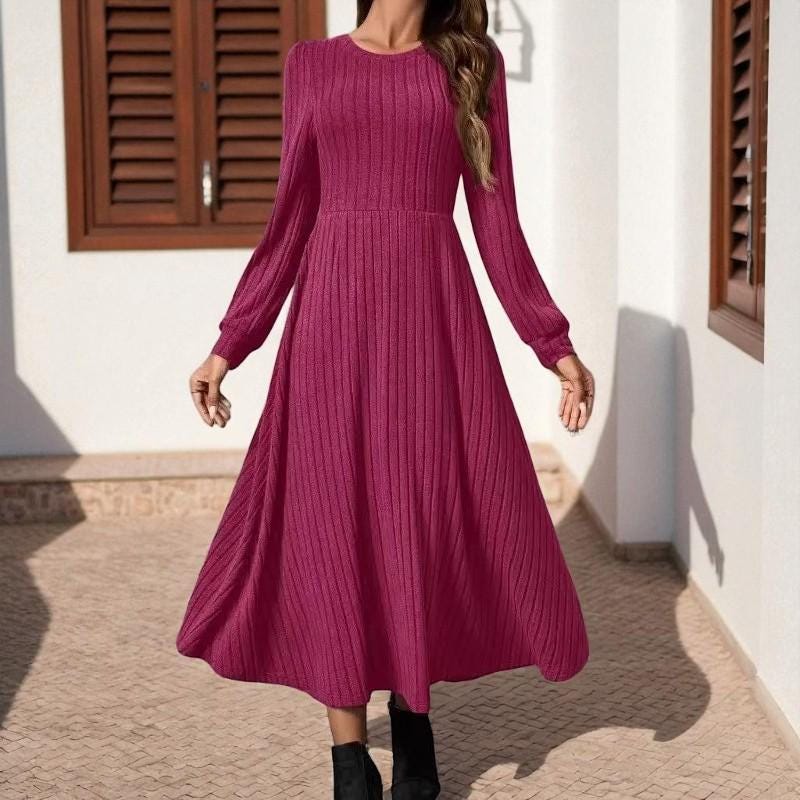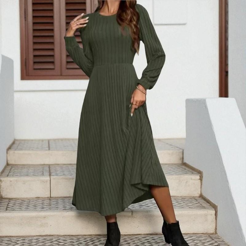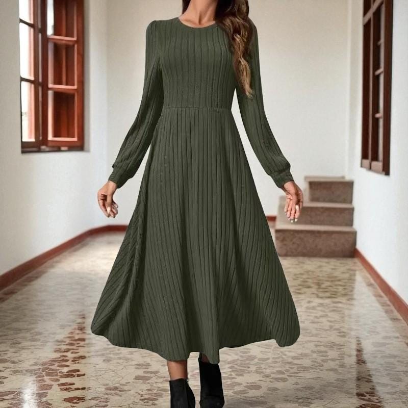 Description: This women’s long-sleeved ribbed midi dress is a wardrobe essential that balances comfort and style. Made from soft, stretchy knit fabric, it offers a snug yet flexible fit that flatters your shape. The classic crew neck and pleated waist bring timeless charm, while the side pockets add practical convenience. Suitable for everything from daily wear to casual gatherings, pair it with different shoes and layers to adapt the look to any setting—stay cozy, confident, and effortlessly chic in this versatile piece.
