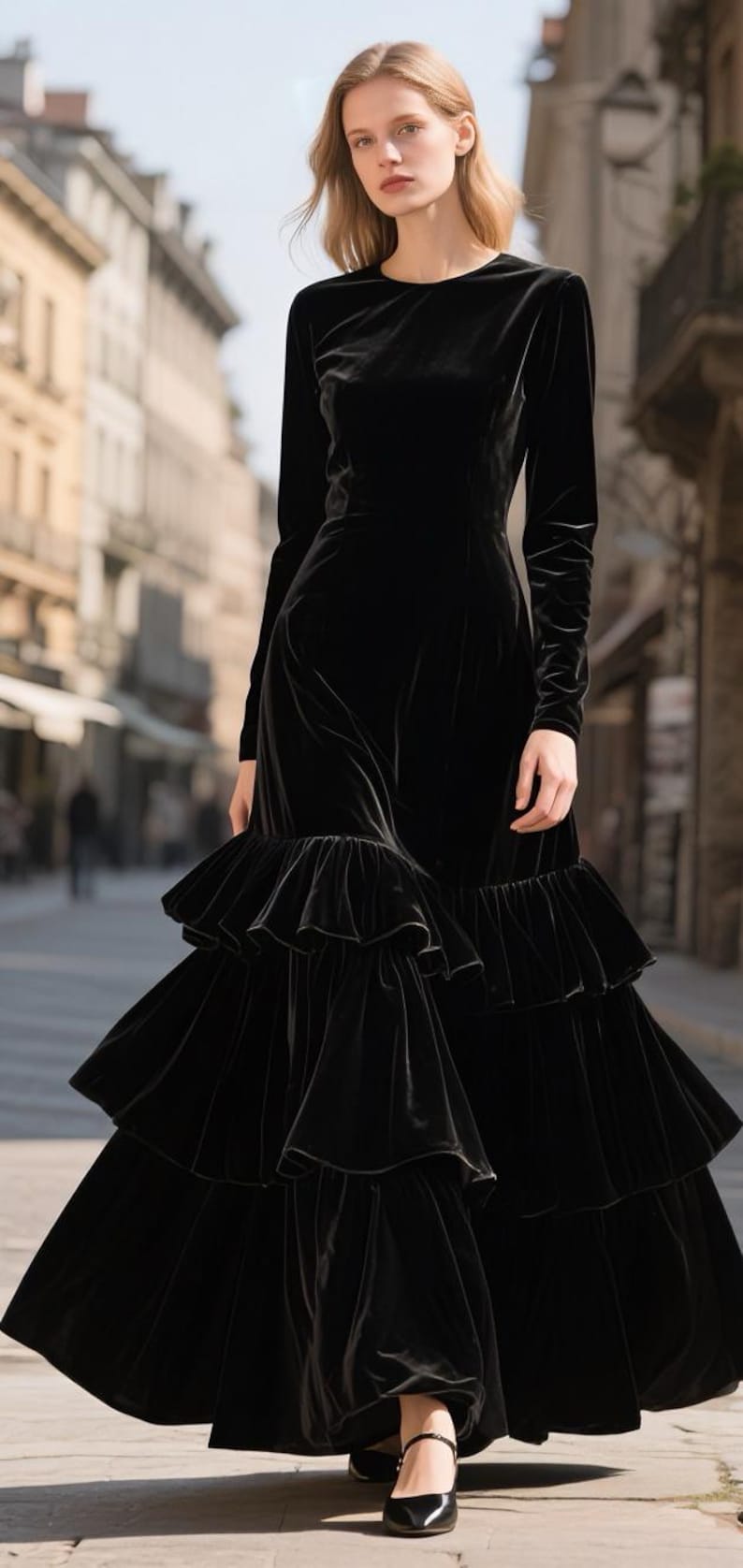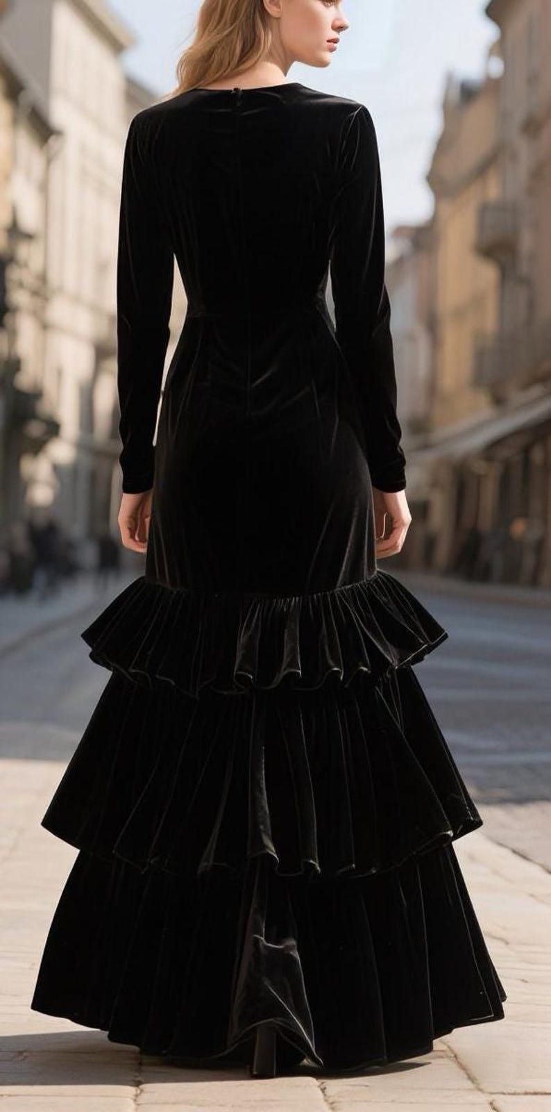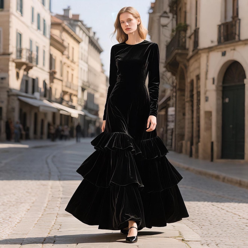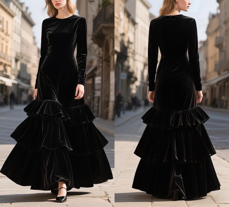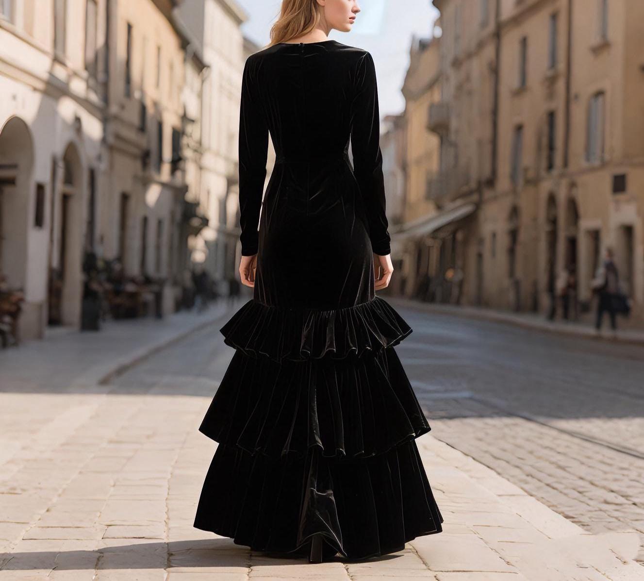 Black Velvet Maxi Dress Women Long Sleeve Dress Tiered Ruffle Hem Elegant Evening Gown Modest Formal Party Dress Winter Wedding Guest Dress