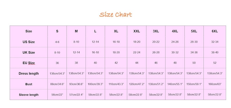 | Size | S US women' letter, M US women' letter, L US women' letter, XL US women' letter, XXL US women' letter, 3XL US women' letter, 4XL US women' letter, 5XL US women' letter, 6XL US women' letter |