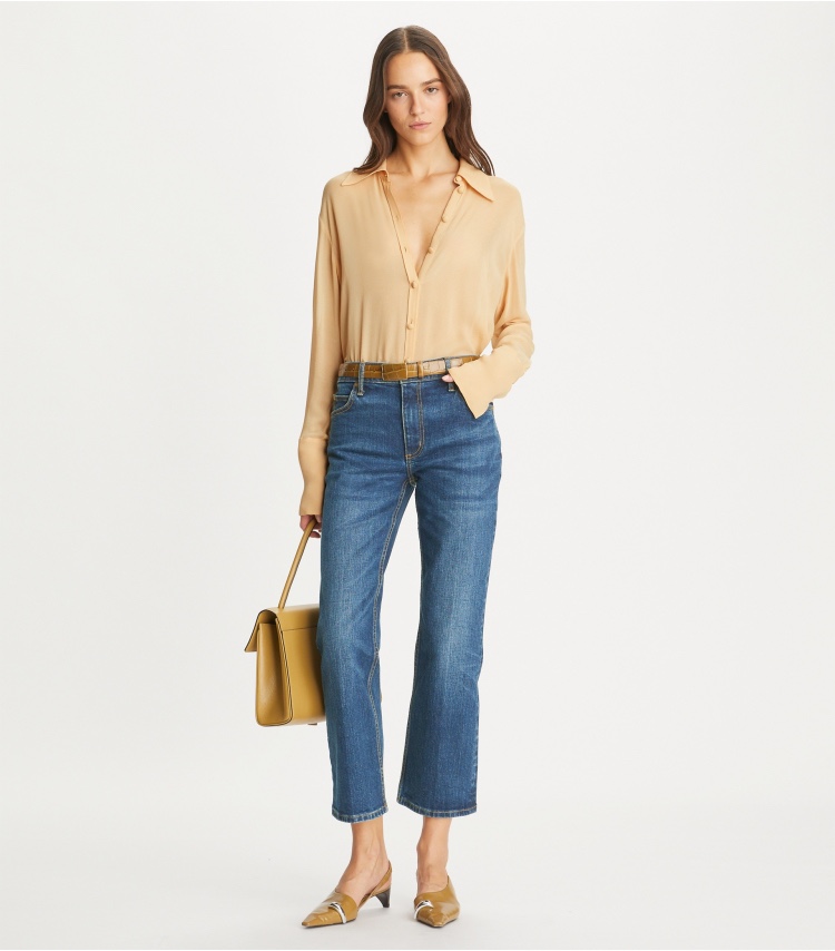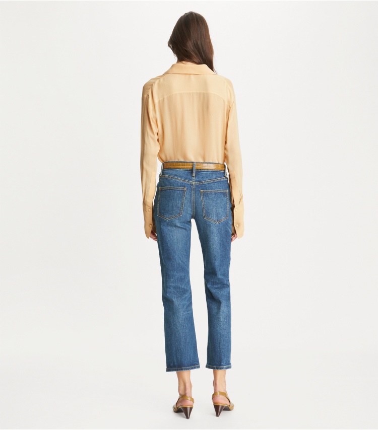 Their versatility shines through in countless styling options. Pair them with a silk blouse and heeled mules for a polished office look, or combine them with a graphic tee and sneakers for a casual, weekend-ready ensemble. Whether you’re heading to a business meeting or a casual brunch, these jeans’ cropped flare cut and gold detailing ensure you make a chic statement, proving they’re a timeless staple in any fashion-forward wardrobe.