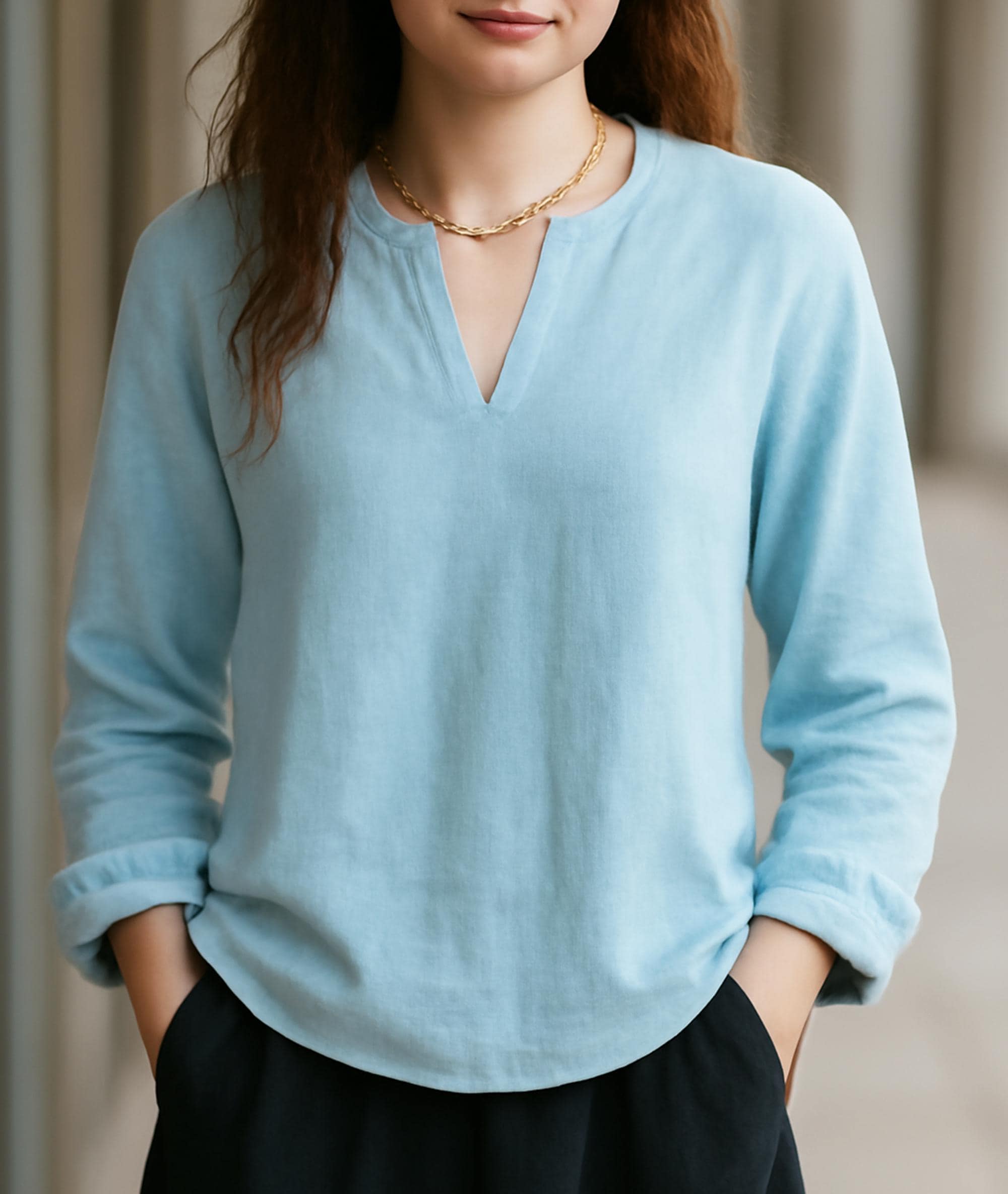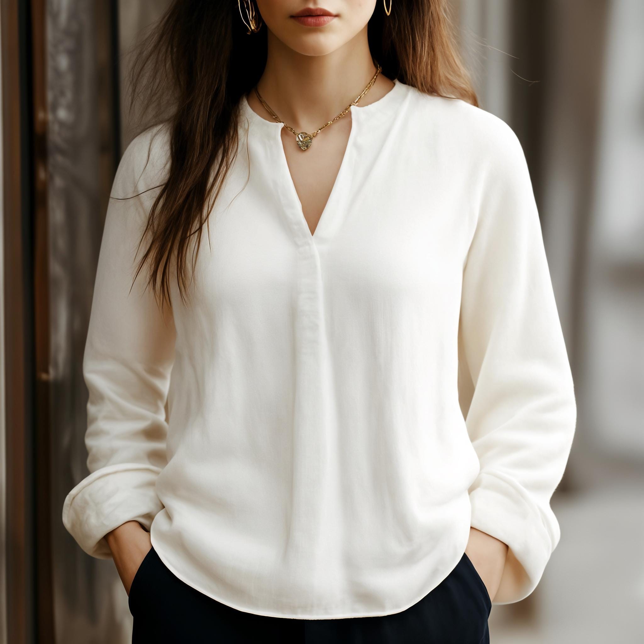 Elevate your outfit with discreet side pockets that blend style and functionality—providing convenient storage for small essentials like keys or a phone without disrupting the blouse’s streamlined, minimalist design.