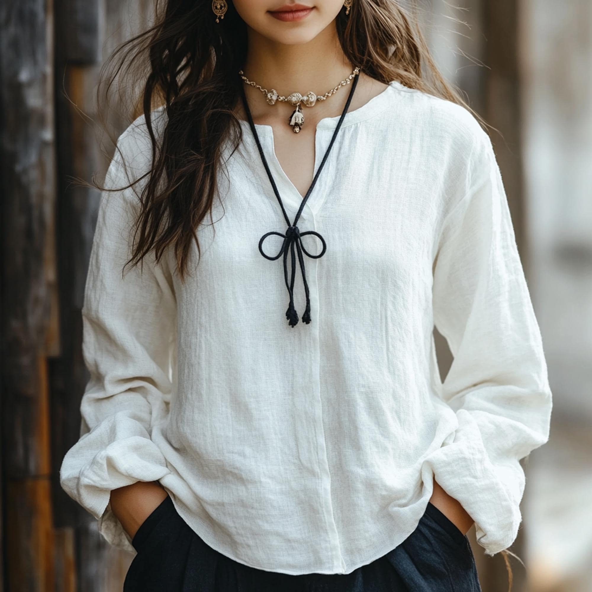 Featuring a V-neck with an adjustable black tie closure, this blouse adds a refined, personalized flair. The tie creates a graceful focal point at the neckline, balancing casual ease with subtle sophistication.