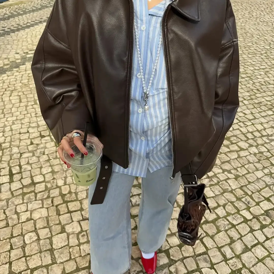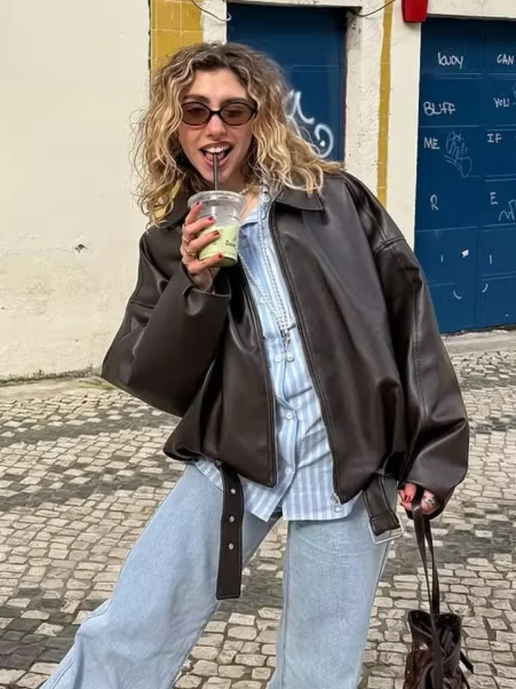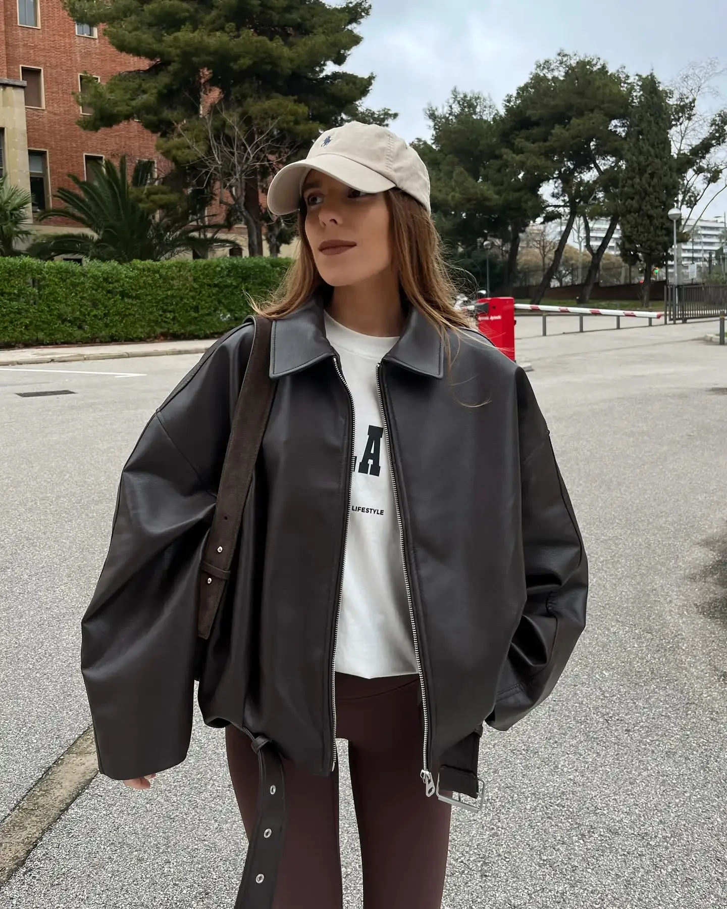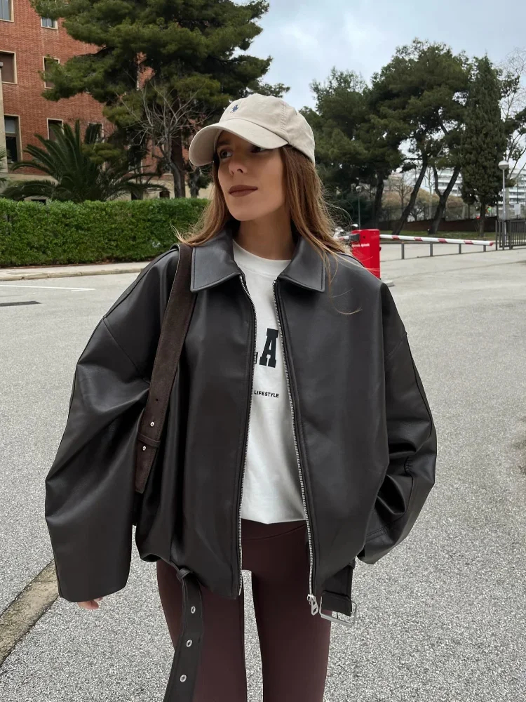 Description: This oversized faux leather jacket is a versatile staple for your wardrobe. Made of smooth, structured fabric, it combines edgy style with a relaxed fit that suits everyday wear. Suitable for daily commutes, casual gatherings, or weekend outings, it transitions effortlessly between styles with simple accessory swaps. Stay stylish and confident in this sleek piece that balances laid-back charm with contemporary sophistication.