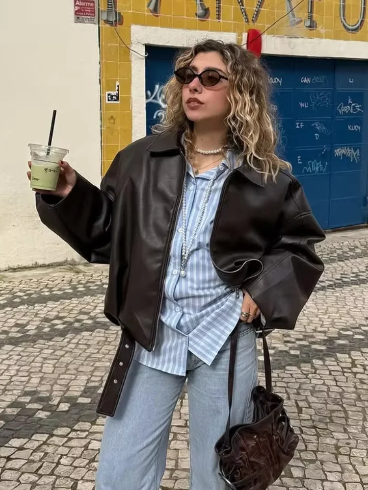 Sleek & Relaxed: Crafted from premium faux leather fabric, this oversized jacket offers a smooth, structured texture that’s both durable and lightweight—its soft material ensures comfort while maintaining a bold, modern silhouette.