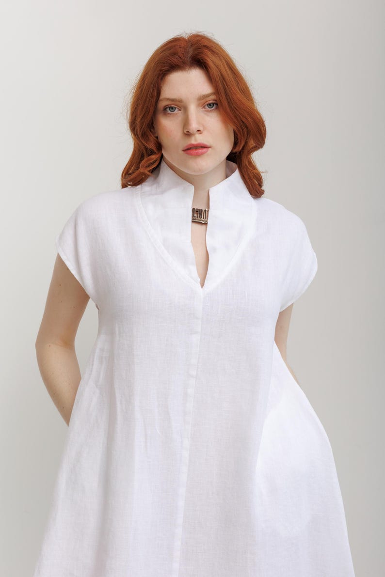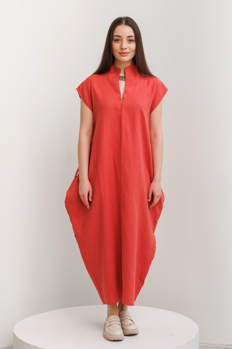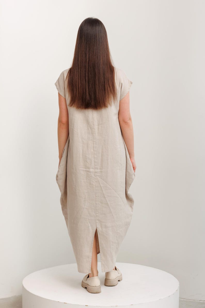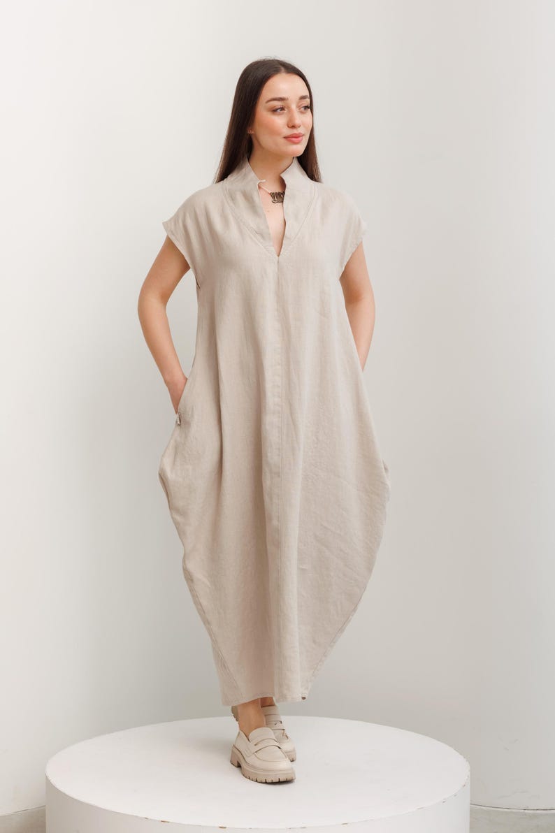 This dress is a versatile addition to any closet: its minimalist design works for multiple occasions, from running errands to meeting friends. Dress it up with layered necklaces or keep it simple for a clean, timeless aesthetic—either way, it keeps you feeling comfortable and looking effortlessly chic.Chic Linen Ankle Dress: Stand Collar, Functional Pockets image 2