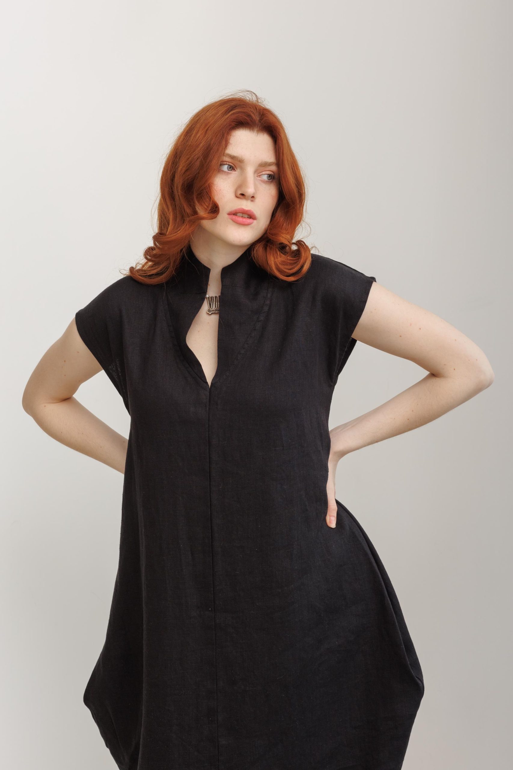 Featuring a sleek stand collar with a subtle V-neck detail, this dress balances elegance and ease. The short, relaxed sleeves offer freedom of movement, while the flowing, A-line or teardrop-shaped hem creates a graceful, effortless silhouette that drapes beautifully on all body types.