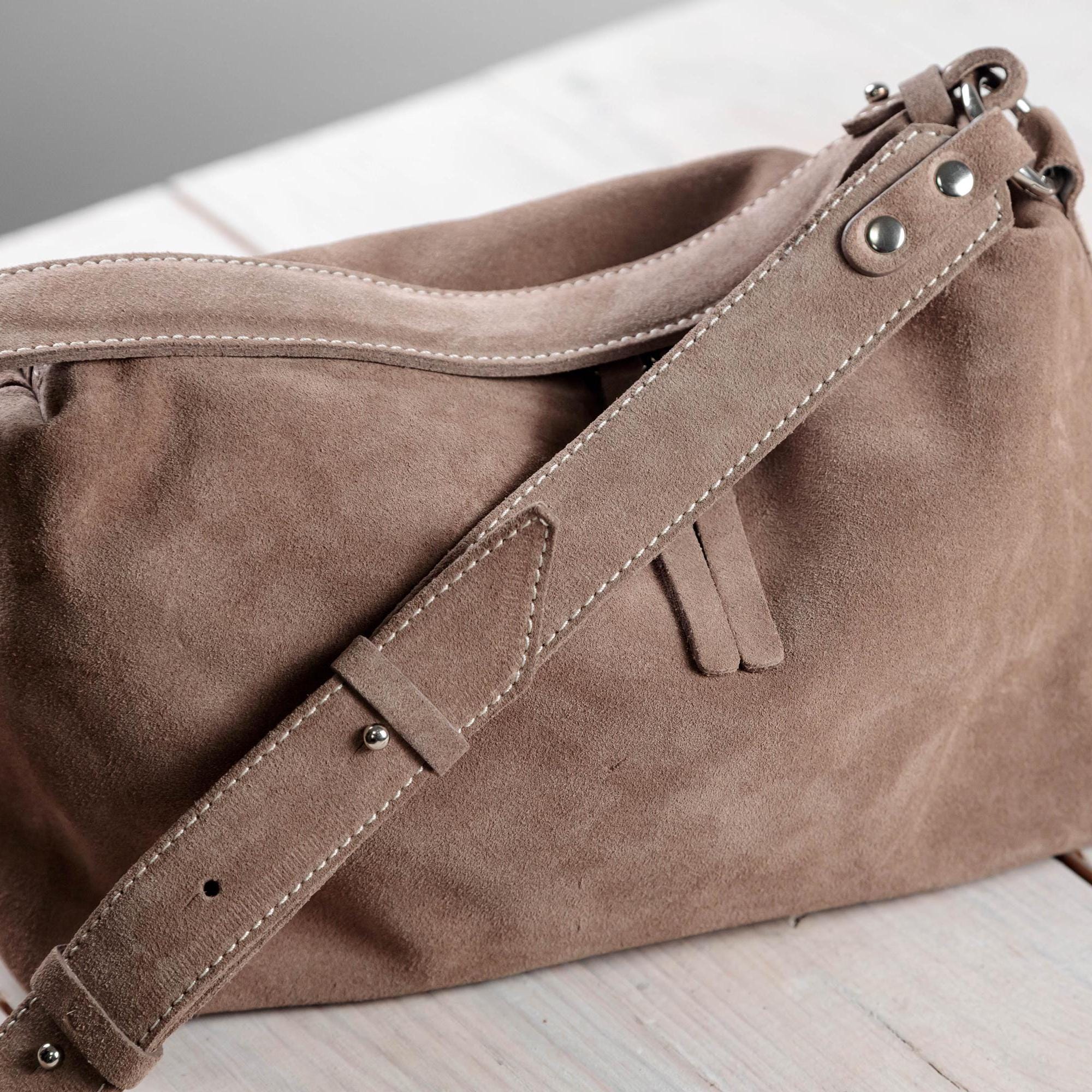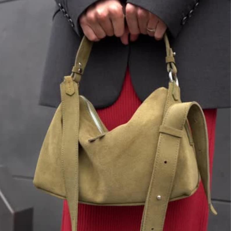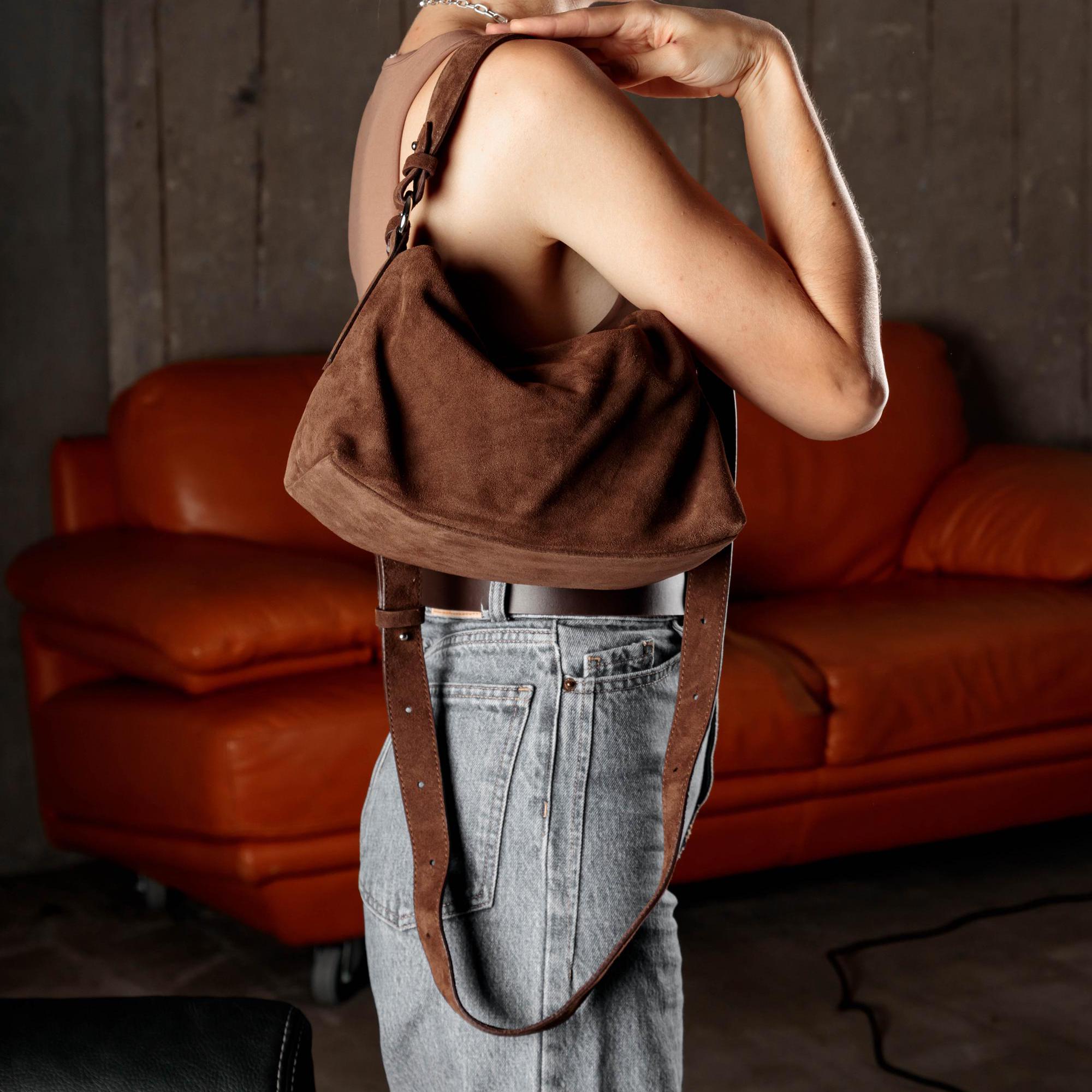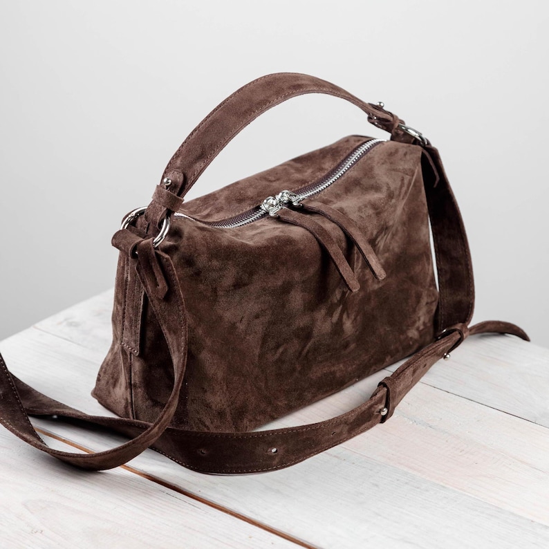 Chocolate suede handbag, olive green suede small tote bag, designer crossbody bag, suede shoulder purse, suede underarm bag, slouchy tote