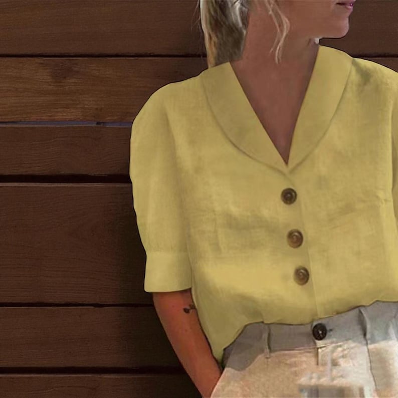 This women’s short-sleeve blouse is a versatile staple for warm-weather wardrobes. Made of lightweight, breathable linen-blend fabric, it keeps you comfortable in mild to hot seasons. The V-neck collar and button details add refined, retro style, while the regular fit ensures relaxed ease. Its adaptable design makes it ideal for daily wear, casual gatherings, or semi-formal settings. Pair with your favorite bottoms and accessories to create a chic, effortless look that suits any occasion. Stay comfortable and fashion-forward with this essential piece.