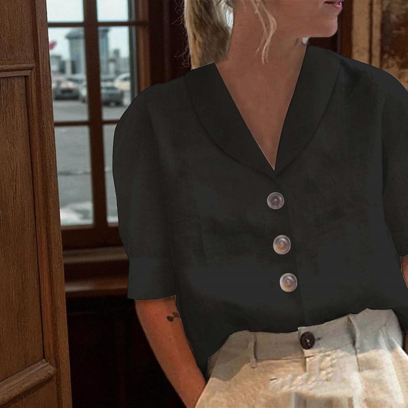 Featuring a sleek V-neck collar and decorative front buttons, this blouse adds a refined, retro-inspired flair. The button accents create a focal point that balances the minimalist silhouette with subtle sophistication.