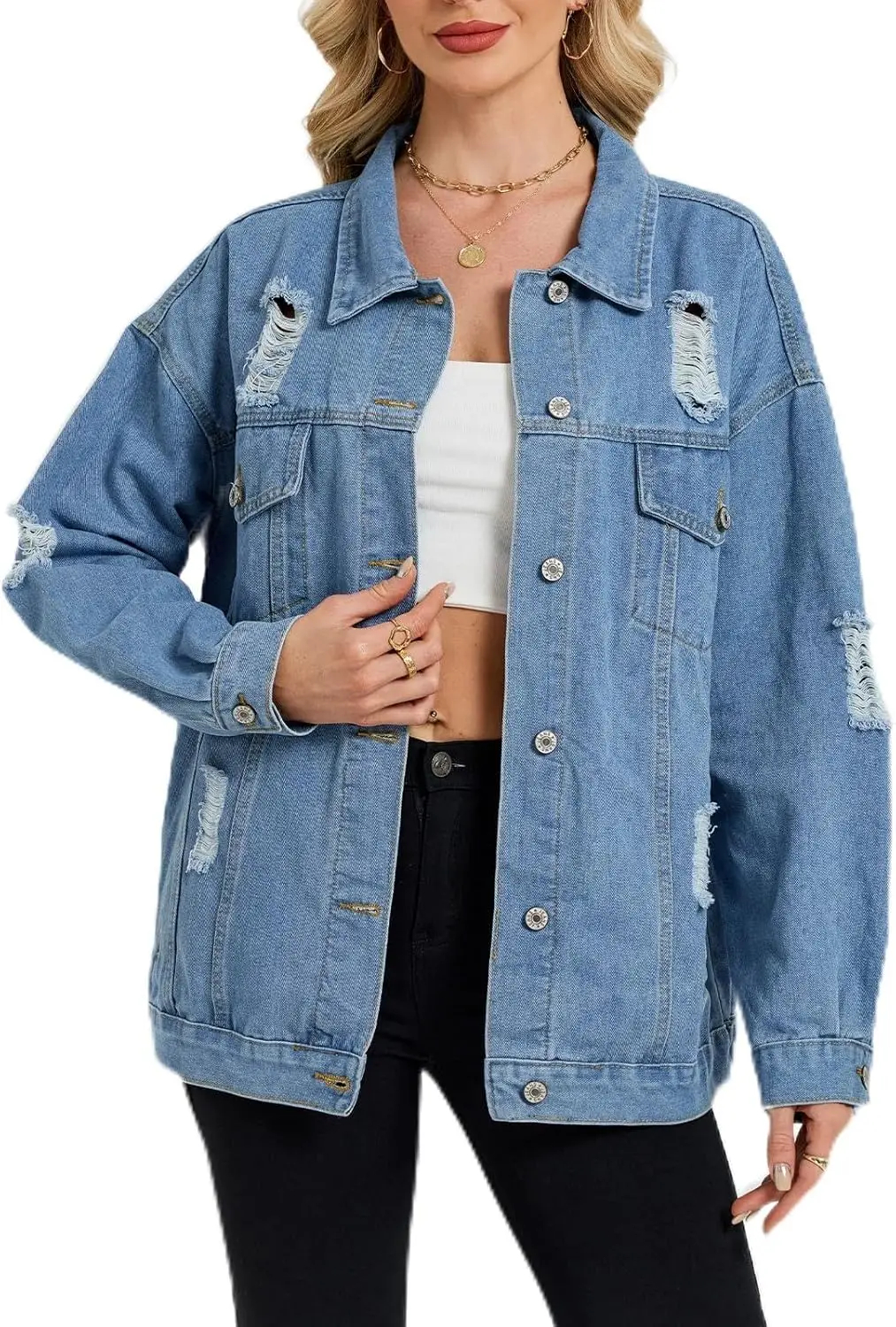 Chic Distressed Detail: Elevate your outfit with the distressed design that adds a trendy, edgy flair to the jacket. It not only enhances style but also creates a unique and fashionable aesthetic.