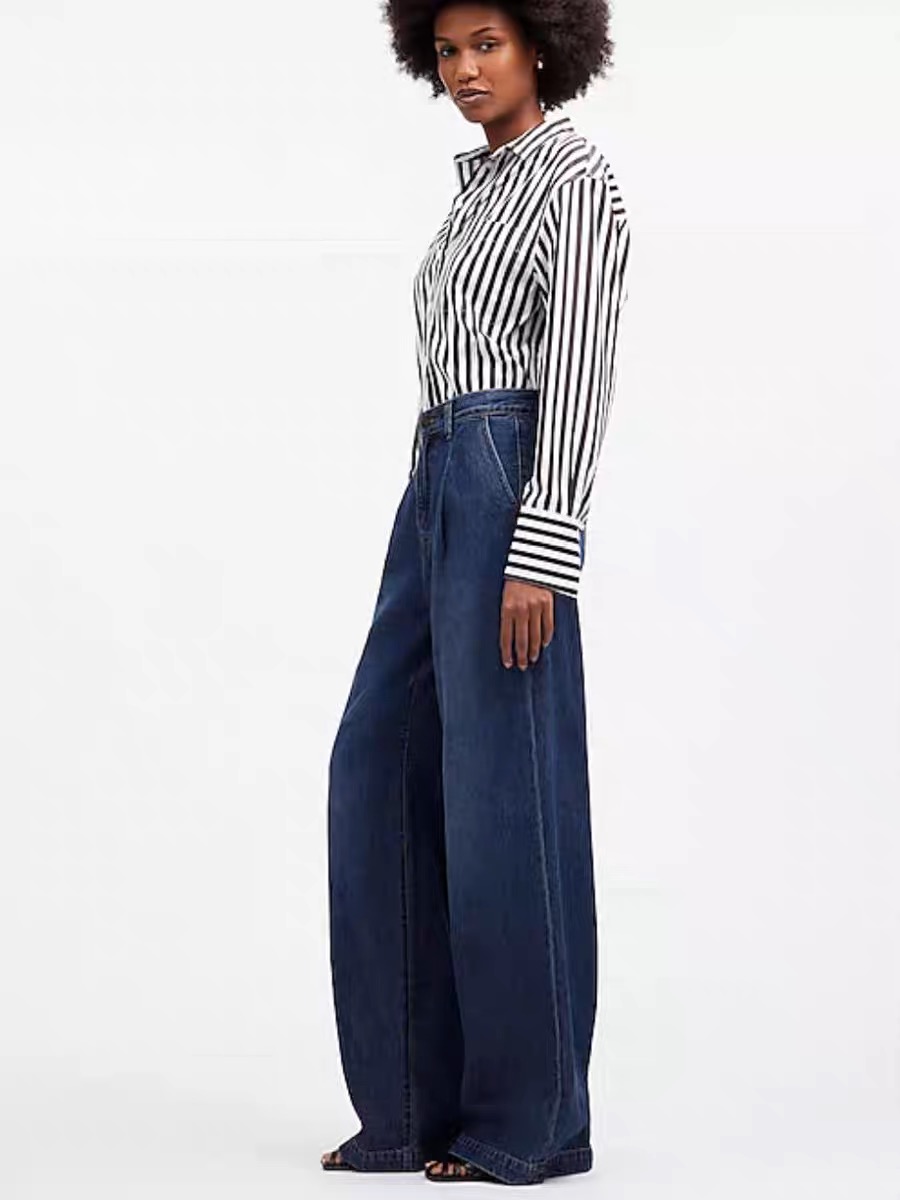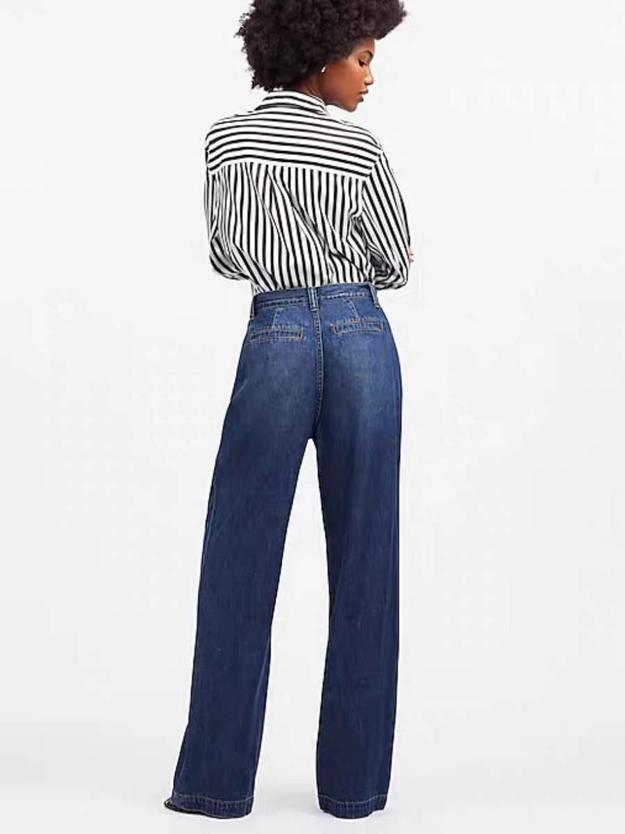 Their styling potential is incredibly diverse. Match them with a striped button-down shirt and heels for a sophisticated, urban look, or pair them with a simple sweatshirt and sneakers for a casual, laid-back ensemble. Whether you’re heading to the office, going shopping, or meeting friends, these jeans’ retro-wide leg design and comfortable feel make them a reliable go-to, effortlessly elevating any outfit.