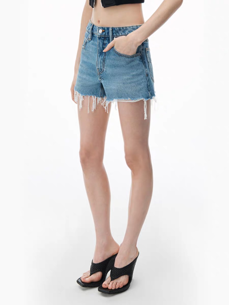 These Alexander Wang Distressed Denim Shorts are a bold fusion of streetwear edge and luxury craftsmanship. Crafted from premium light-wash denim, they feature a high-rise fit, frayed raw hems for a lived-in vibe, and signature logo embroidery on the back pockets that adds a distinctive brand touch. The classic five-pocket design and tailored silhouette balance casual comfort with high-fashion detailing, making them a standout piece for those who embrace urban-chic style.