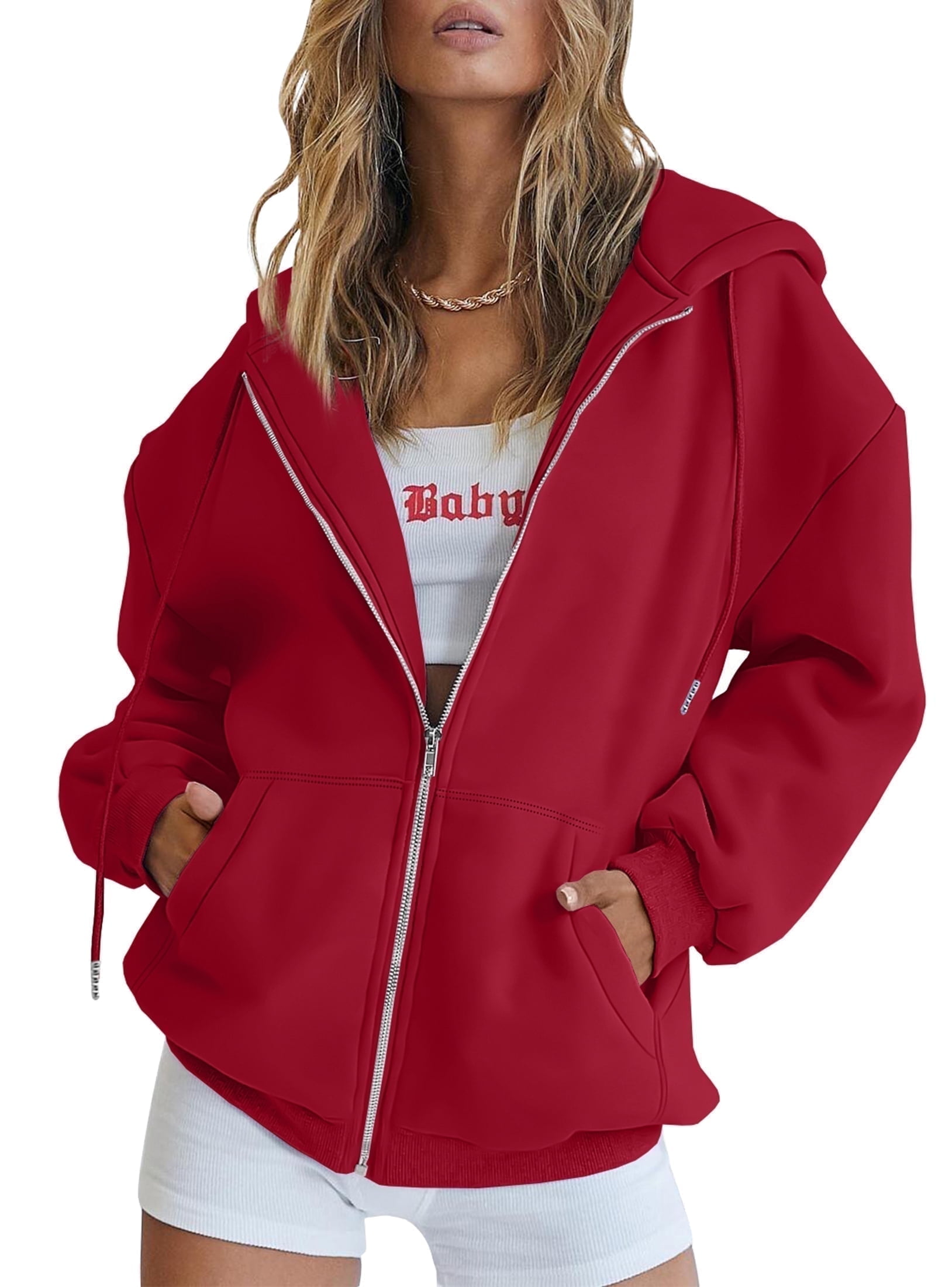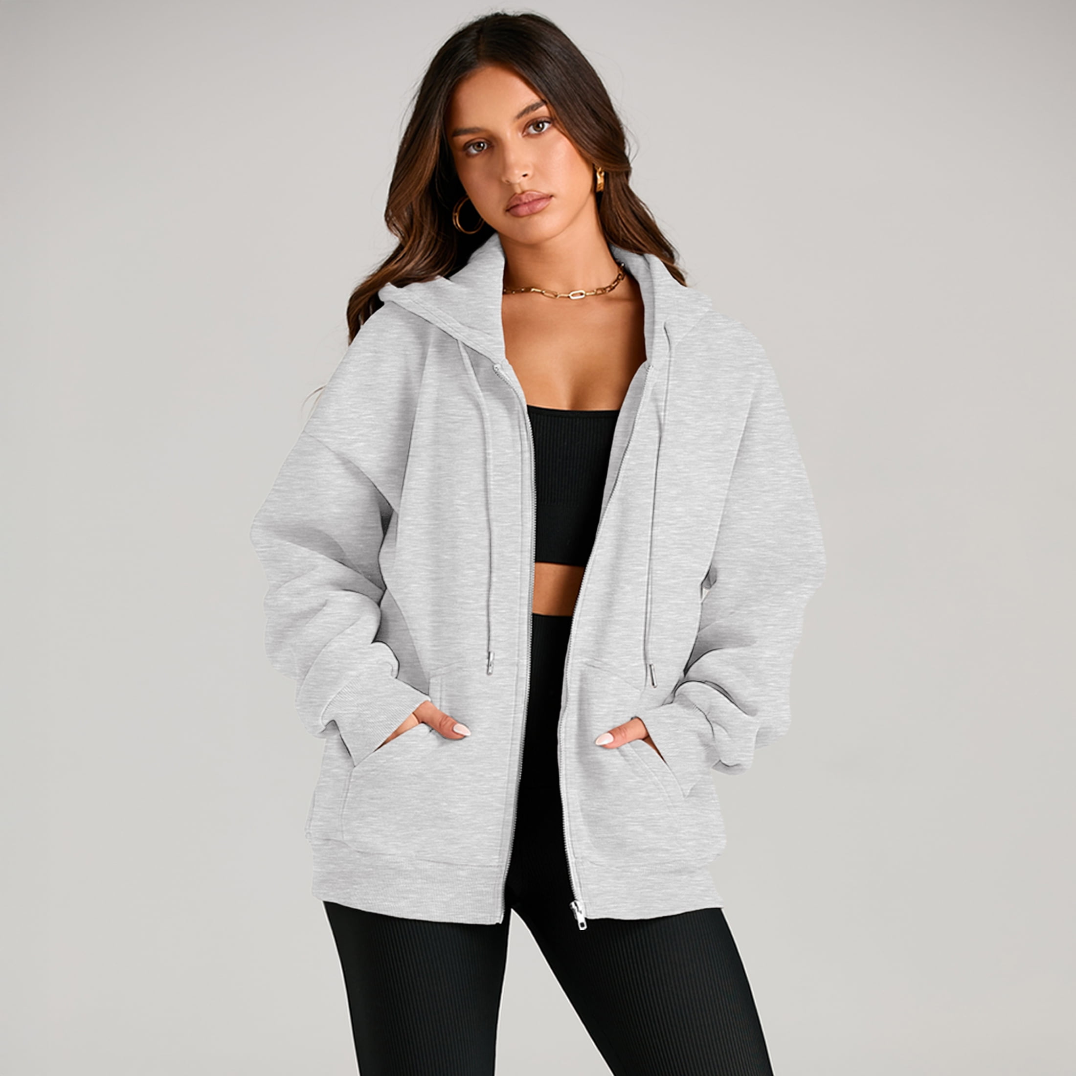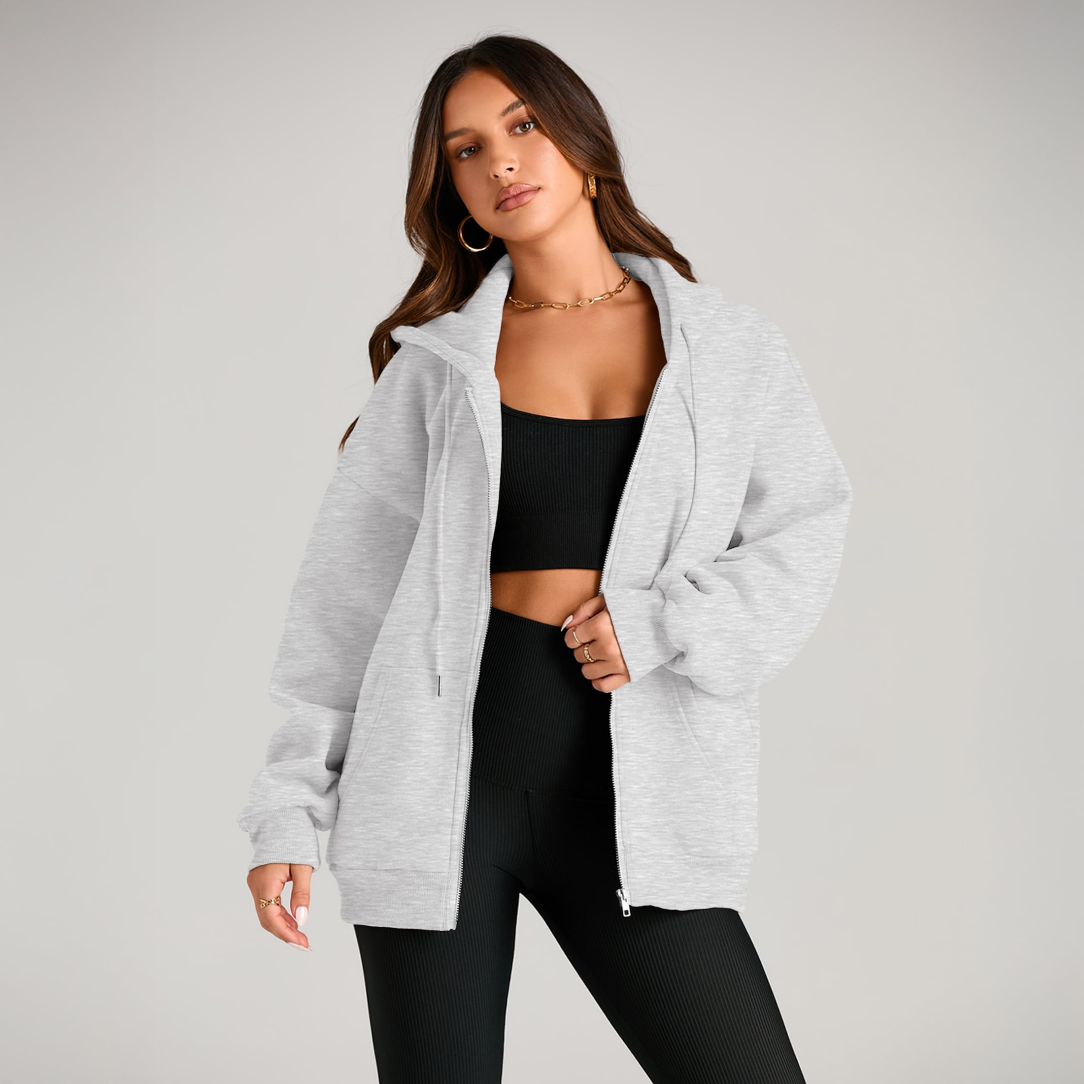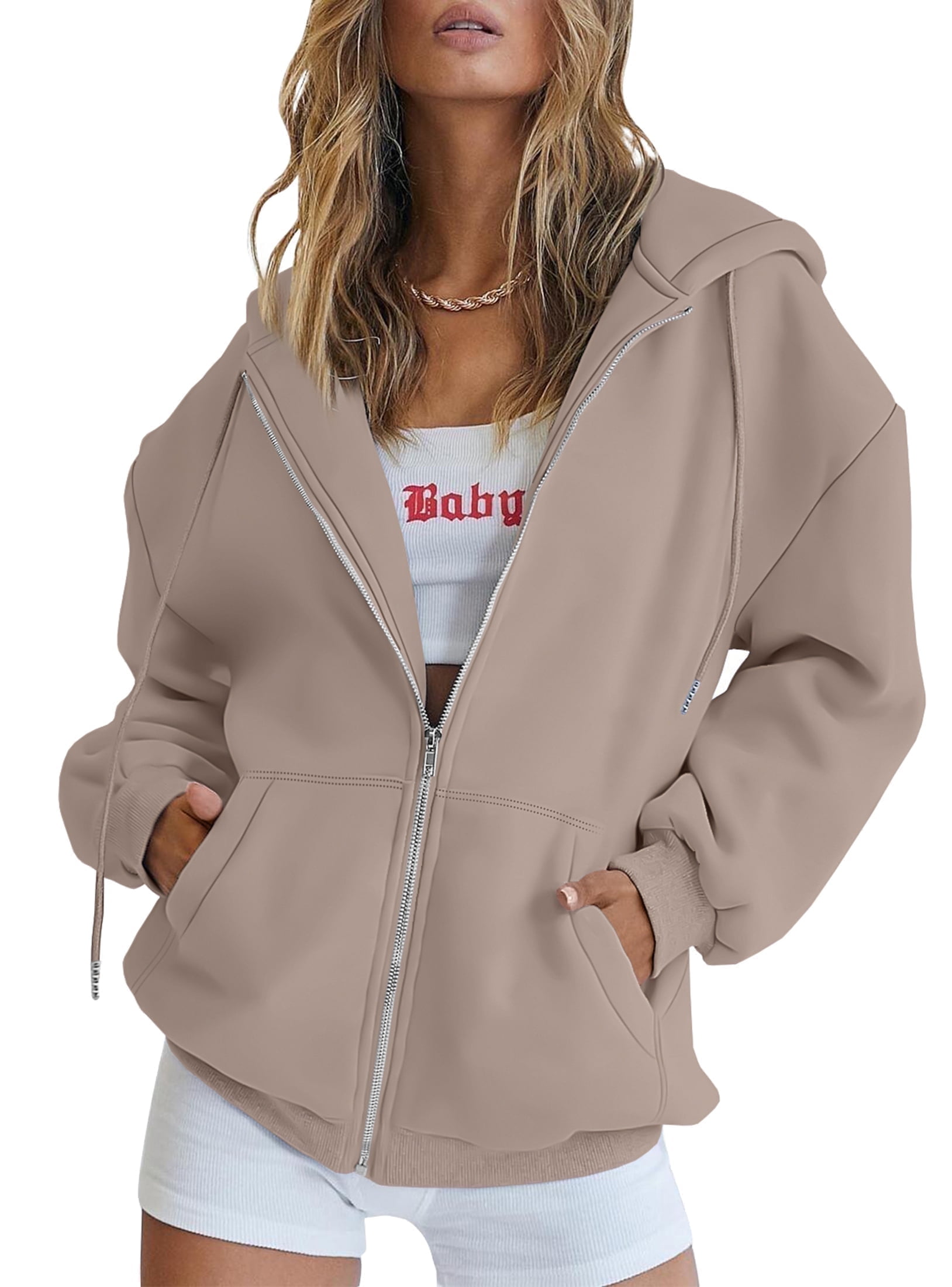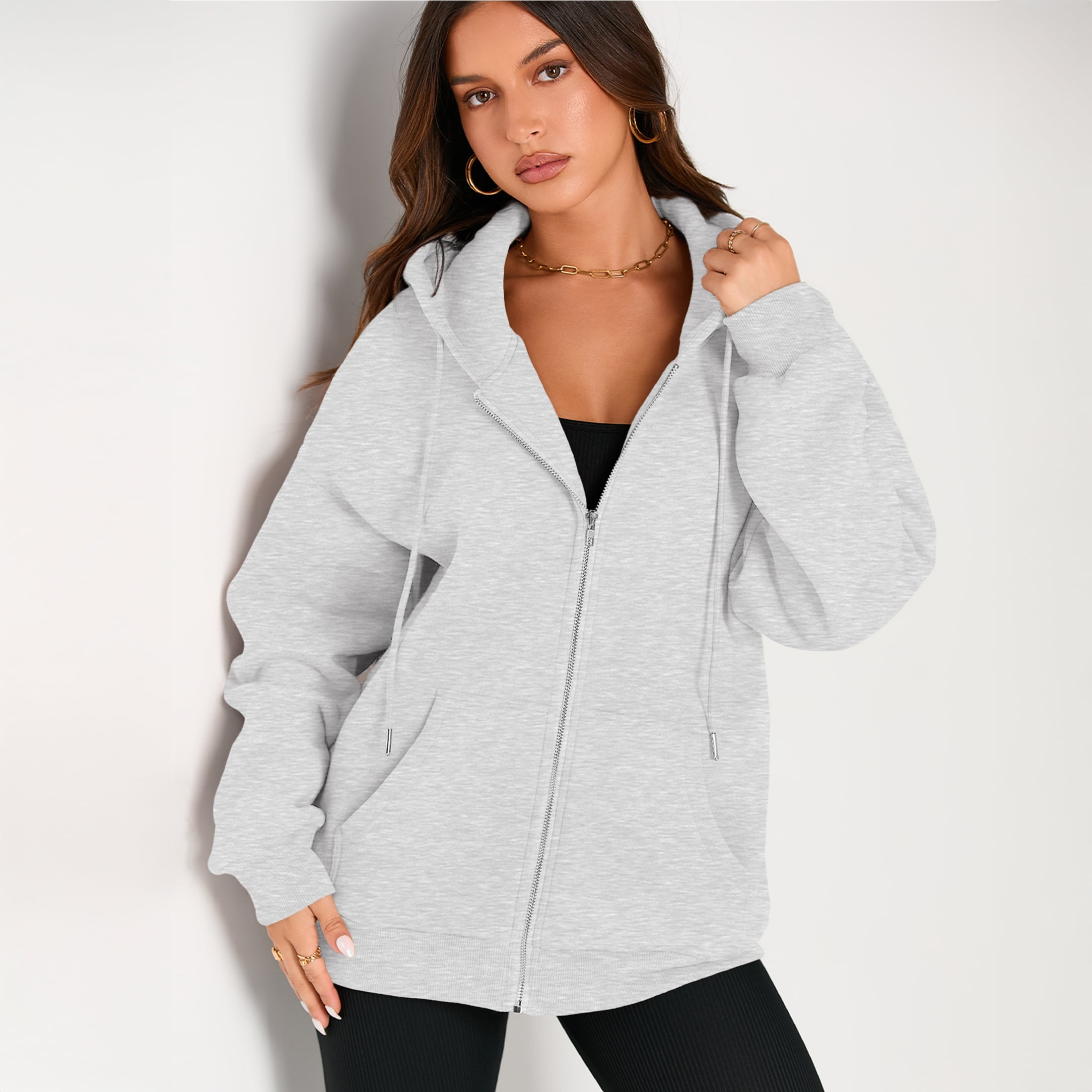 This women’s zip-up hoodie is a versatile must-have for any closet. Made from soft, breathable fleece-blend fabric, it offers cozy comfort for transitional seasons and easy layering. Its adjustable hood, sleeve drawstrings, and deep kangaroo pockets blend function with trendy design, while the oversized fit ensures all-day ease. Perfect for daily wear, casual outings, or relaxed layering looks, it pairs seamlessly with tops, shorts, jeans, or pants — accessorize with necklaces or bags to suit any occasion. Stay comfortable, stylish, and adaptable with this essential hoodie.