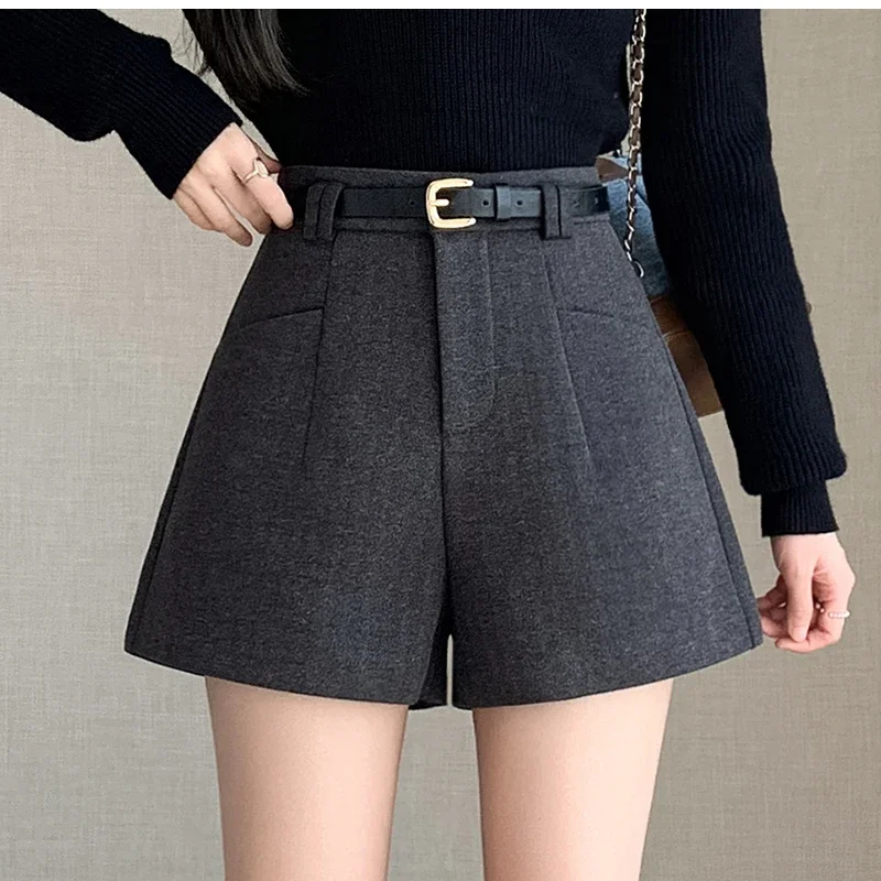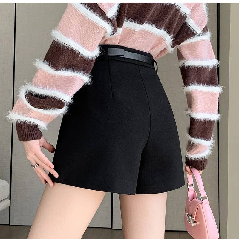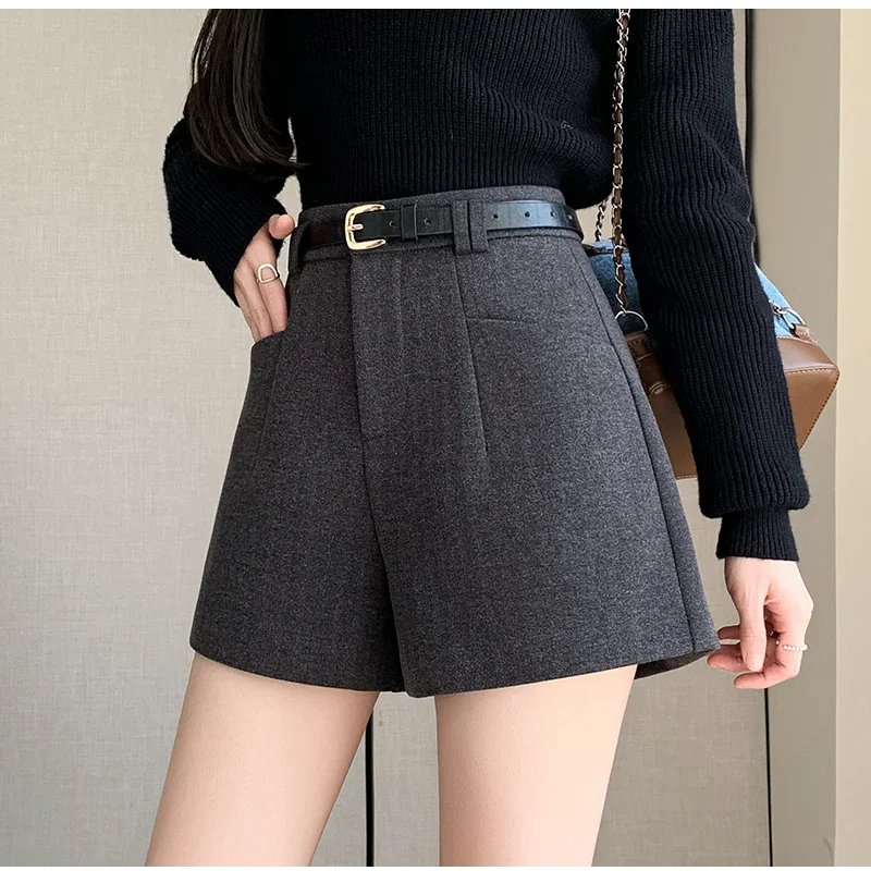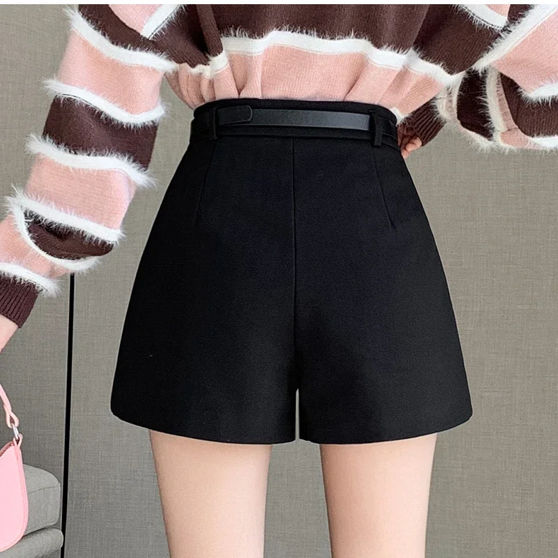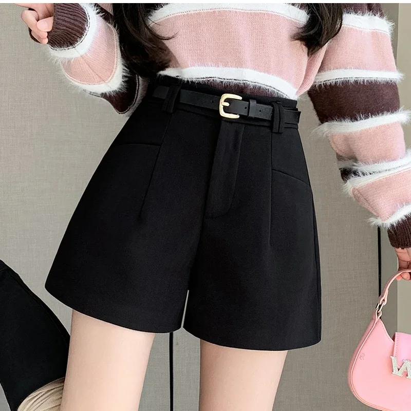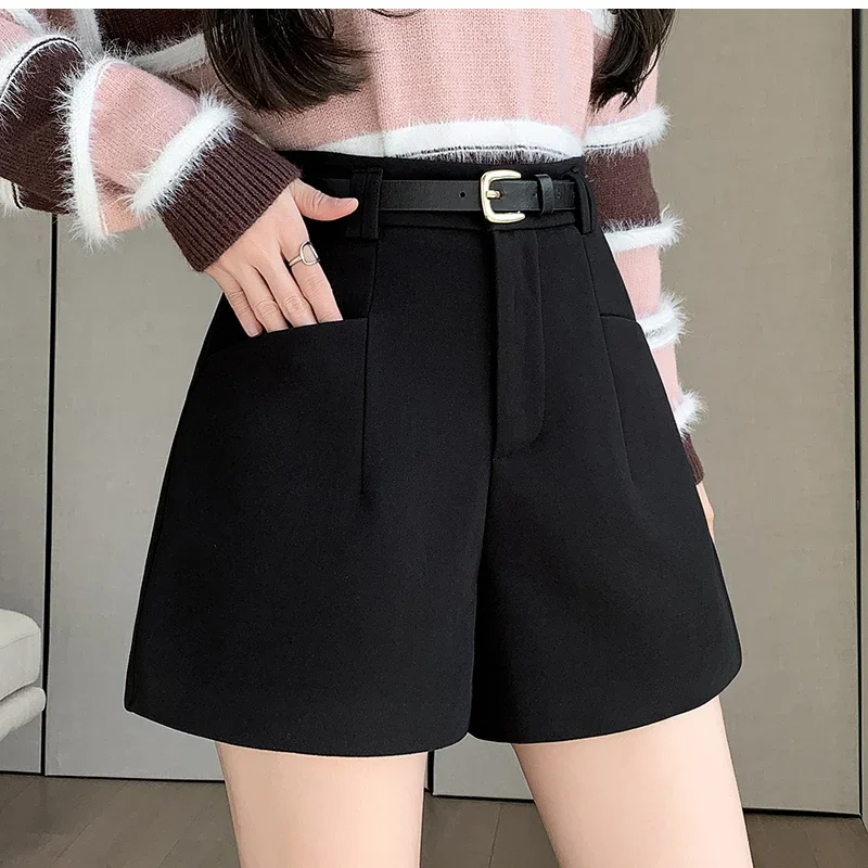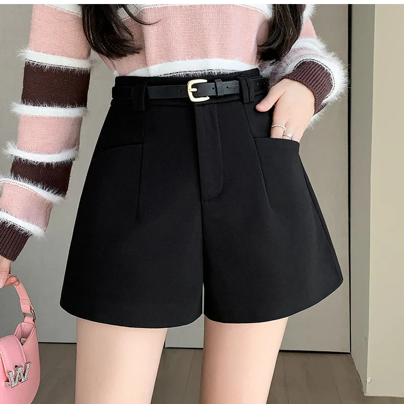 Description: These women’s shorts are a versatile addition to your wardrobe. Made of soft and warm fabric, they ensure comfort in autumn and winter. The stylish belt with a statement buckle and front pleats add a sophisticated detail, and the practical pockets enhance both style and functionality. The relaxed A-line fit flatters your figure, making it suitable for daily wear, office settings, or casual winter outings. Pair it with sweaters, blouses, or turtlenecks for a chic look that can be accessorized to suit various occasions. Stay comfortable and fashionable with this trendy short.