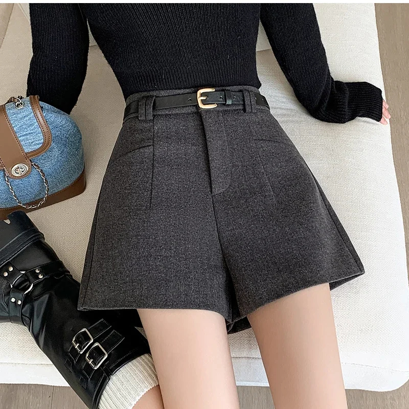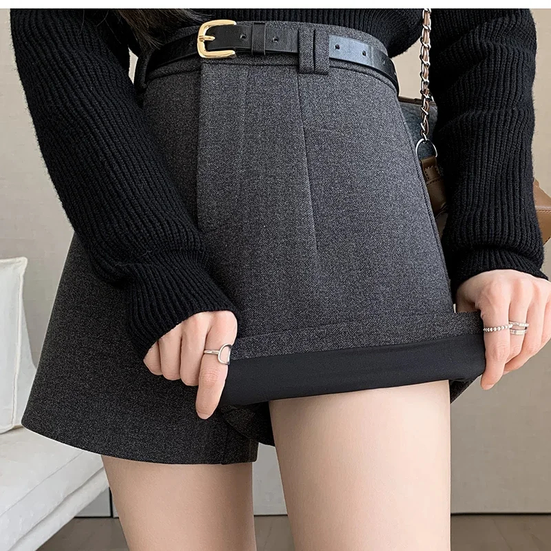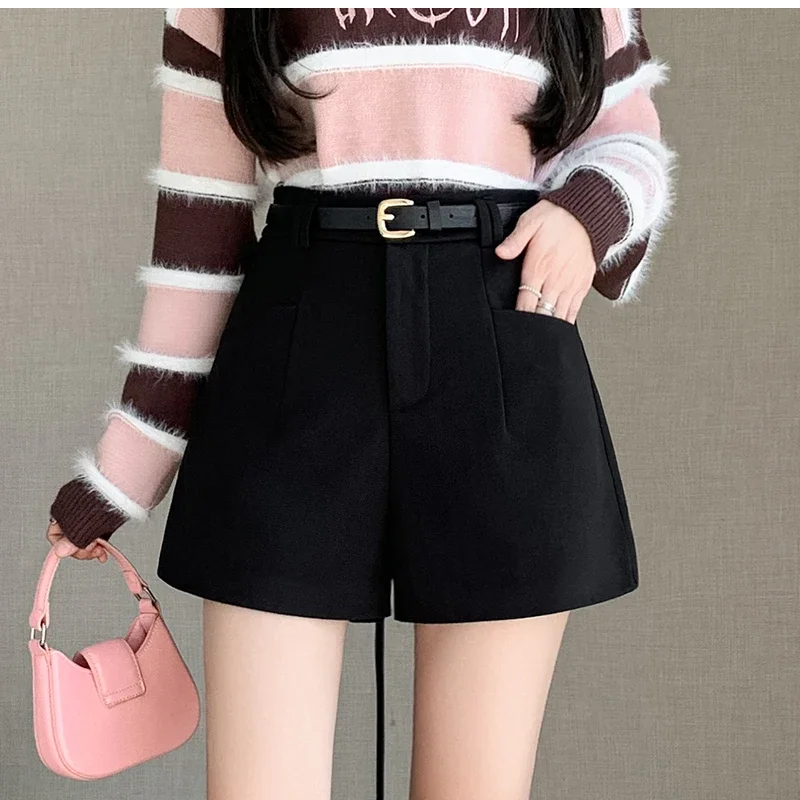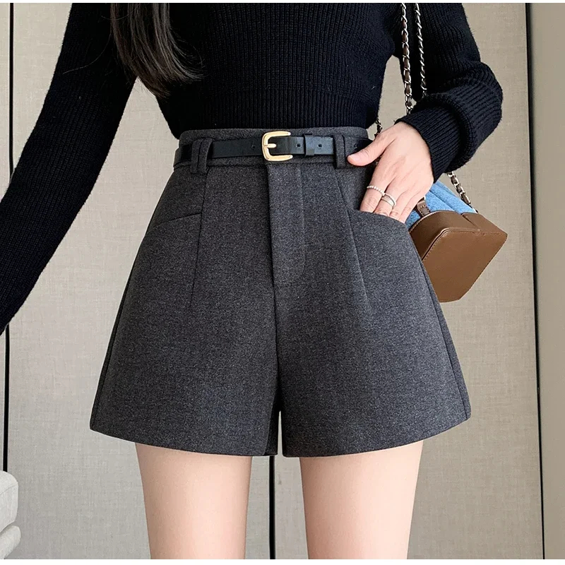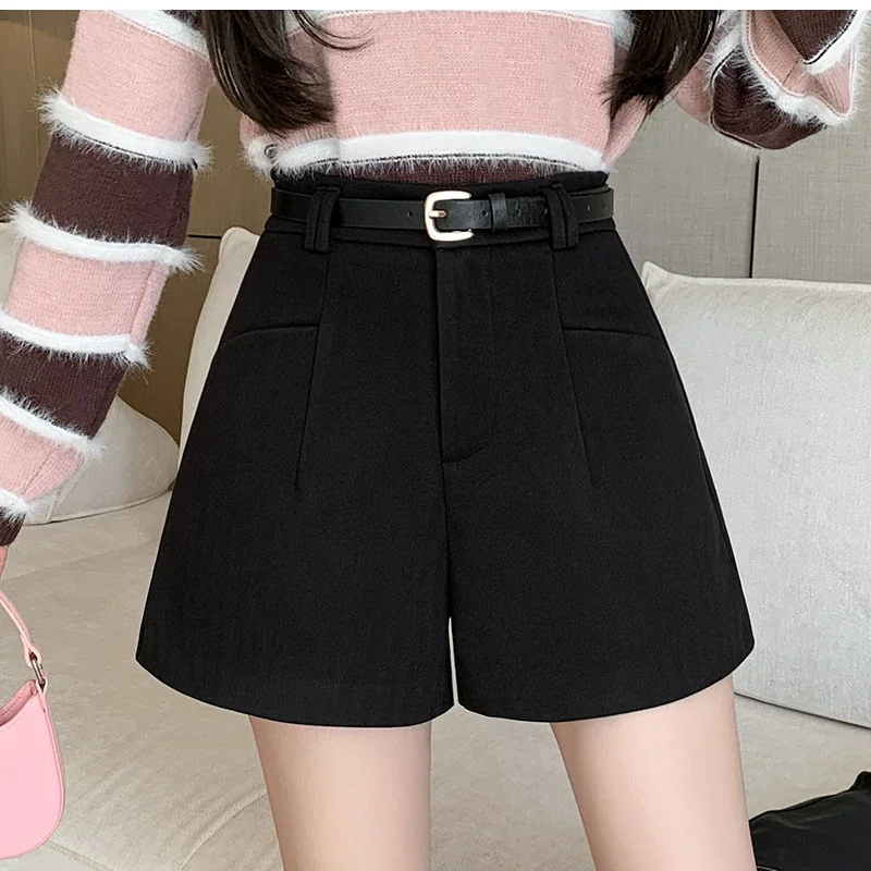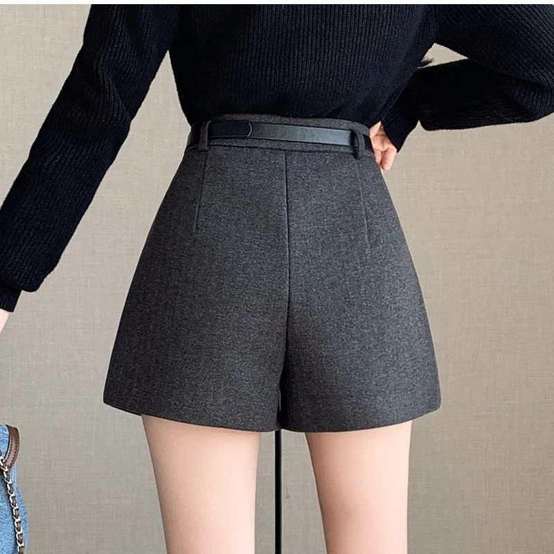 Description: These women’s shorts are a versatile addition to your wardrobe. Made of soft and warm fabric, they ensure comfort in autumn and winter. The stylish belt with a statement buckle and front pleats add a sophisticated detail, and the practical pockets enhance both style and functionality. The relaxed A-line fit flatters your figure, making it suitable for daily wear, office settings, or casual winter outings. Pair it with sweaters, blouses, or turtlenecks for a chic look that can be accessorized to suit various occasions. Stay comfortable and fashionable with this trendy short.