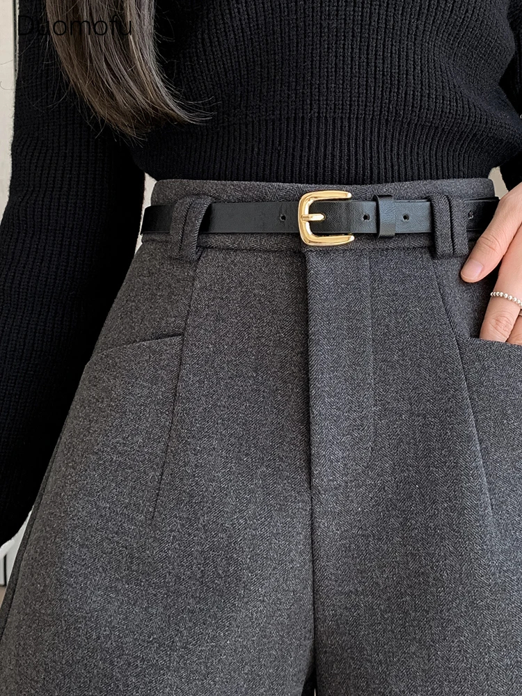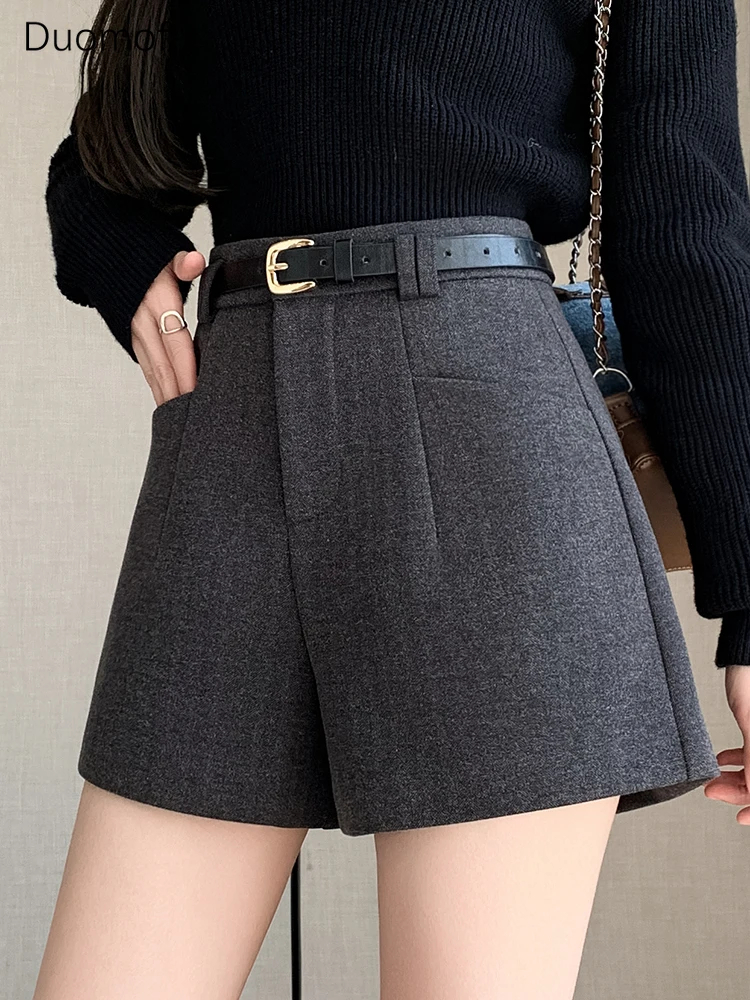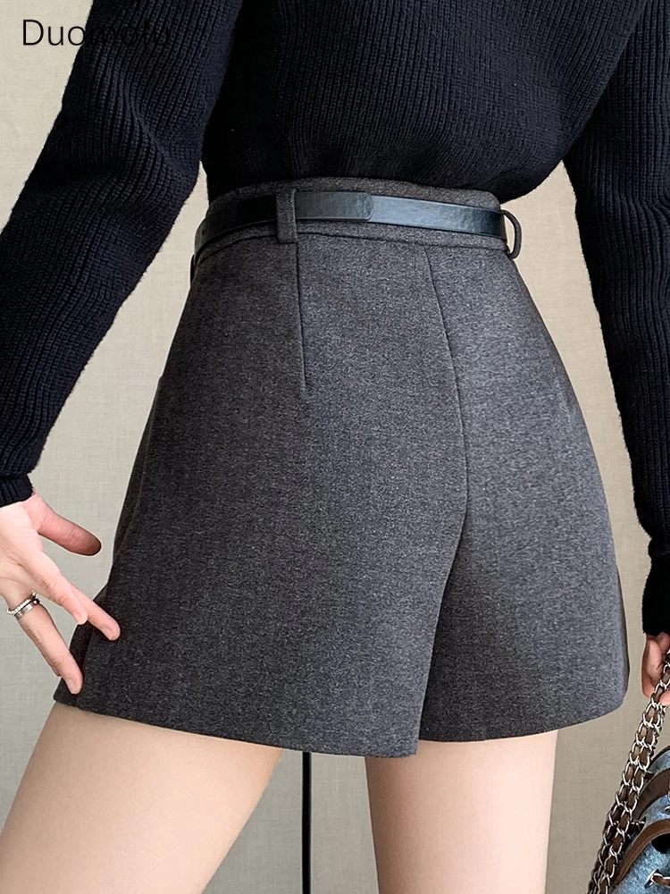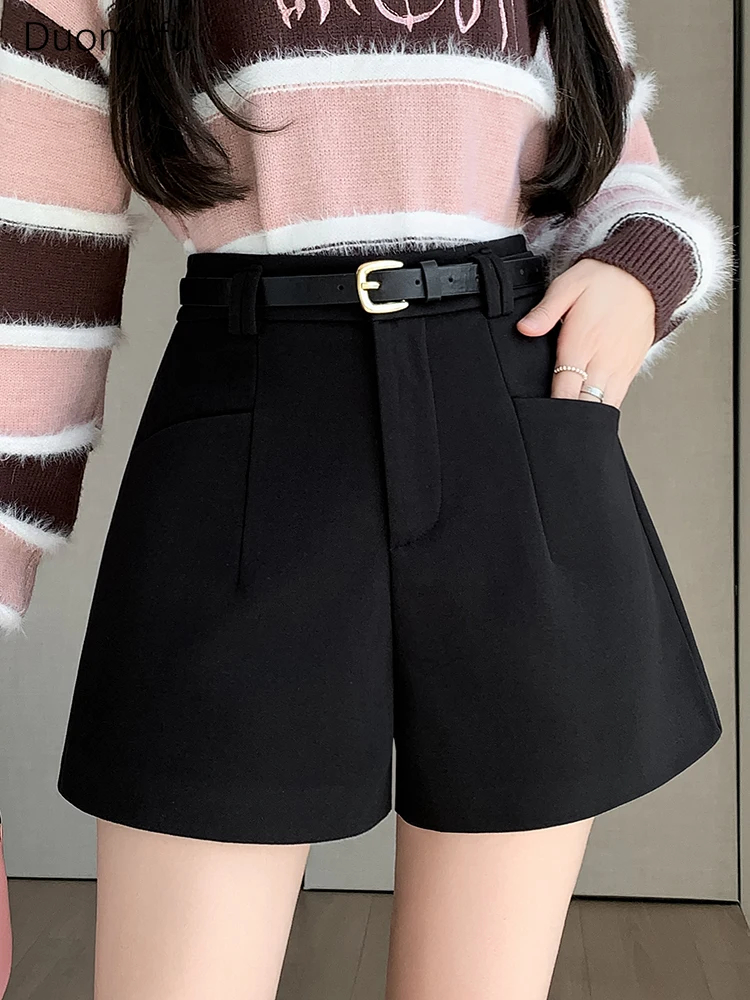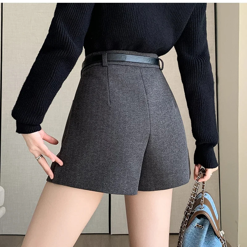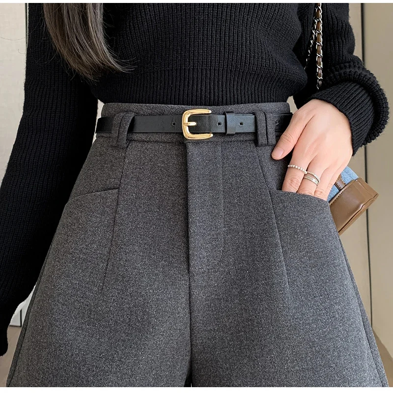 Description: These women’s shorts are a versatile addition to your wardrobe. Made of soft and warm fabric, they ensure comfort in autumn and winter. The stylish belt with a statement buckle and front pleats add a sophisticated detail, and the practical pockets enhance both style and functionality. The relaxed A-line fit flatters your figure, making it suitable for daily wear, office settings, or casual winter outings. Pair it with sweaters, blouses, or turtlenecks for a chic look that can be accessorized to suit various occasions. Stay comfortable and fashionable with this trendy short.