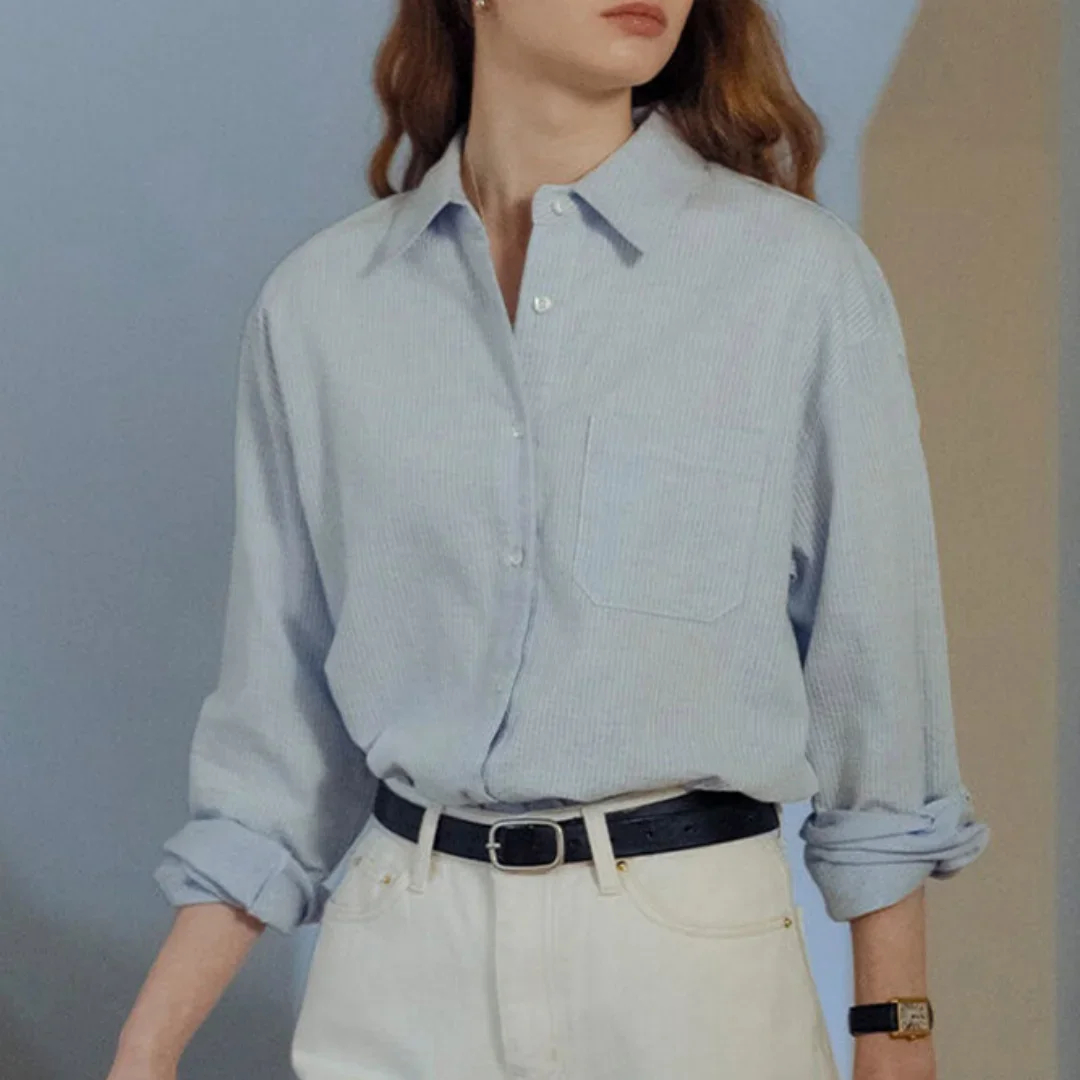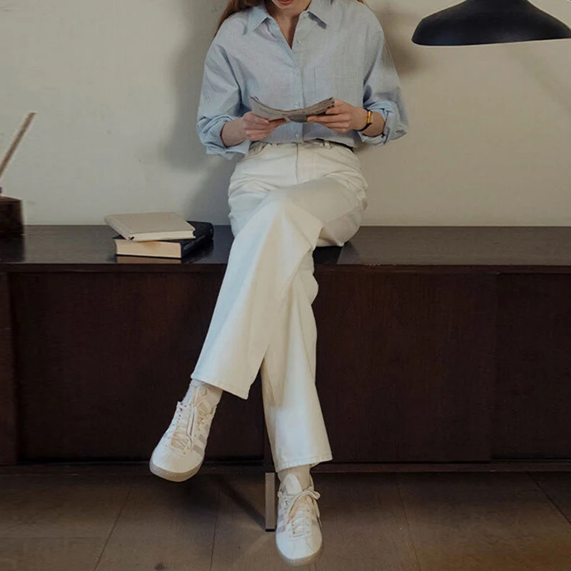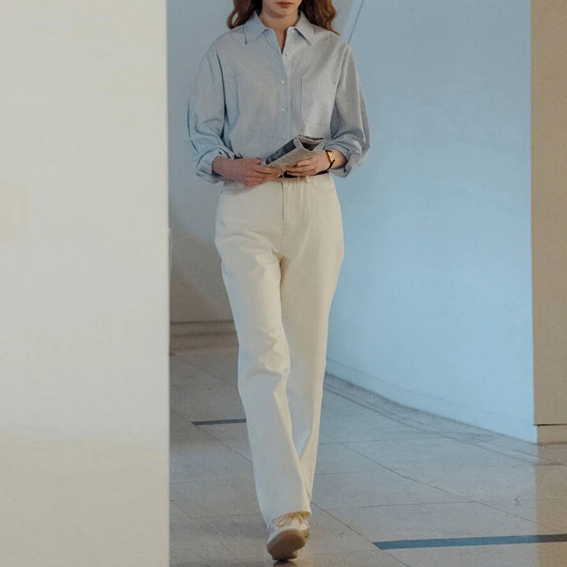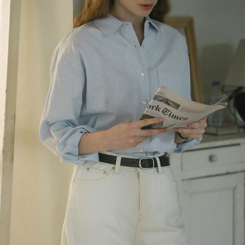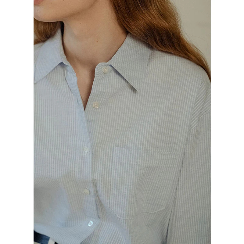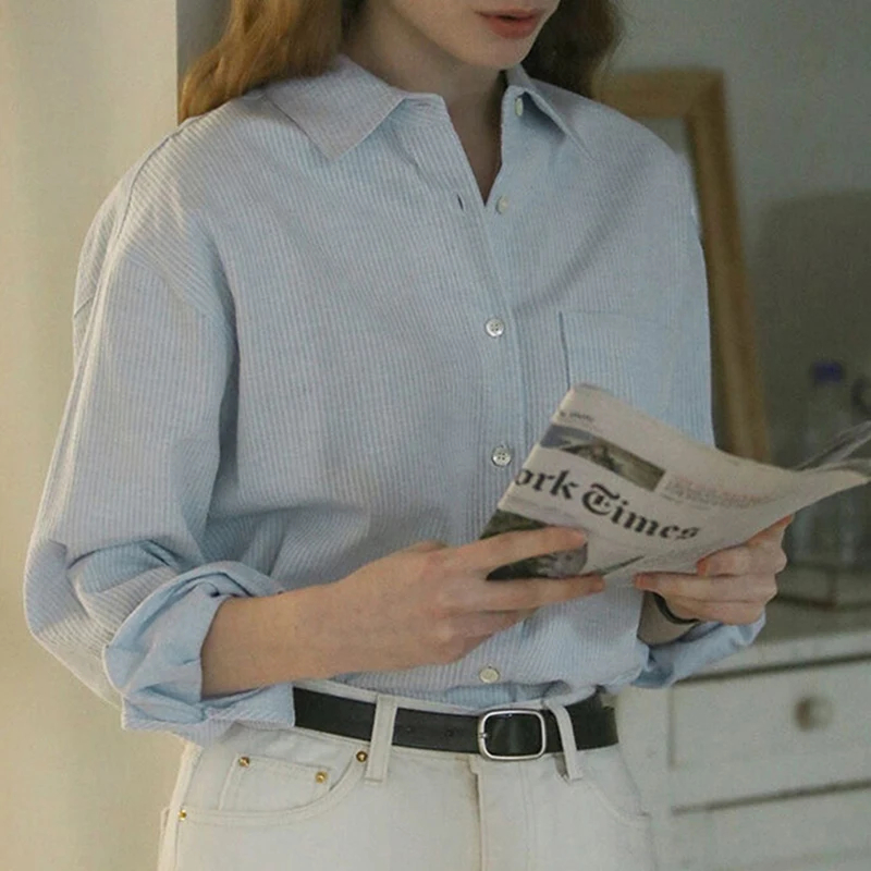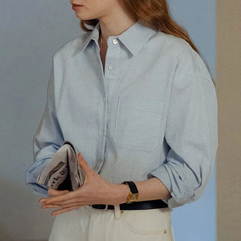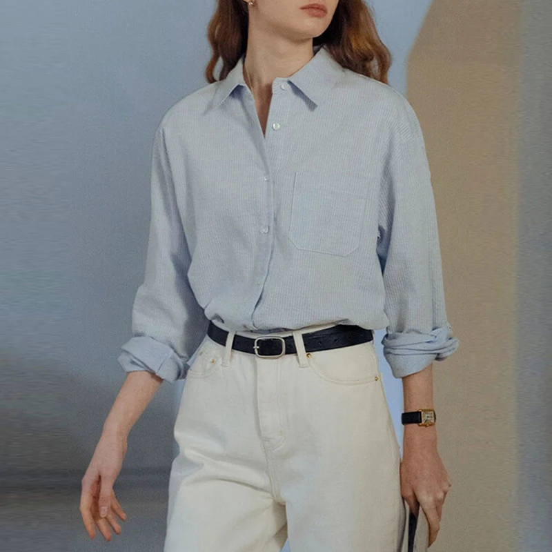 Elegant 100% Cotton Blue Shirt 2024 Autumn Clothing Women's Blouse Commuter Single-breasted Loose Formal Shirt Cardigan Lady Top