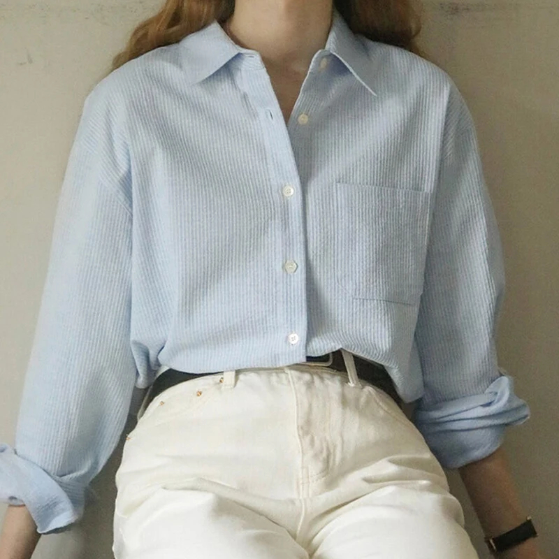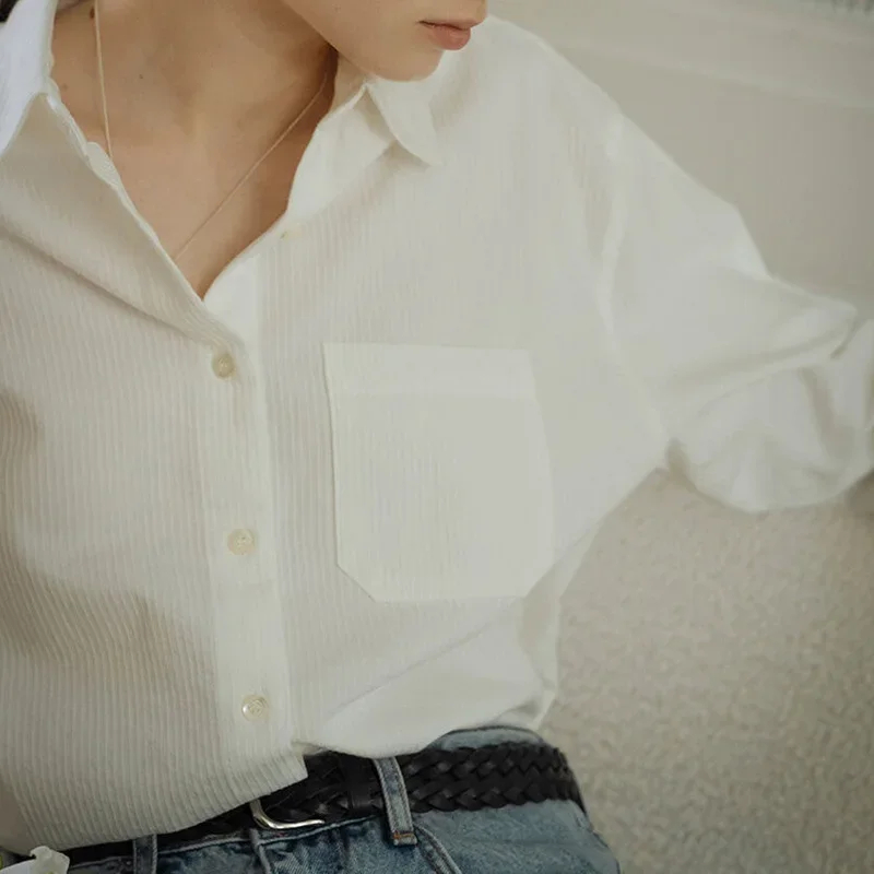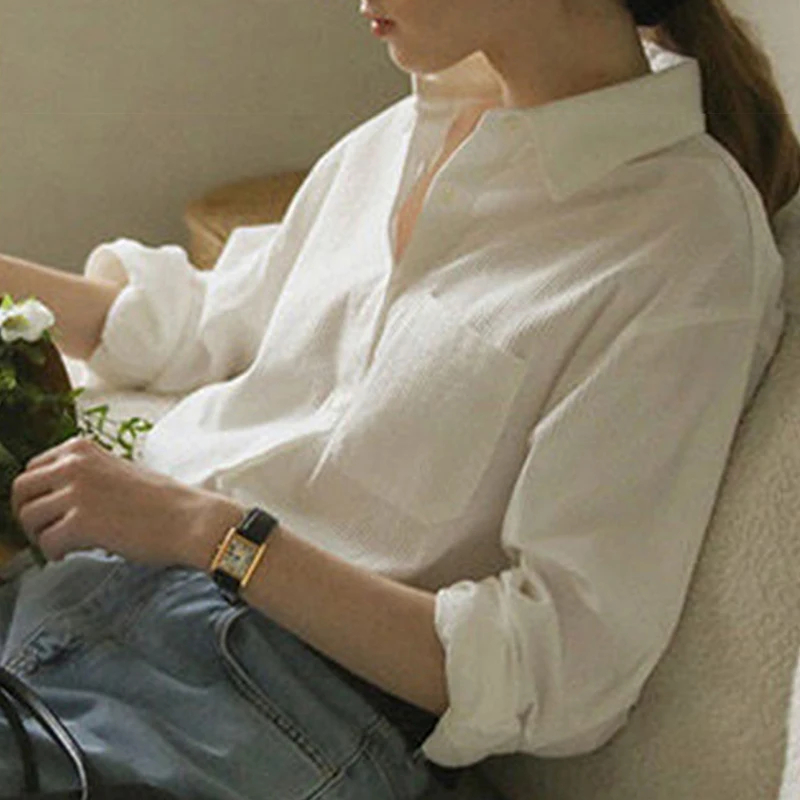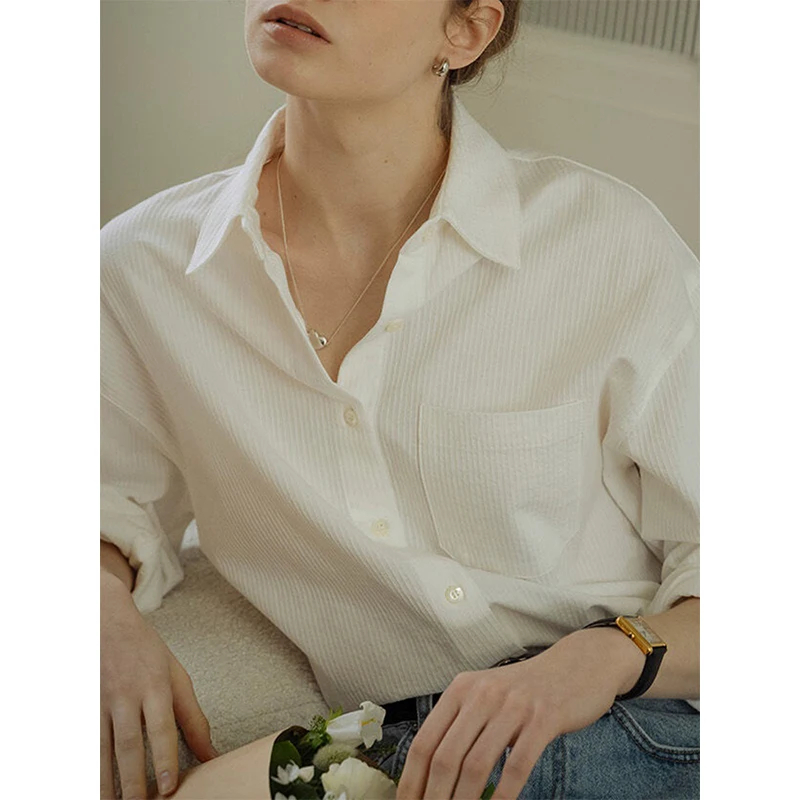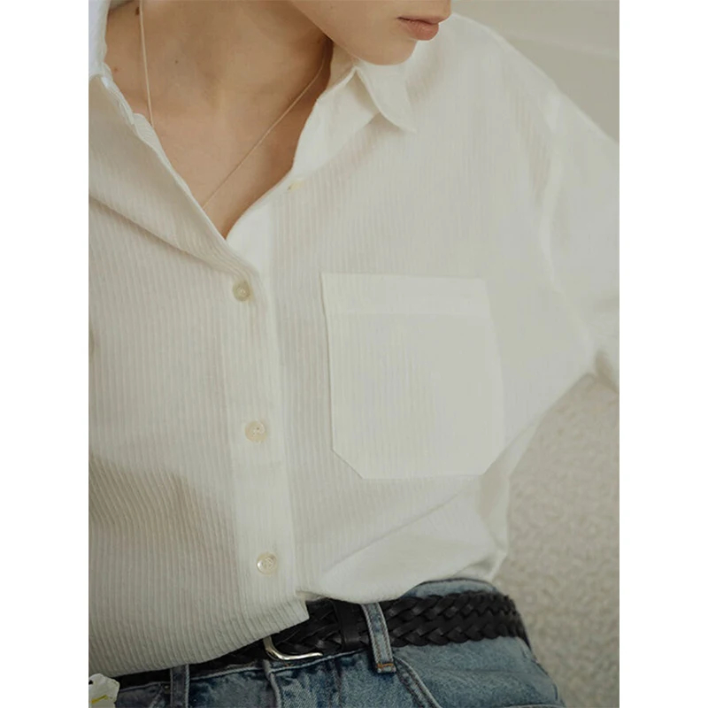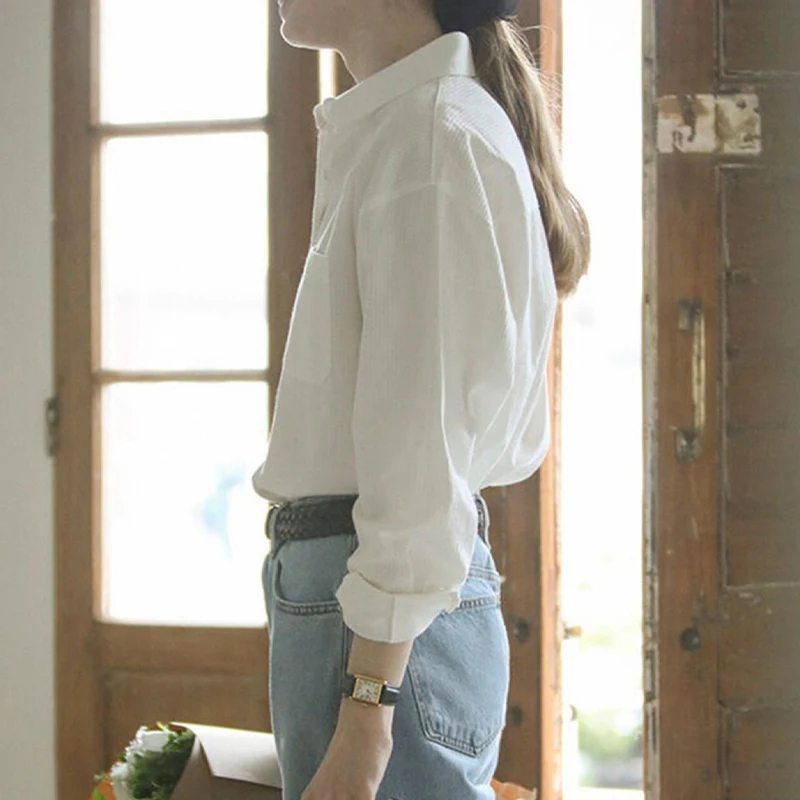 Description: This women’s long-sleeved cotton shirt is a versatile addition to your wardrobe. Made of soft and breathable cotton fabric, it brings a touch of timeless style to any outfit. The classic collar and chest pocket add a subtle detail, and the oversized fit ensures comfort and a laid-back look. Suitable for daily wear, weekend outings, or a casual work environment, pair it with jeans, skirts, or pants and accessorize to create looks that suit various occasions. Stay stylish and comfortable with this evergreen shirt.