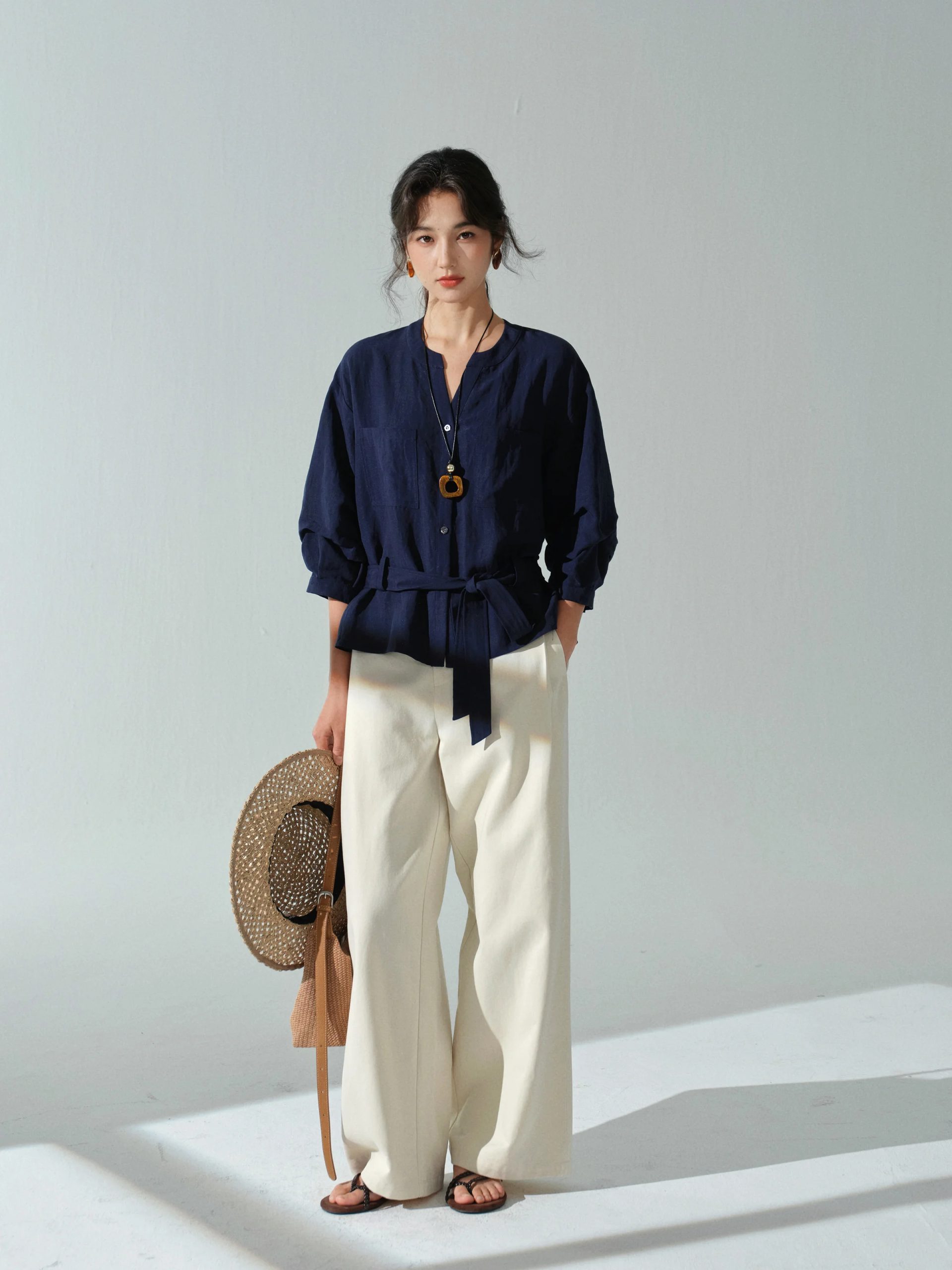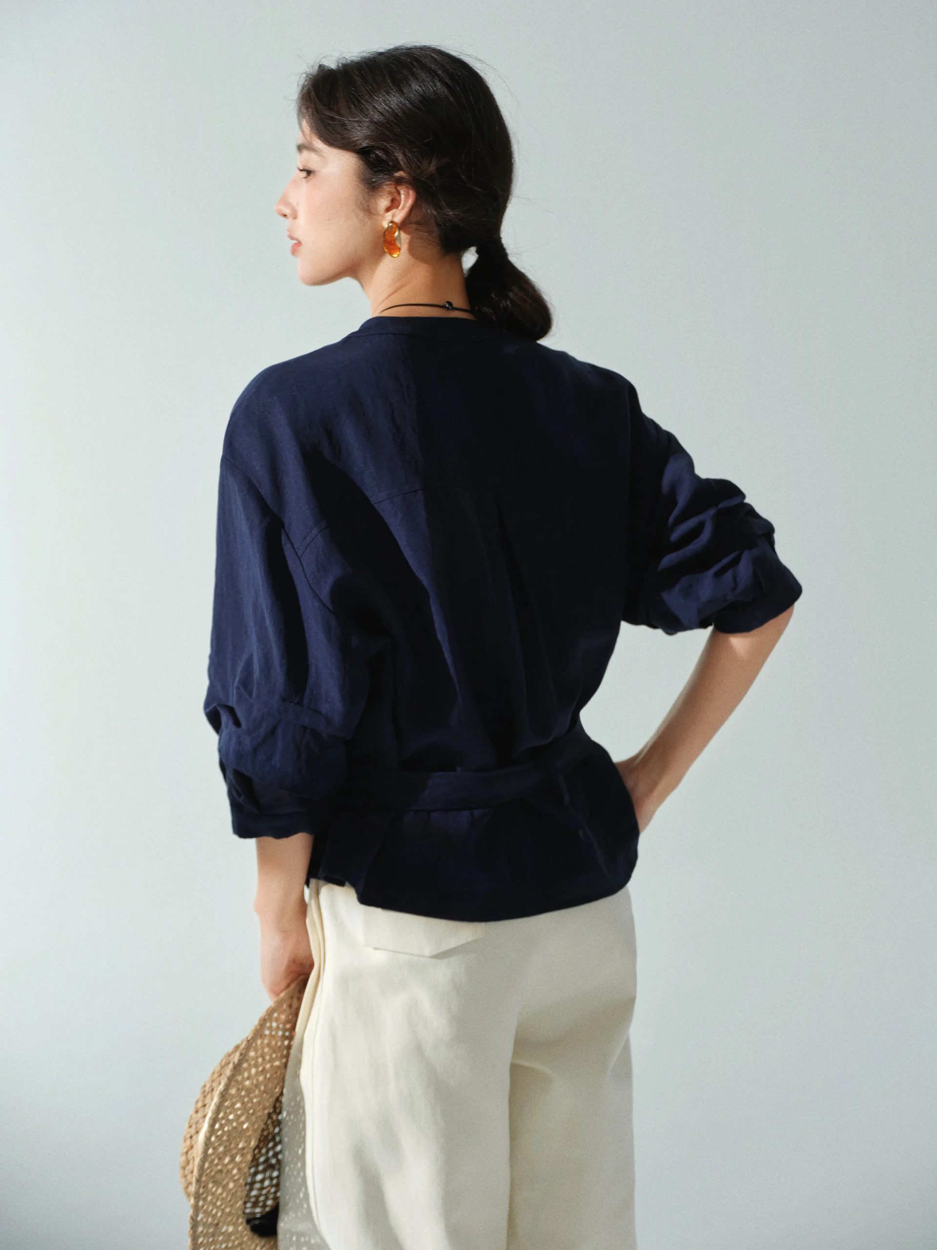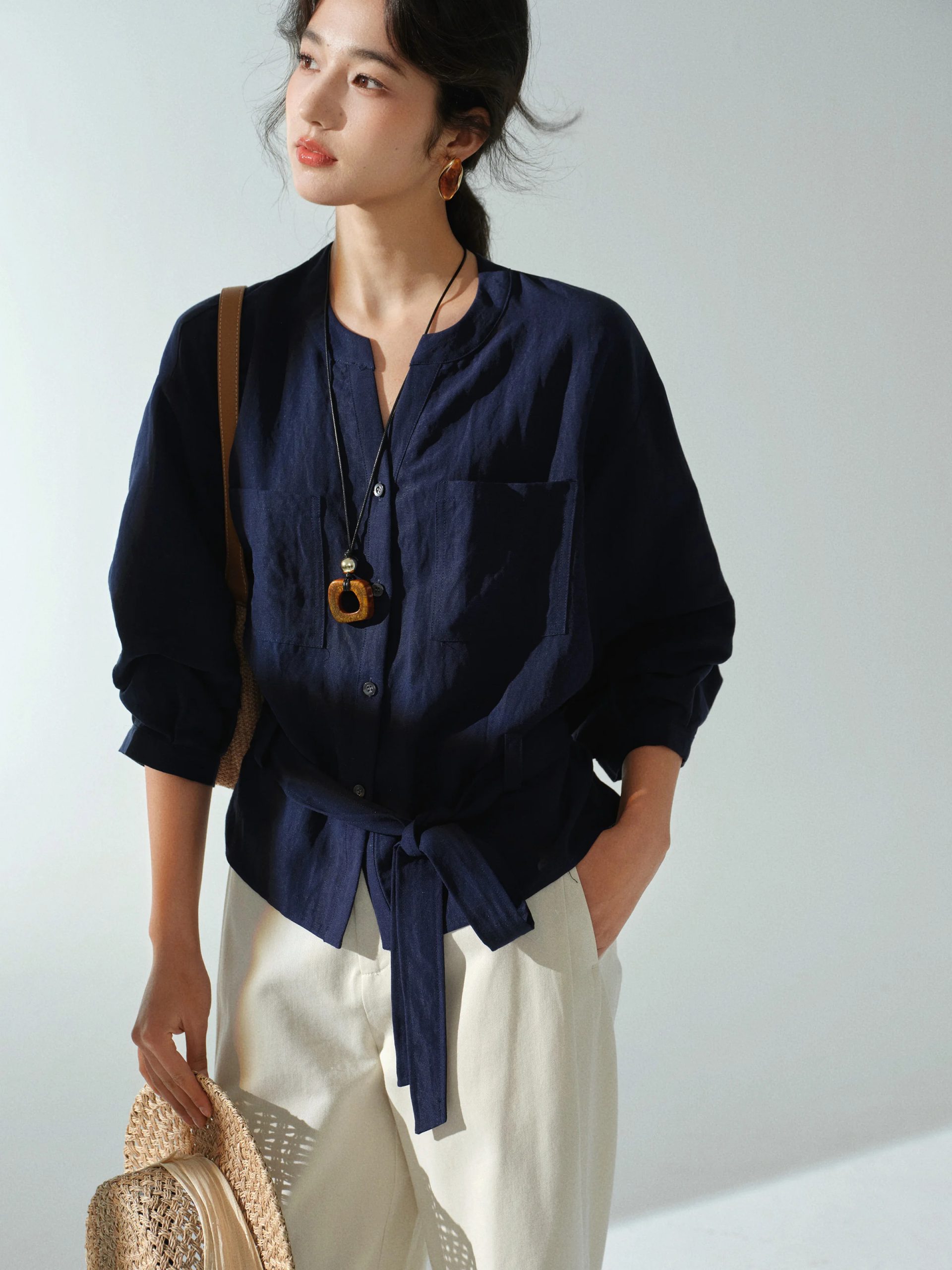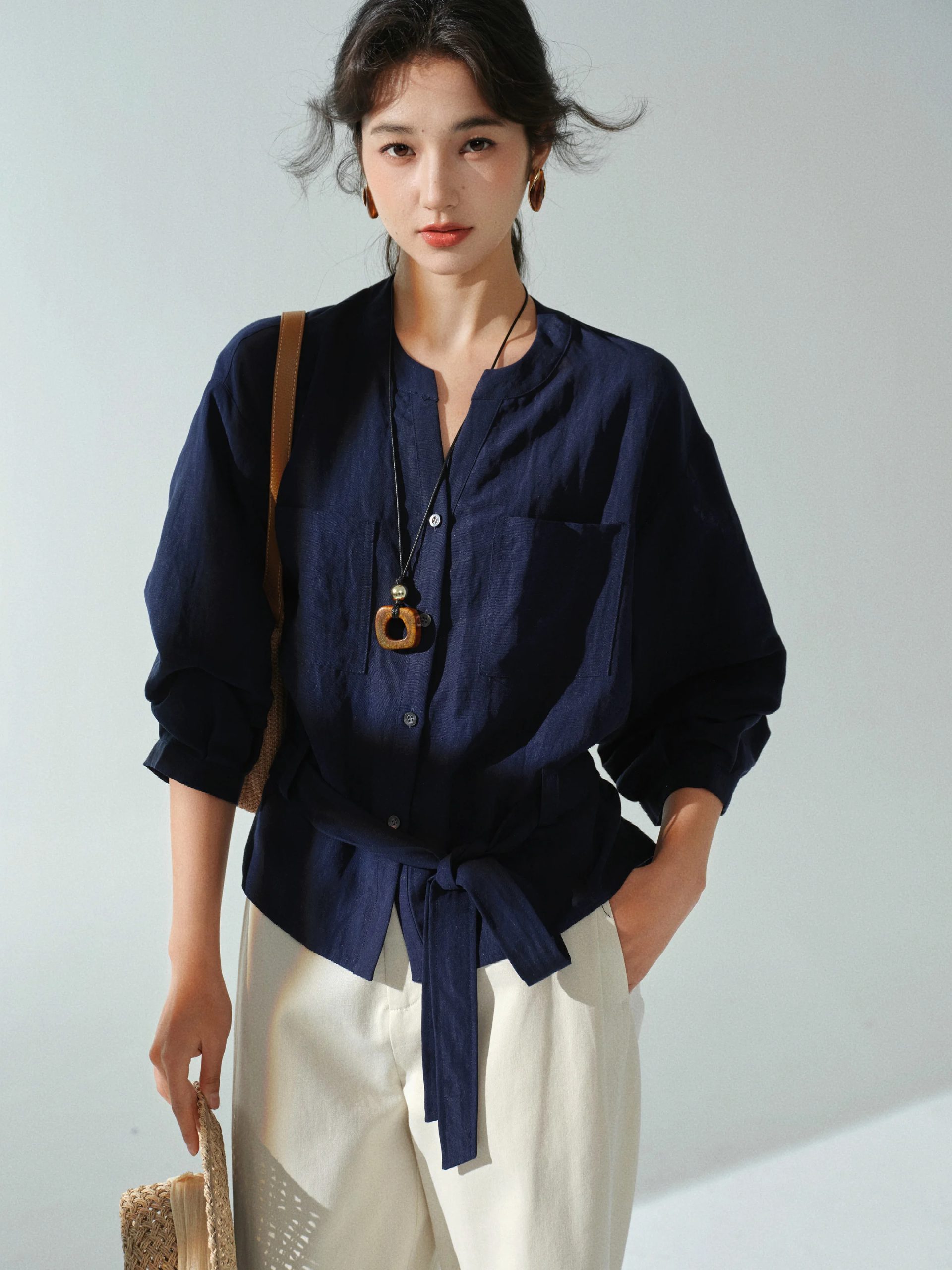 Description: This women’s long-sleeved solid color blouse is a versatile staple for your wardrobe. Crafted from light and breathable linen fabric, it offers a comfortable and stylish wear across multiple seasons. The elegant V-neck and partial button placket bring a timeless charm, while the waist tie adds a fashionable and functional detail. The relaxed fit, with the option to cinch the waist, flatters your figure, making it suitable for daily wear, office settings, or casual outings. Pair it with trousers, skirts, or jeans for a chic look that can be accessorized to match various occasions. Stay comfortable and fashionable with this essential linen blouse.