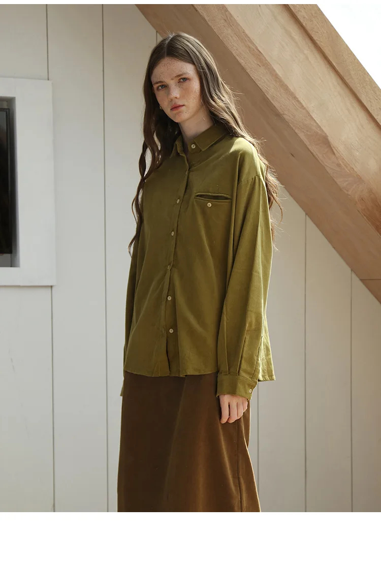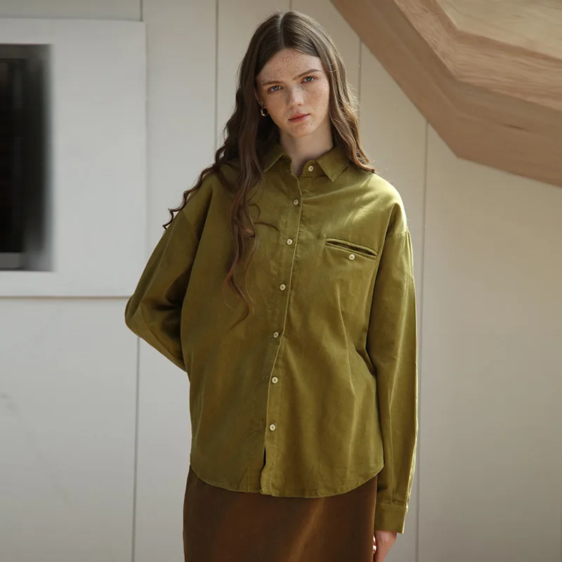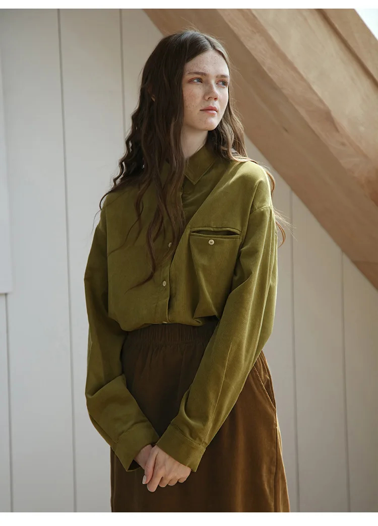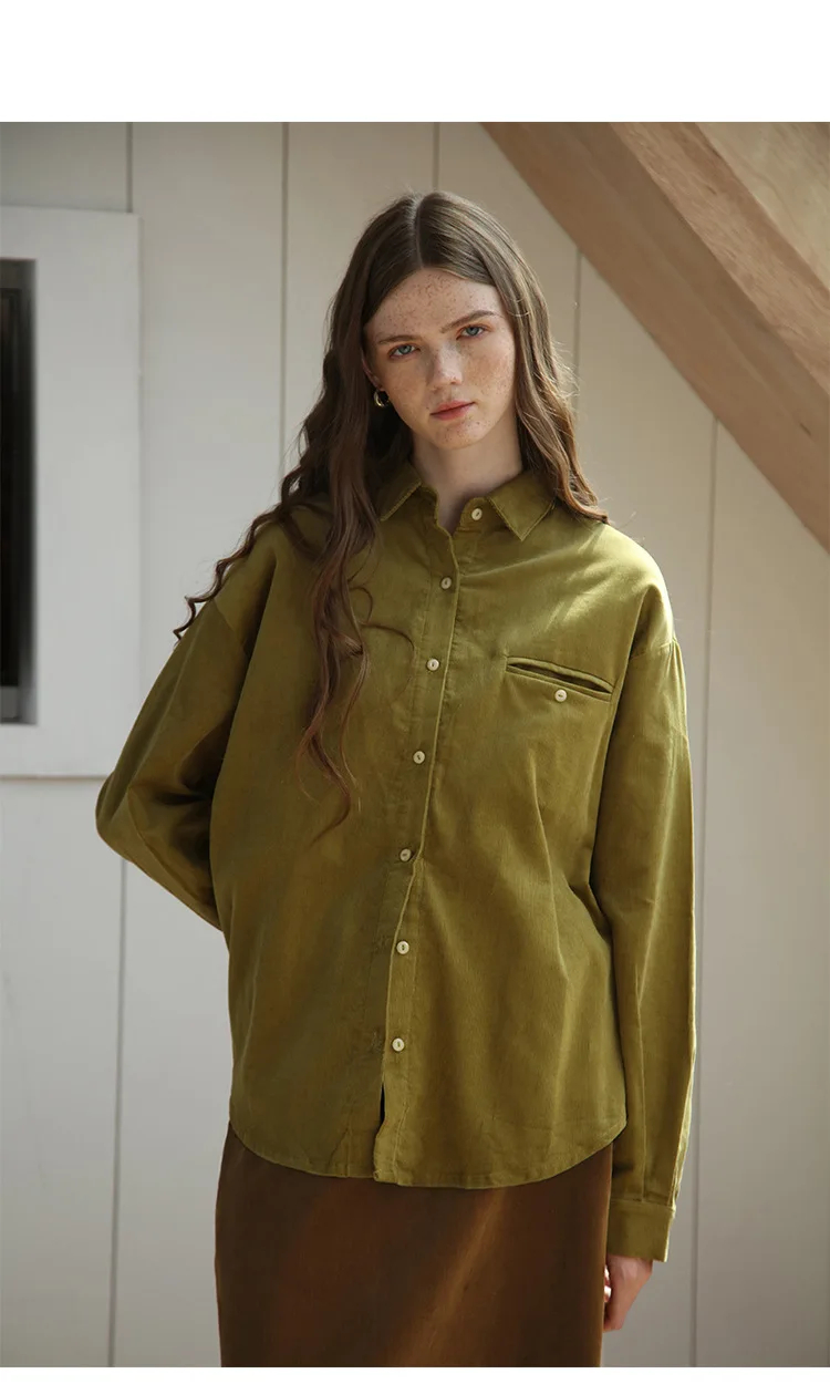 Description: This women’s long-sleeved corduroy shirt is a versatile addition to your wardrobe. Made of soft and textured corduroy fabric, it ensures comfort and style in autumn and winter. The button-down front and classic collar add a timeless detail, and the oversized fit allows for effortless styling. Suitable for daily wear, casual outings, or autumn styling, pair it with skirts, pants, or jeans for a chic look that can be accessorized to suit various occasions. Stay comfortable and fashionable with this trendy shirt.