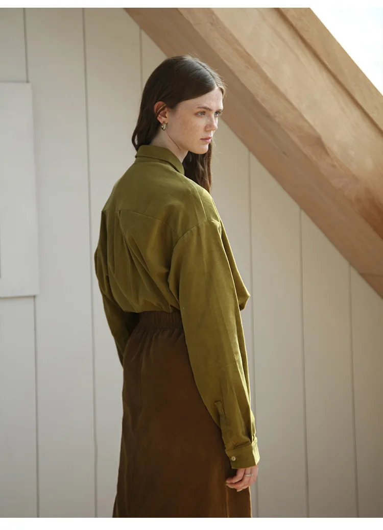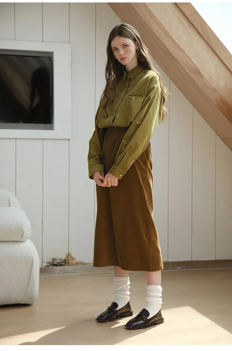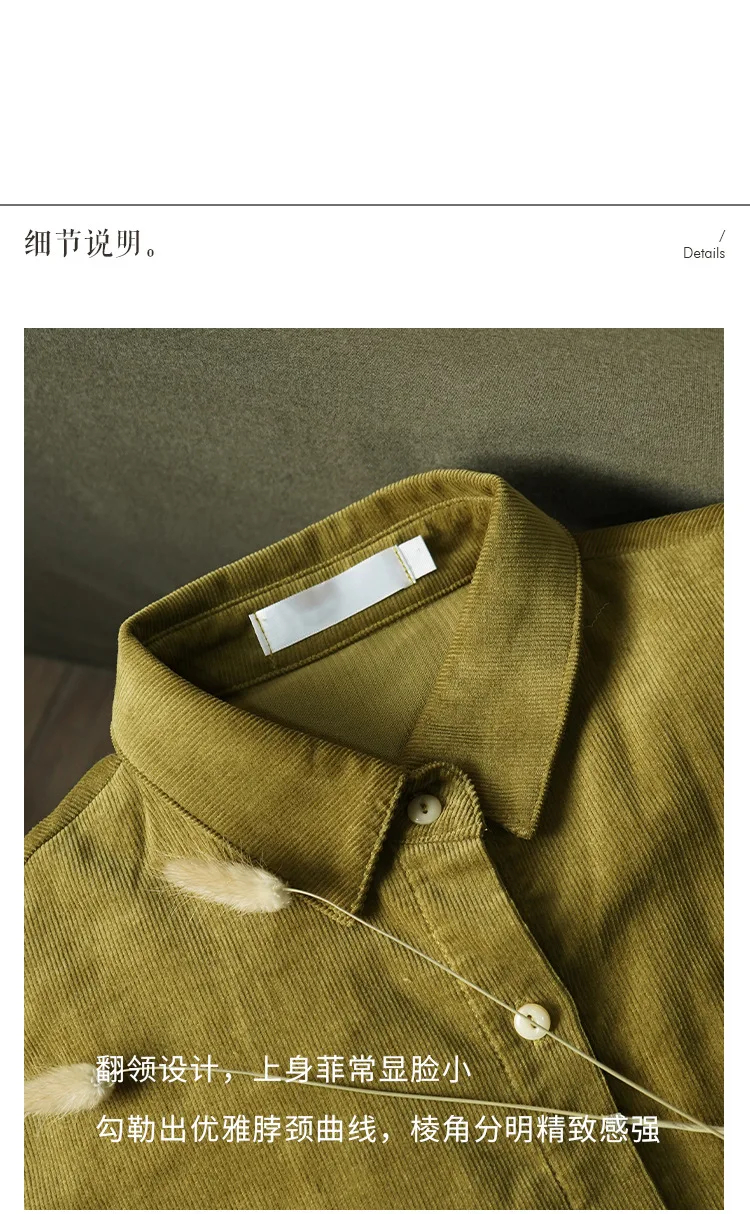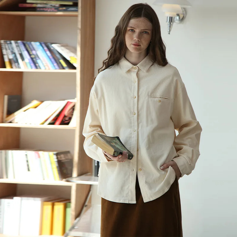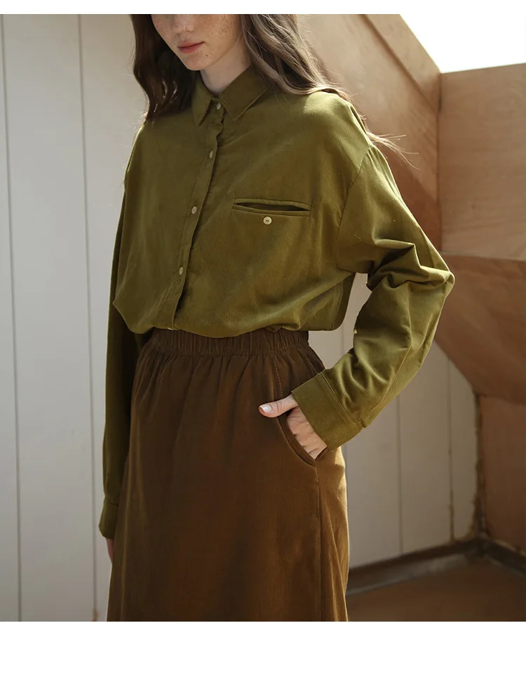 Description: This women’s long-sleeved corduroy shirt is a versatile addition to your wardrobe. Made of soft and textured corduroy fabric, it ensures comfort and style in autumn and winter. The button-down front and classic collar add a timeless detail, and the oversized fit allows for effortless styling. Suitable for daily wear, casual outings, or autumn styling, pair it with skirts, pants, or jeans for a chic look that can be accessorized to suit various occasions. Stay comfortable and fashionable with this trendy shirt.