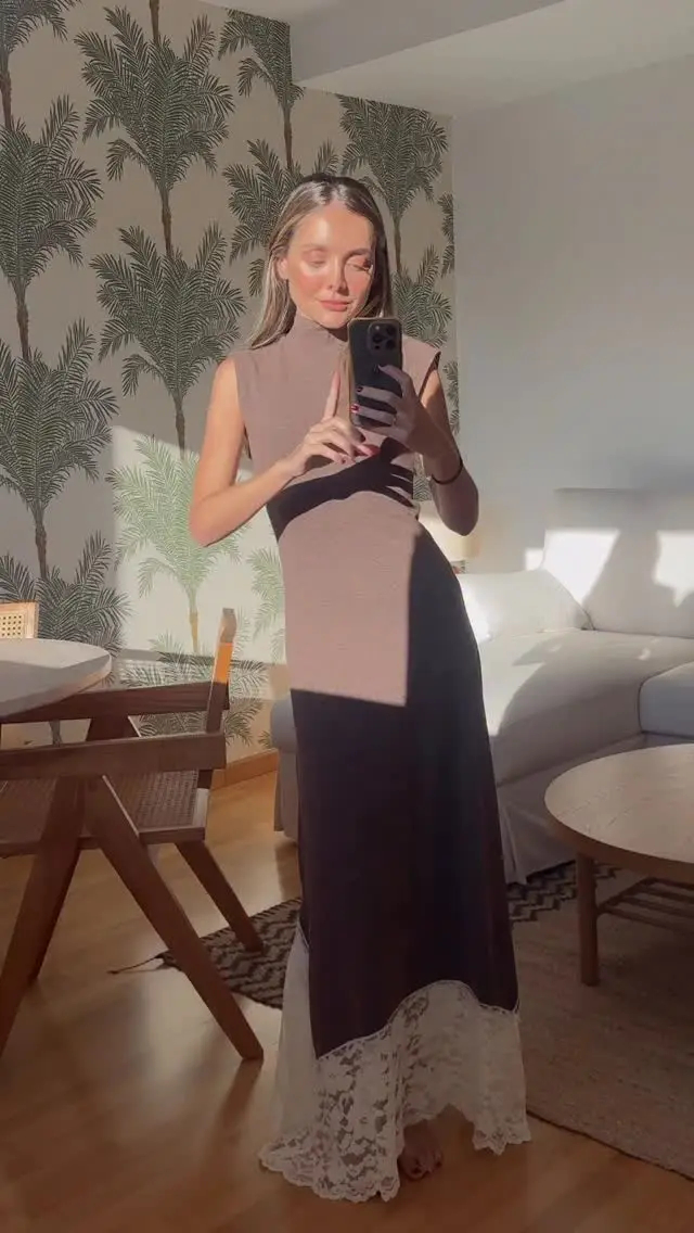 Elegant Lace Hem Long Knitted Dress Women Casual Patchwork Sleeveless Turtleneck Slim Dresses 2025 Lady Daily Commute Vestidos