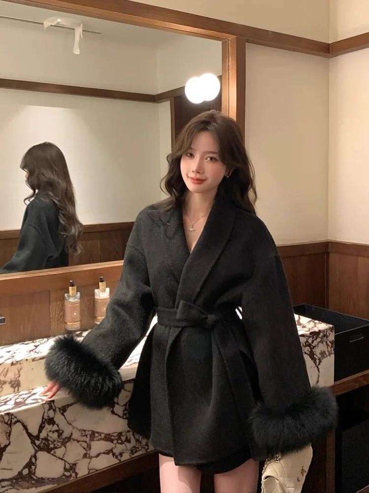 Elegant Lace Up Woolen Coat Women Furry Lapel Fur Patchwork Belt Loose Short Jacket Female Lady 2025 Autumn Winter New Cardigans