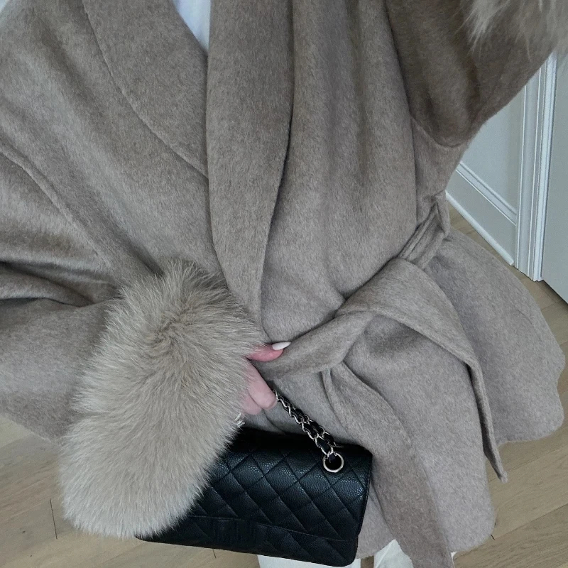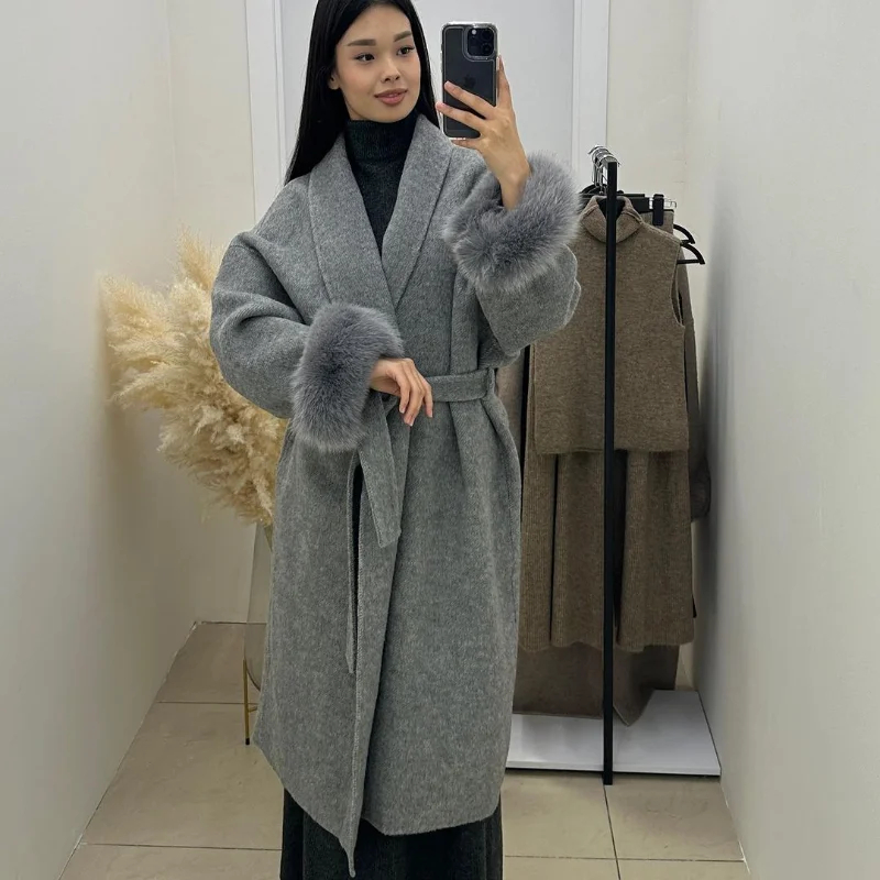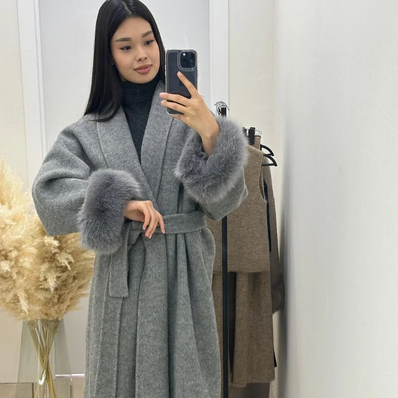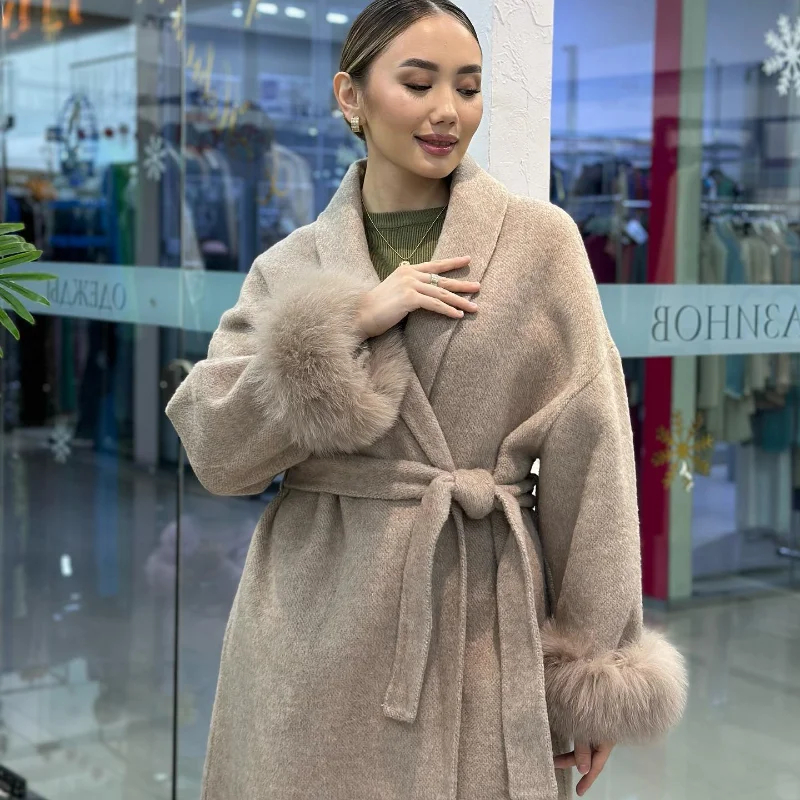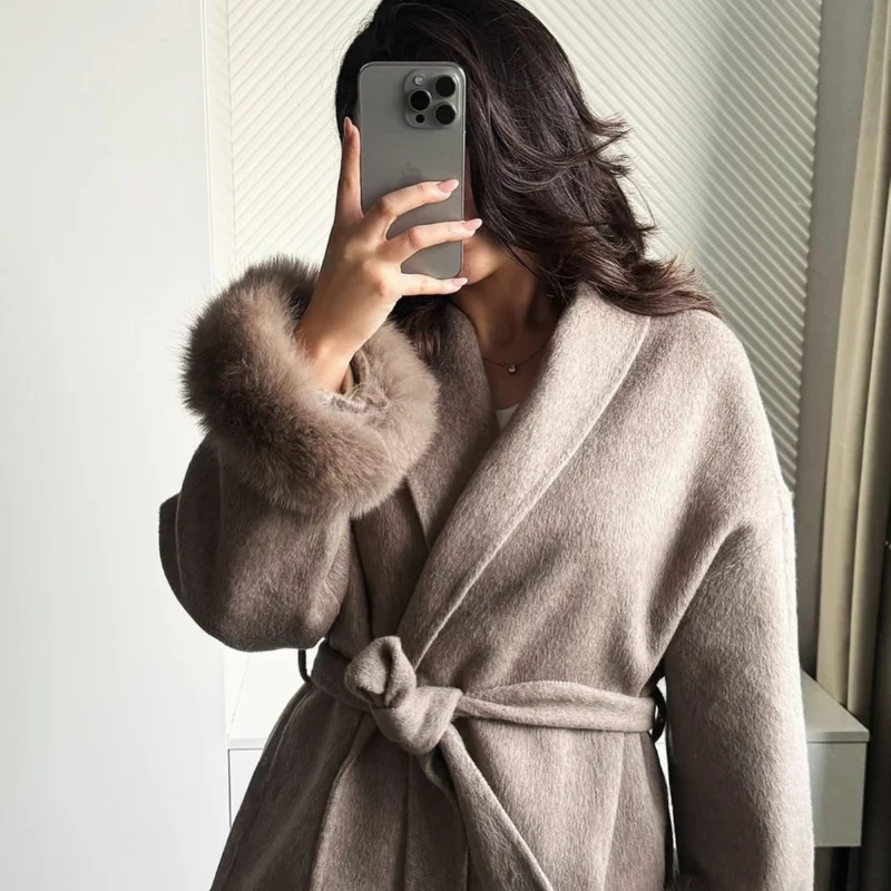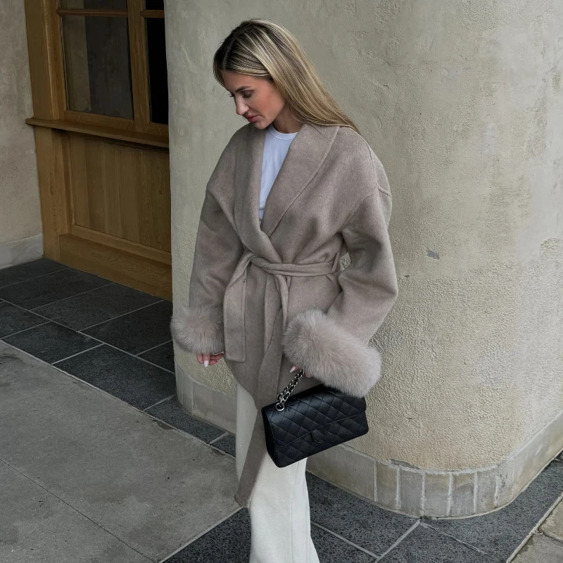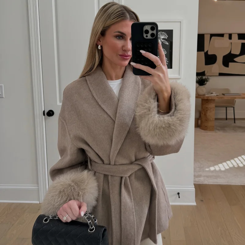 Description: This fur-cuff belted wool-blend coat is a versatile staple for your wardrobe. Made of soft, warm fabric, it combines coziness with glamorous design—featuring a adjustable belt that flatters your figure. Suitable for daily wear, work commutes, or casual gatherings, it transitions effortlessly between styles with simple accessory swaps. Stay comfortable and fashionable in this sleek piece that balances timeless charm with contemporary sophistication.