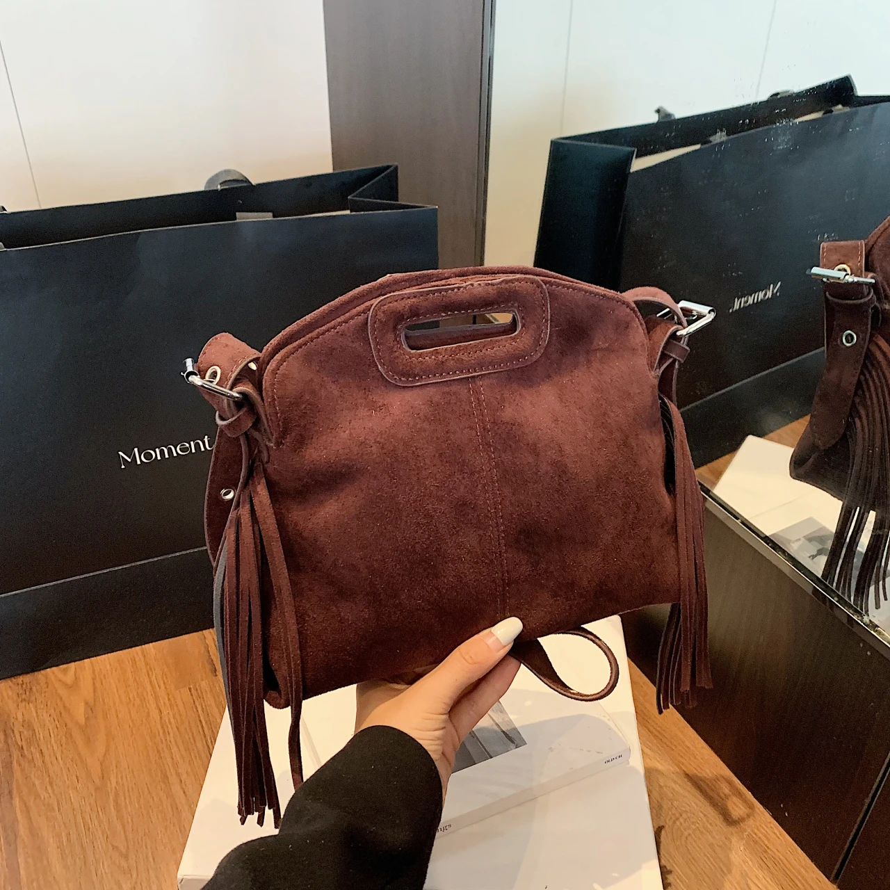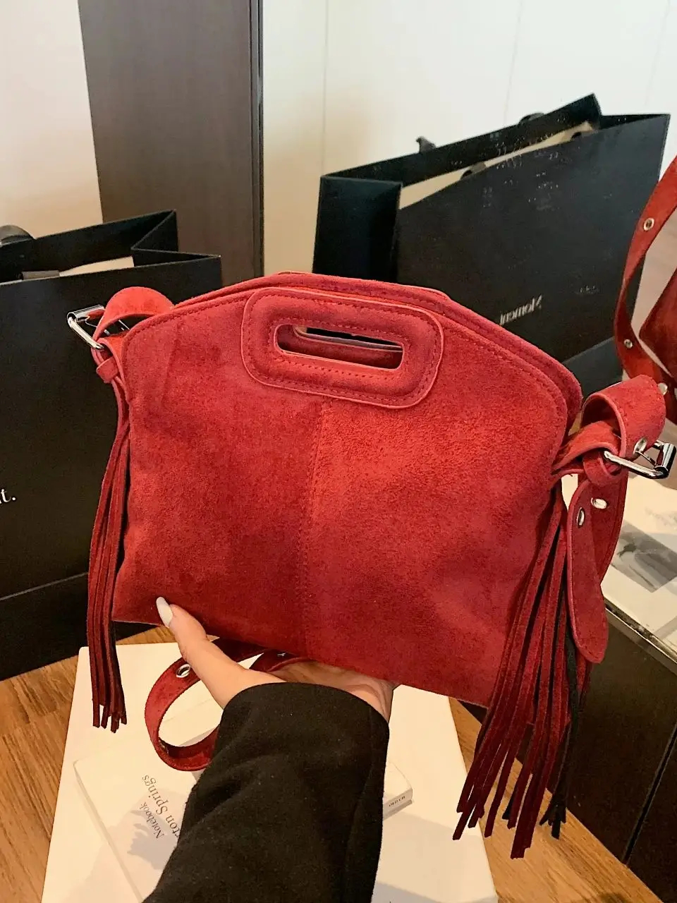 Elevate your look with the side fringe trim—this design adds a playful, dynamic flair, while the structured suede shape ensures the bag holds its elegant form even with the relaxed details and offers ample storage space.