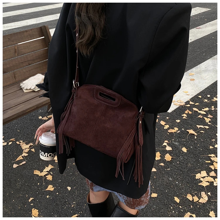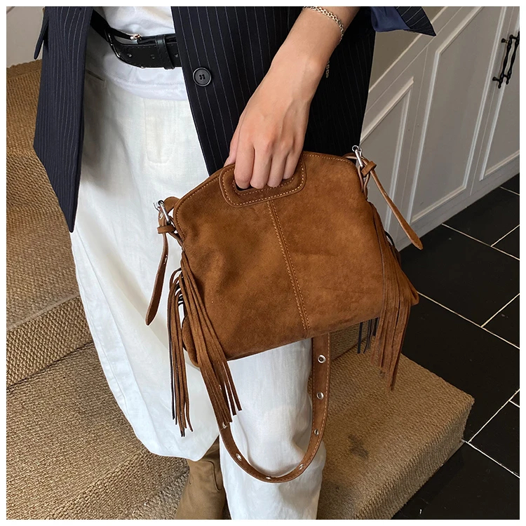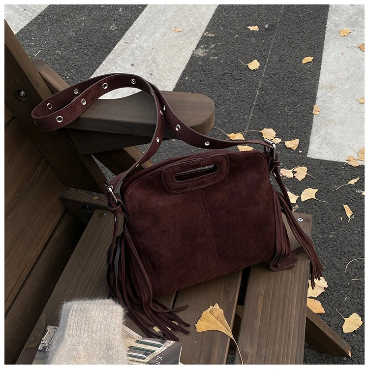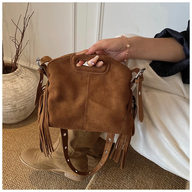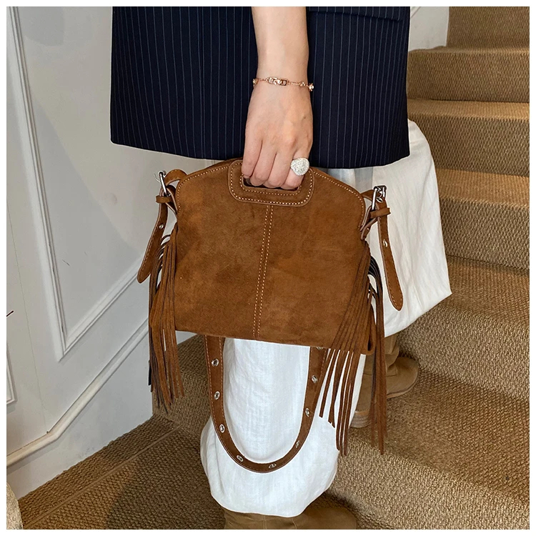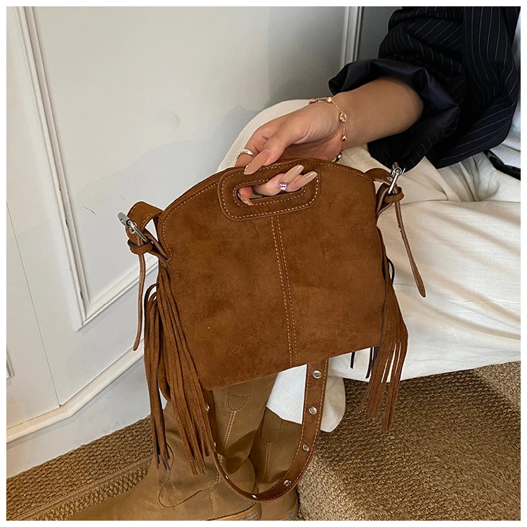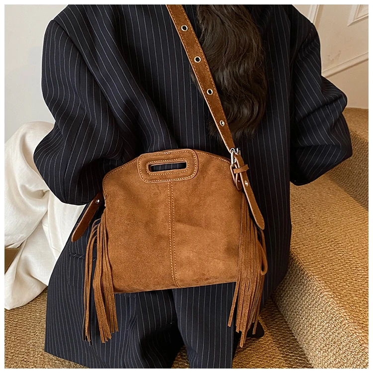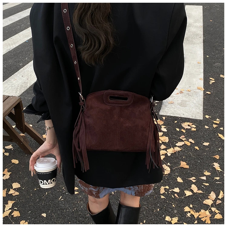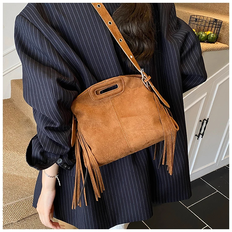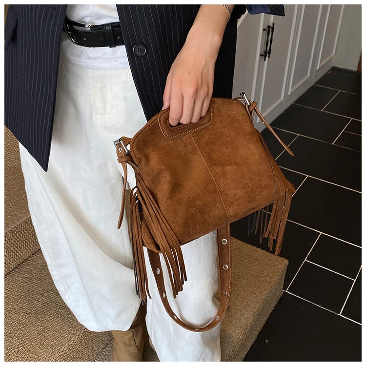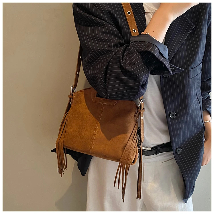 Perfect for various occasions, this bag pairs seamlessly with a denim jacket and jeans for a casual retro look, or with a sweater and skirt for a relaxed weekend ensemble. Customize your look by letting its suede texture and fringe details add a nostalgic, stylish touch to any outfit.