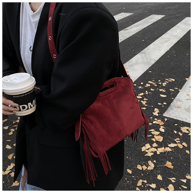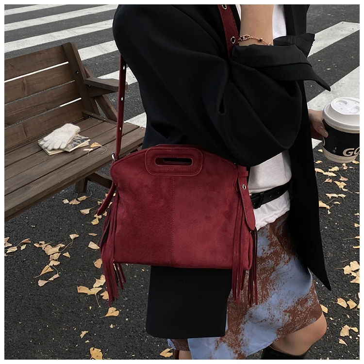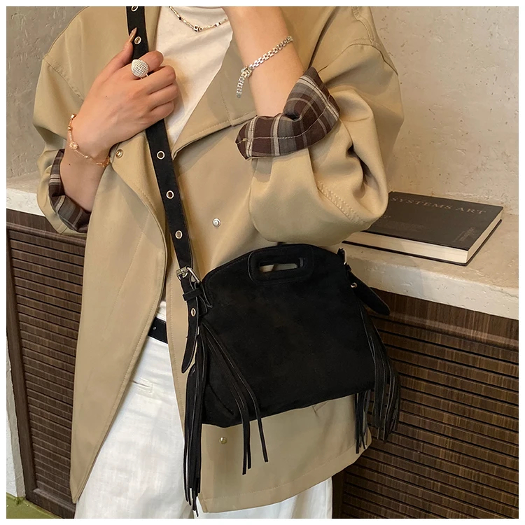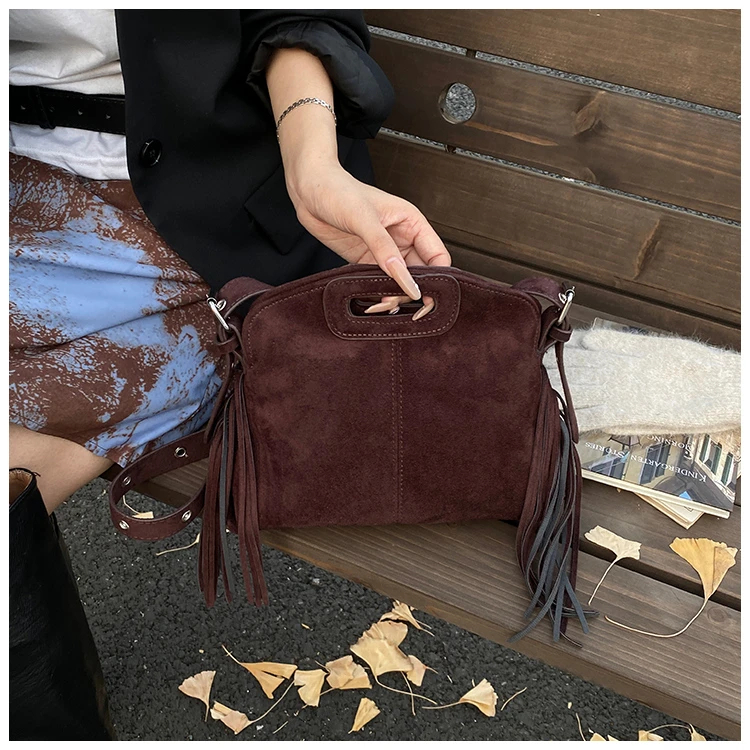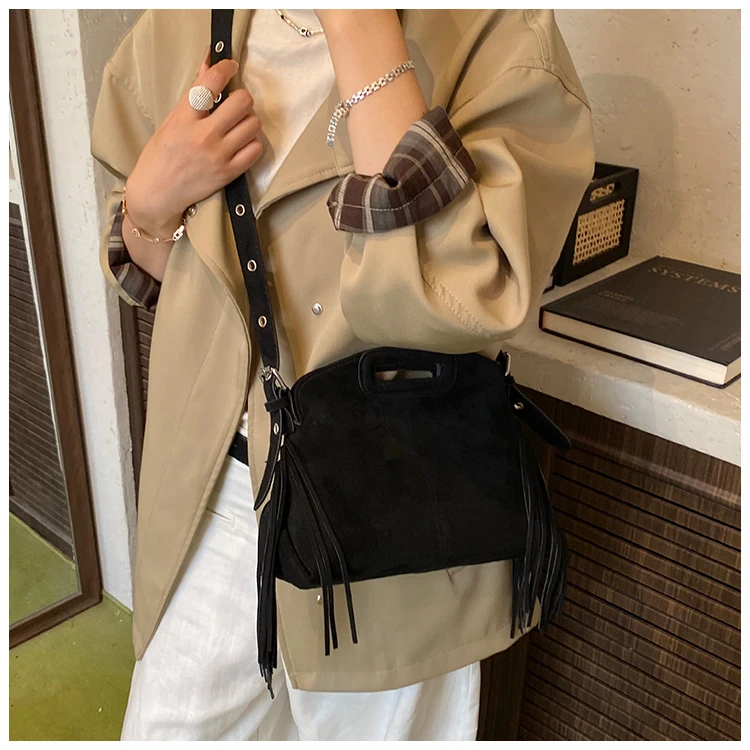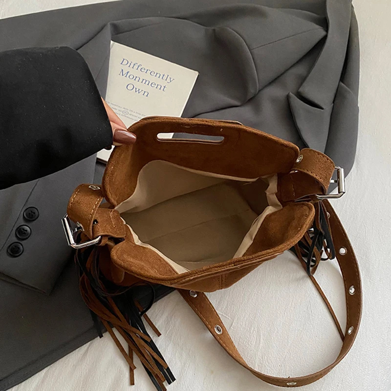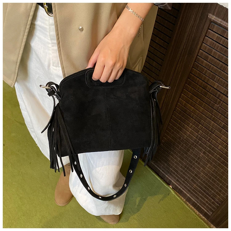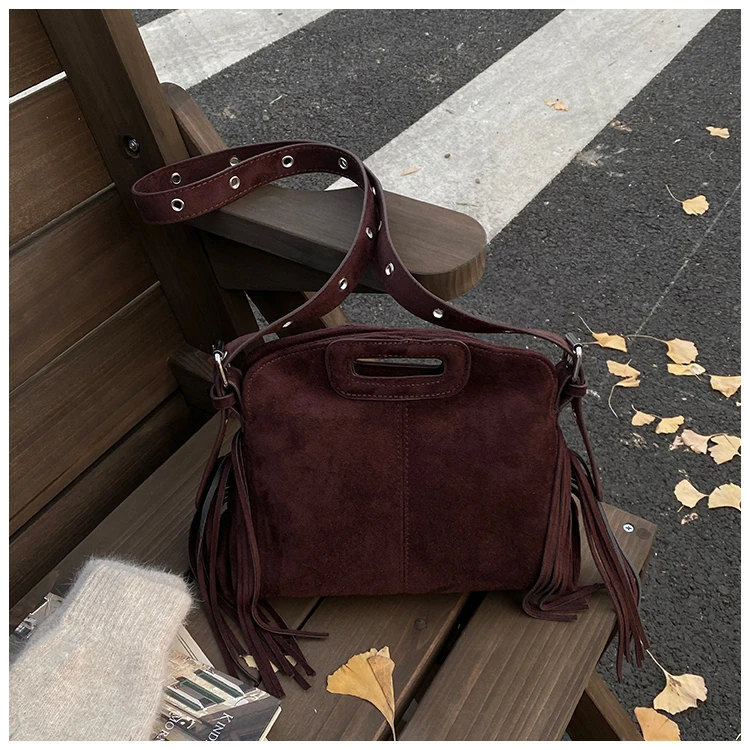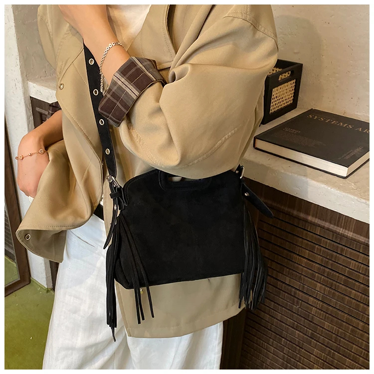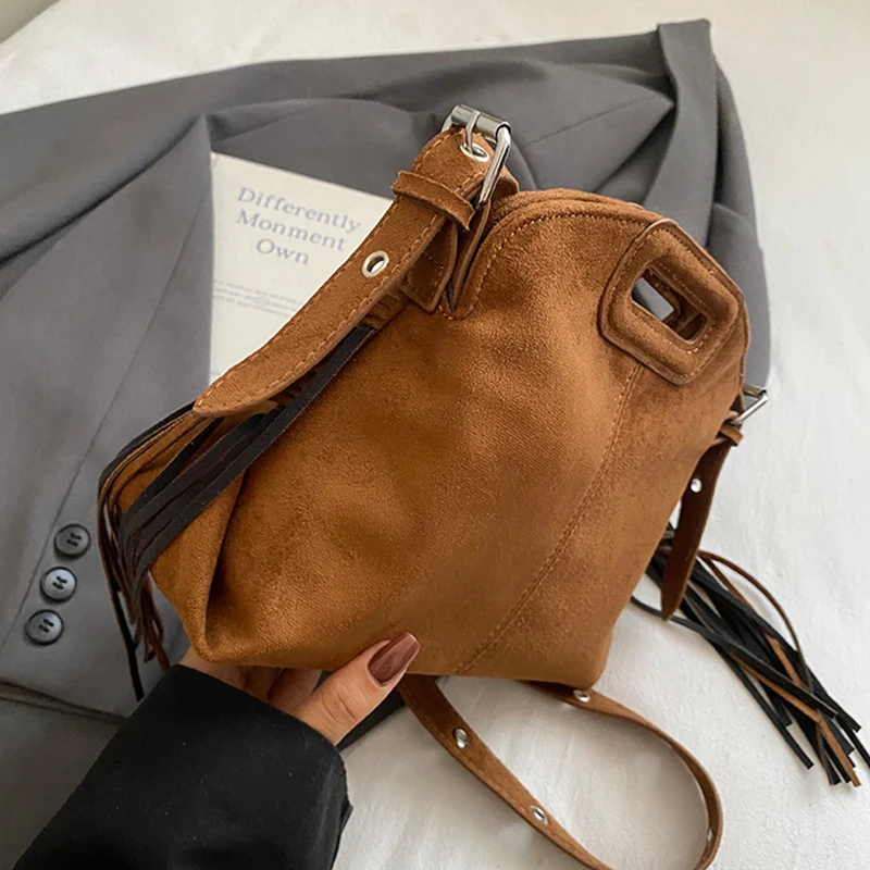 Perfect for various occasions, this bag pairs seamlessly with a denim jacket and jeans for a casual retro look, or with a sweater and skirt for a relaxed weekend ensemble. Customize your look by letting its suede texture and fringe details add a nostalgic, stylish touch to any outfit.