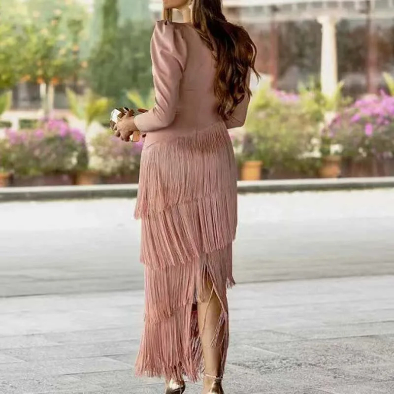 French Elegant Deep V Neck Slim Prom Dresses 2025 Spring Solid Spliced Tassel Long Dress Woman Long Sleeve New Autumn Maxi Dress