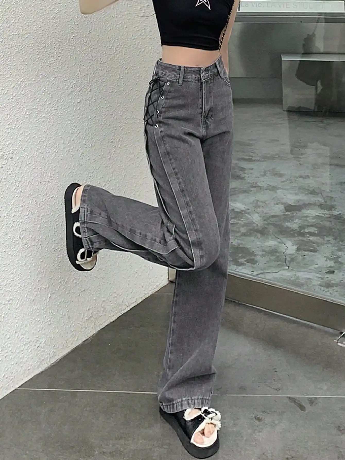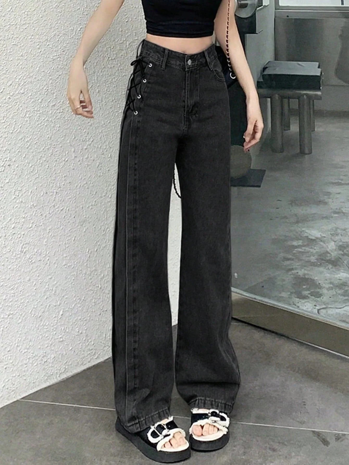 Lace-Up Detail & Wide-Leg Design: Featuring a wide-leg cut with unique lace-up detailing, these jeans add a bold touch to your look while providing ample room for free movement, making them stand out in various occasions.