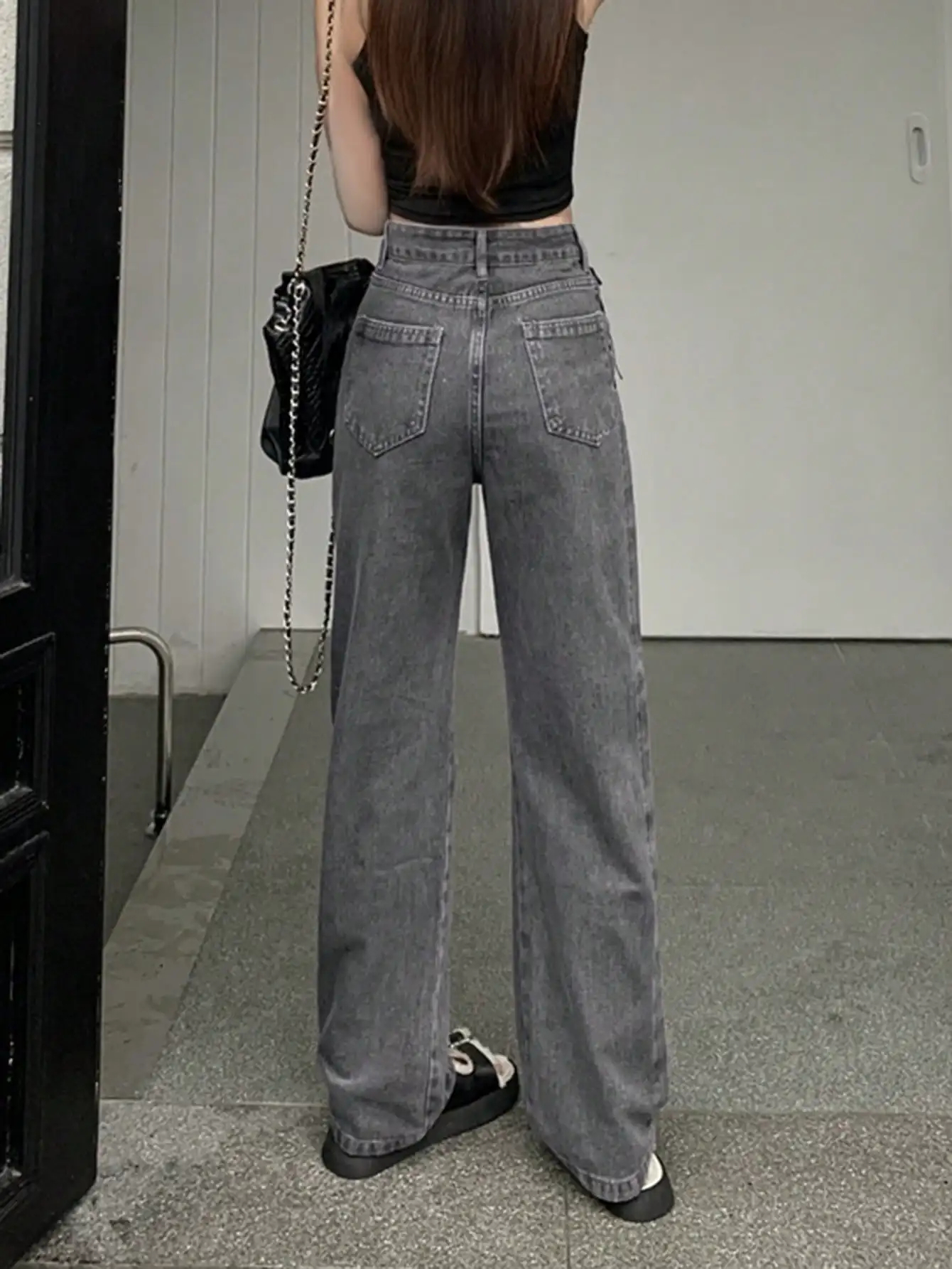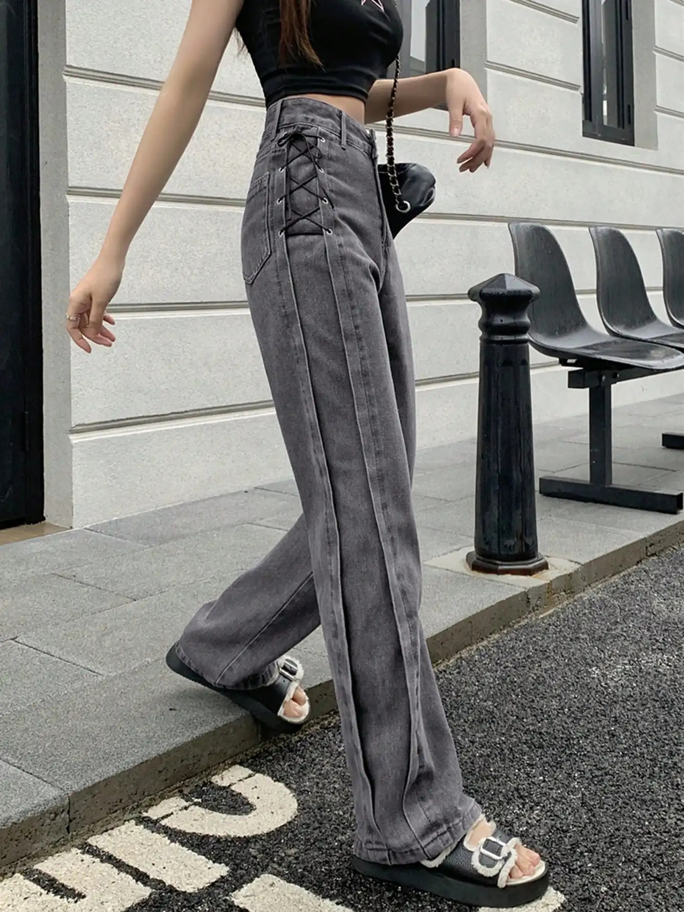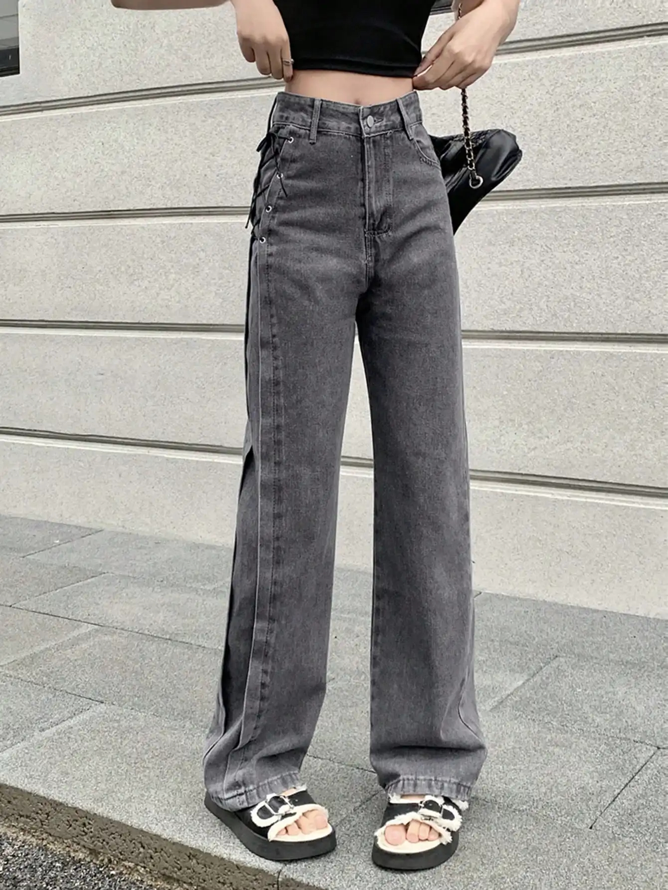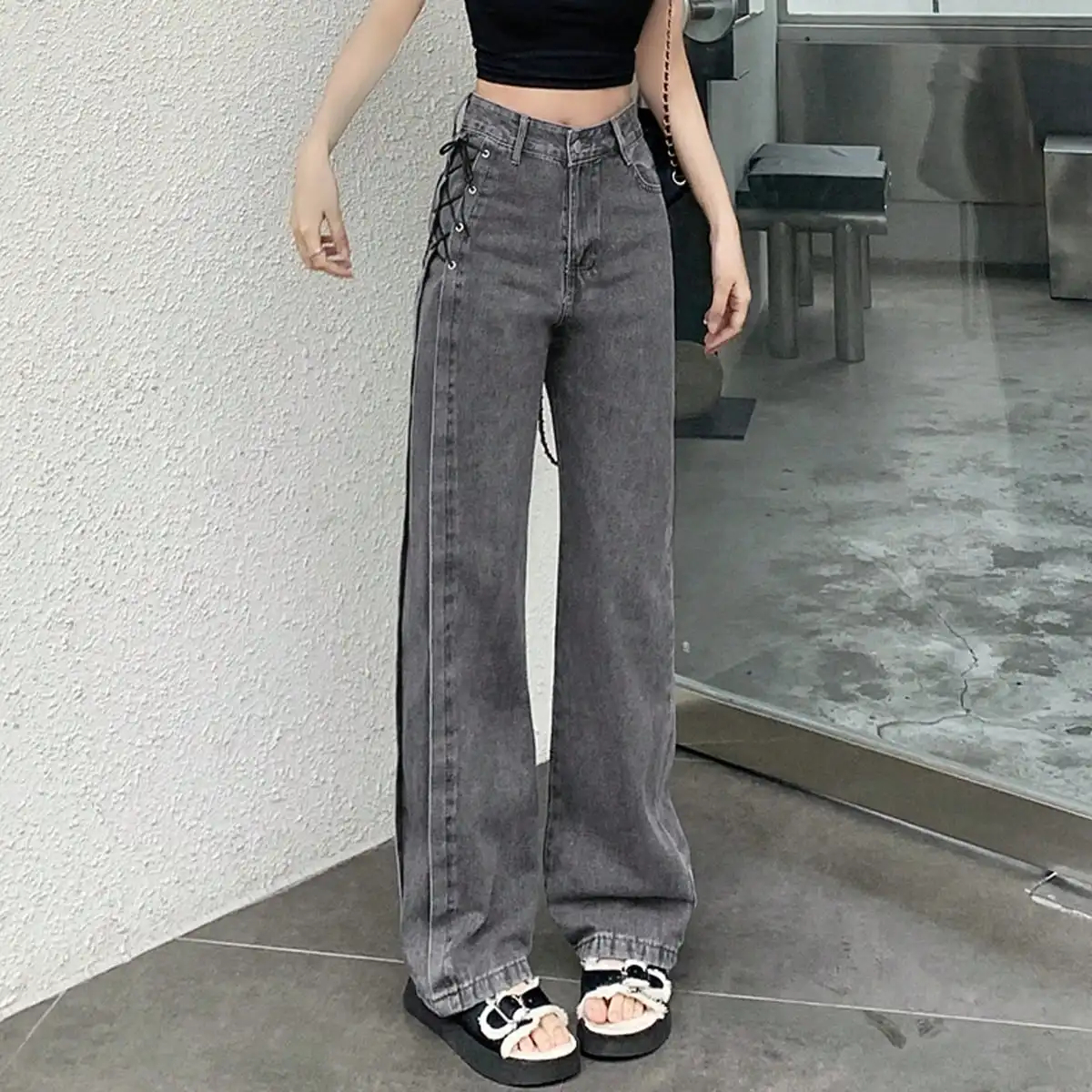 Gray Side Lace up Streetwear Oversized Wide Leg Jeans High Waist Straight Baggy Denim Pants for Women Ladies