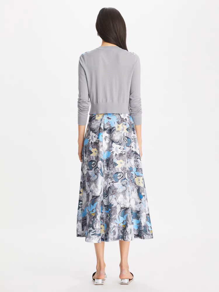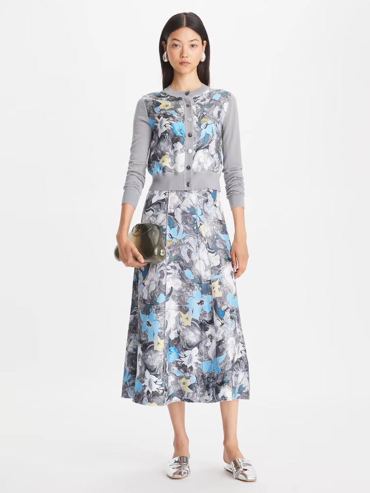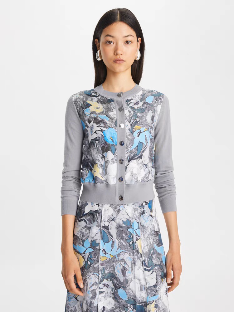This cardigan is a brilliant fusion of art and knit craftsmanship. It features grey knitted sleeves paired with an artistic floral print panel on the front, a crew neckline, and multi-tonal buttons. The short silhouette accentuates the waist, while the floral print in shades of blue, yellow, and grey delivers an abstract artistic vibe, infusing everyday outfits with distinctive design flair. It’s perfect for those who seek a balance of personality and elegance.