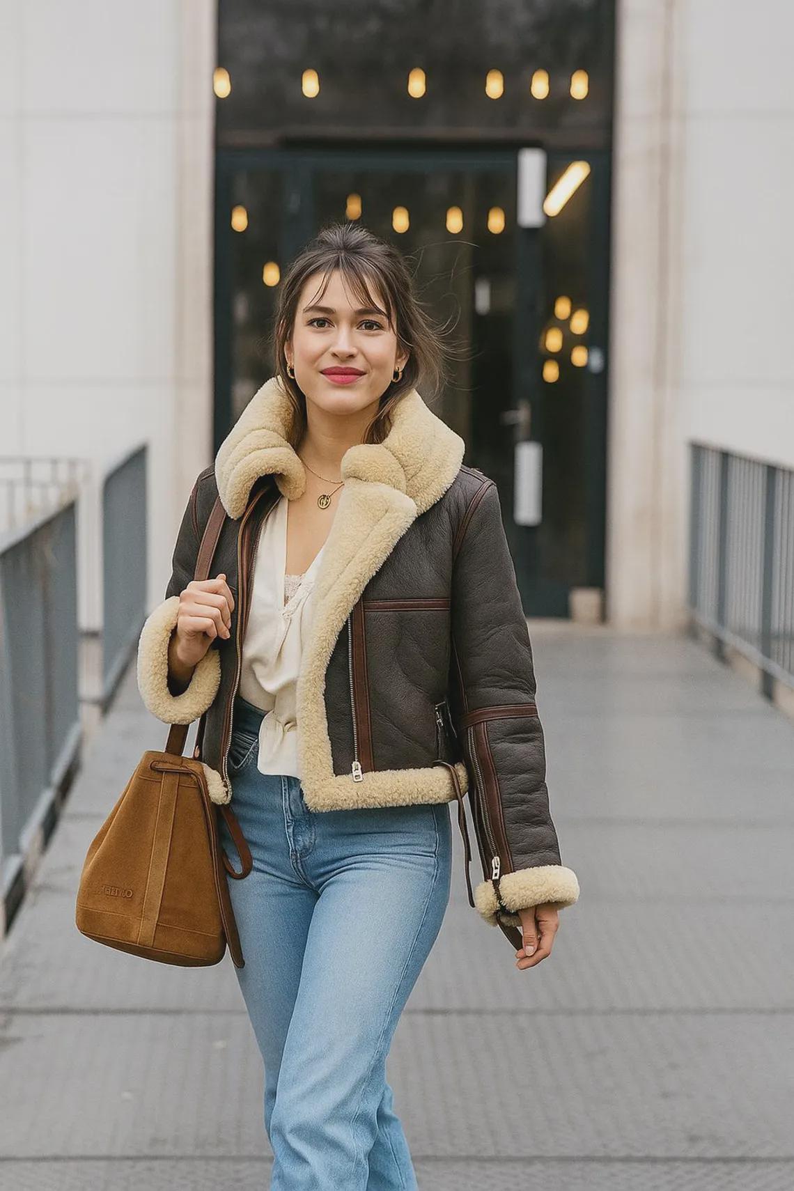 Description: This women’s shearling-lined jacket is a versatile staple for cool-weather wardrobes, blending cozy warmth with edgy style. Made from premium leather and plush shearling, it offers an indulgent feel that keeps you comfortable in low temperatures. The oversized shearling collar, cropped silhouette, and functional details make it suitable for both casual and semi-formal settings. Pair it with your favorite bottoms and accessories to craft a chic, season-ready outfit—stay cozy, confident, and effortlessly fashionable all autumn and winter long.