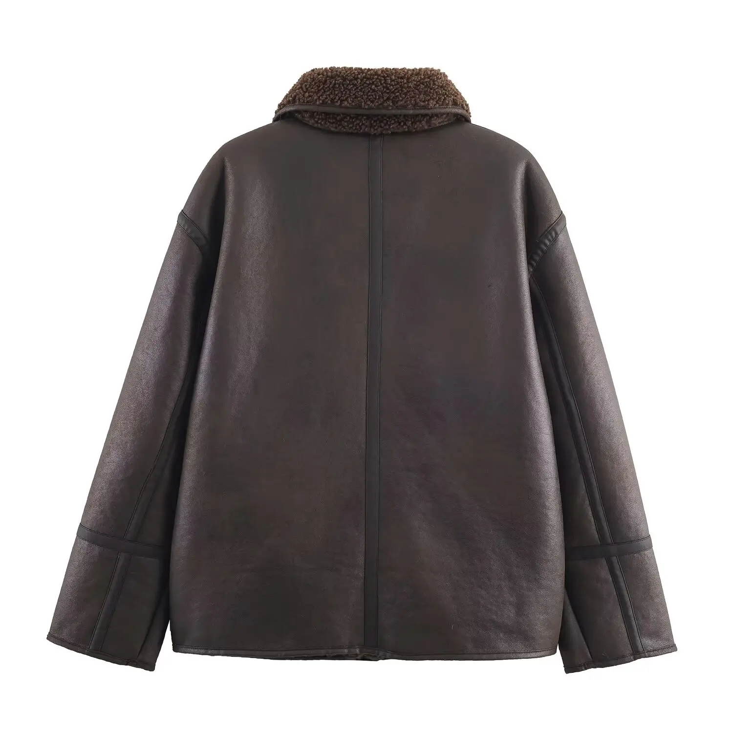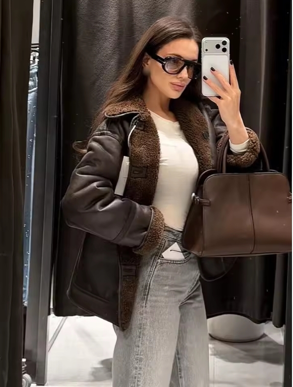 Description: This women’s long-sleeved jacket is a versatile and stylish addition to your wardrobe. Made from warm and luxurious faux leather and shearling-like fabric, it keeps you cozy in cold seasons. The classic aviator style adds a vintage-inspired, edgy touch, making it a standout piece. The relaxed fit is comfortable and figure-friendly, suitable for daily wear, casual outings, or fashion-forward events. Pair it with jeans, leather pants, or dresses and accessorize as you like to create chic looks for various occasions. Stay warm and fashionable with this trendy jacket.