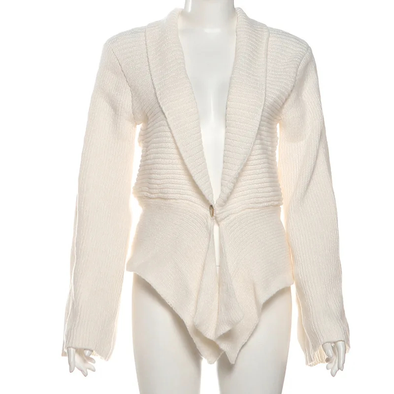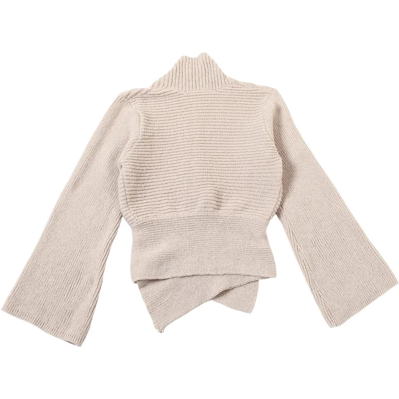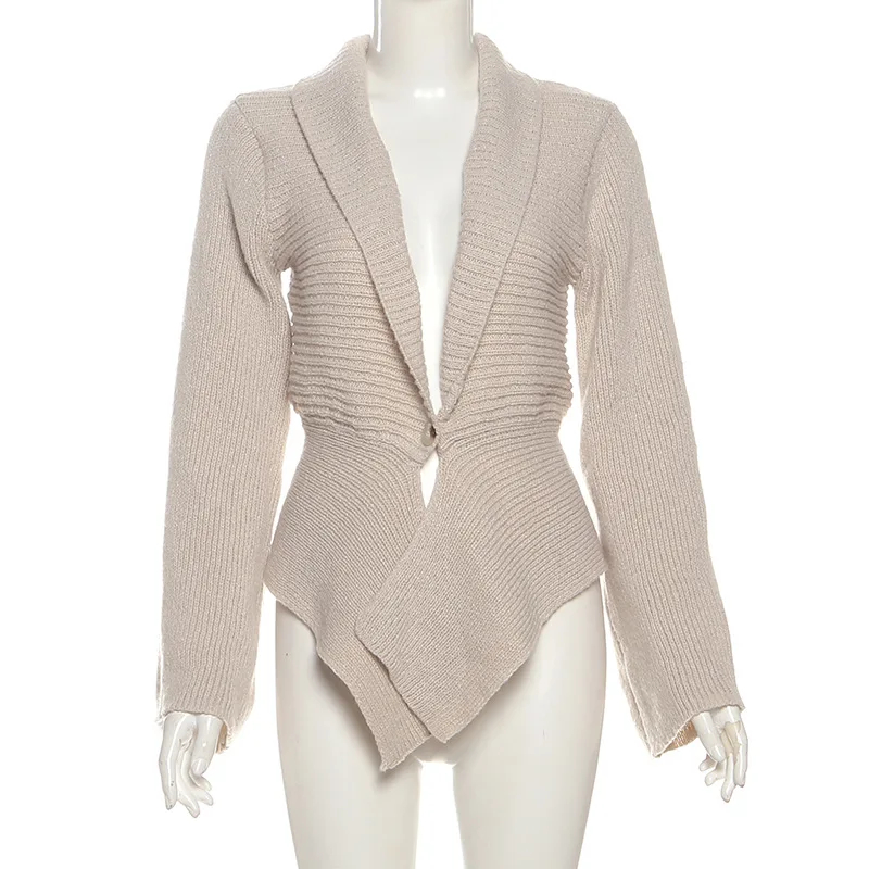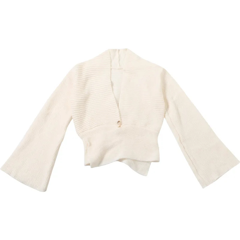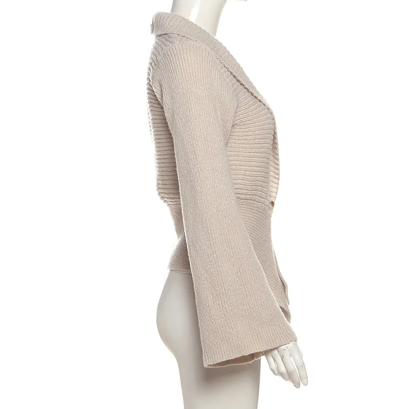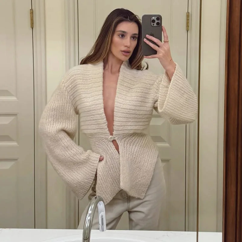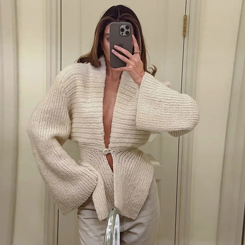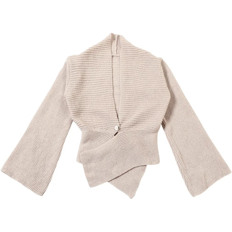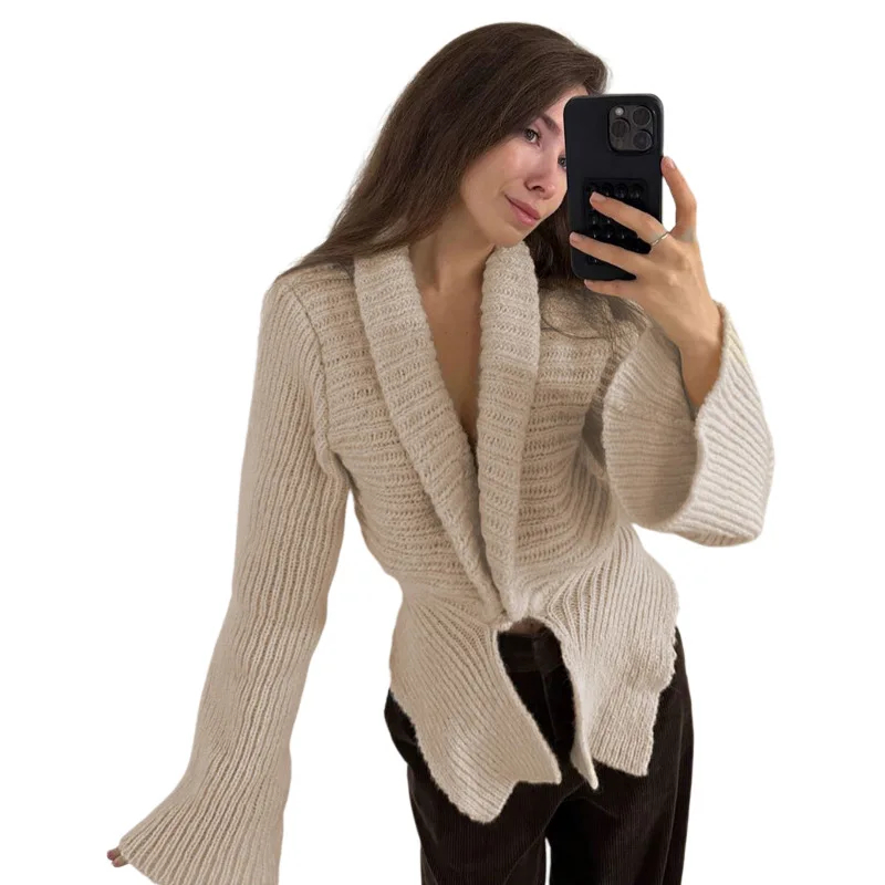 独特的披肩领与喇叭袖设计:这款开衫以时尚的披肩领和喇叭袖为特色,为你的造型增添个性化且时尚的元素,轻松融合休闲与时尚元素。